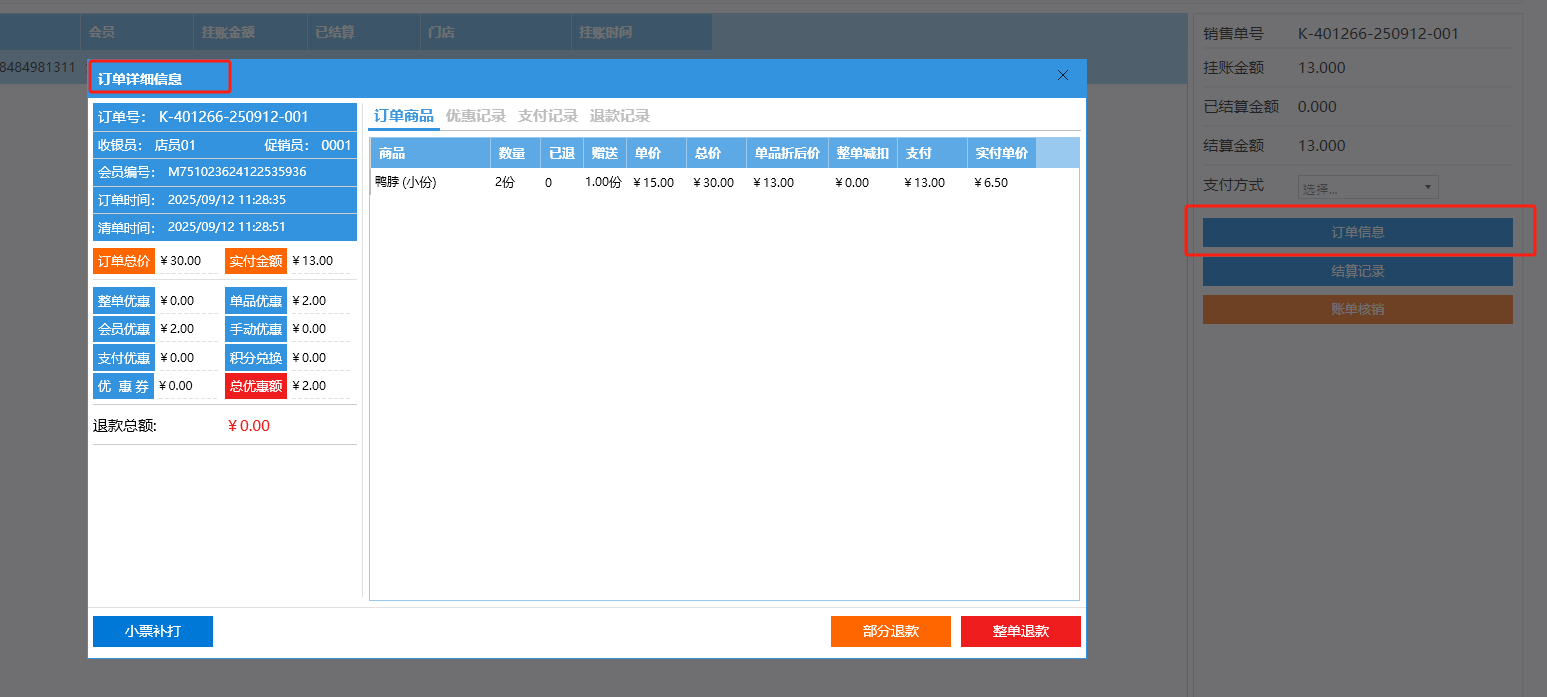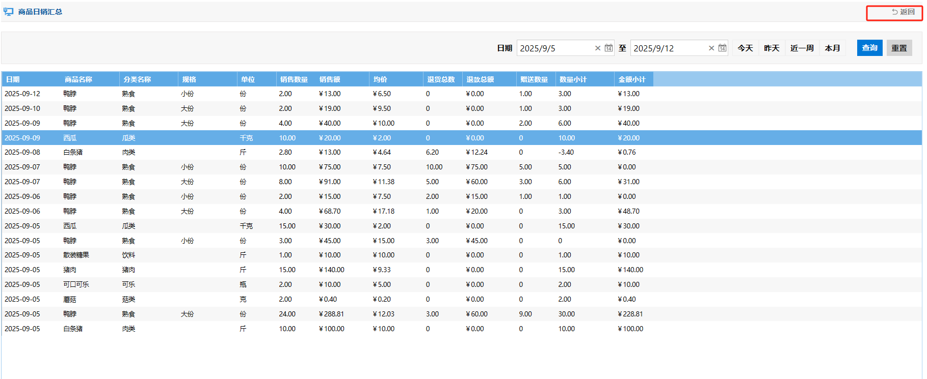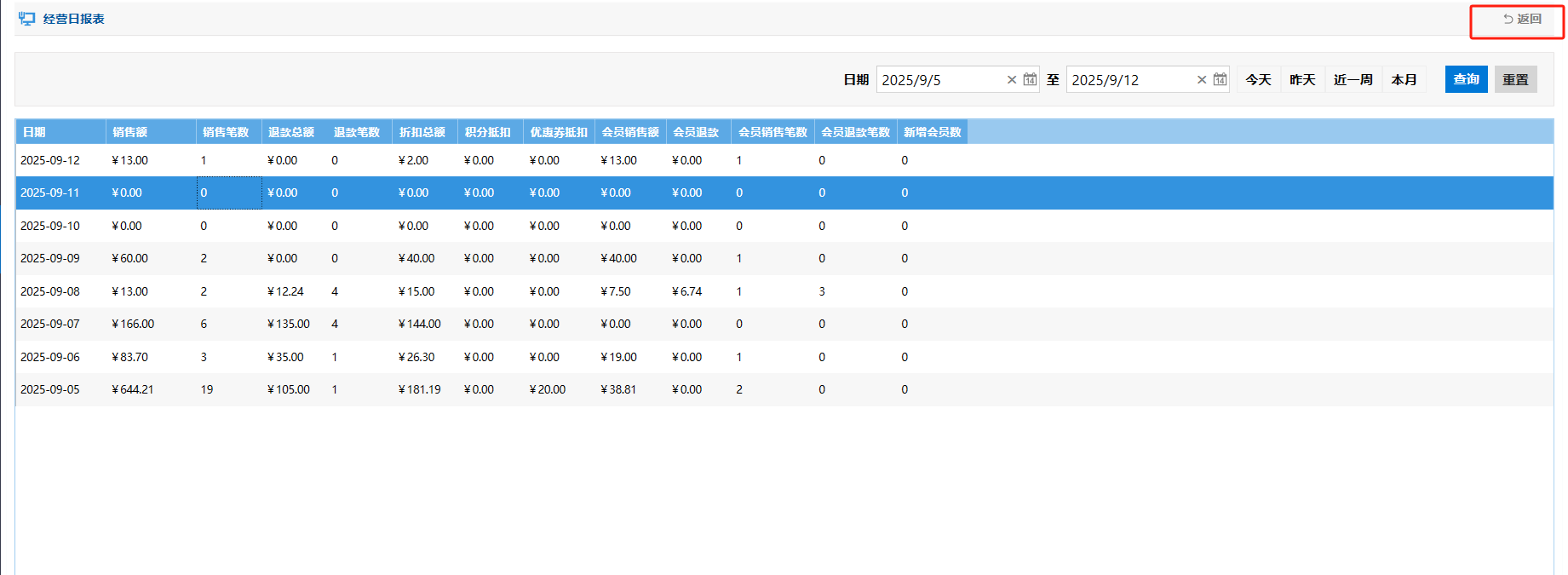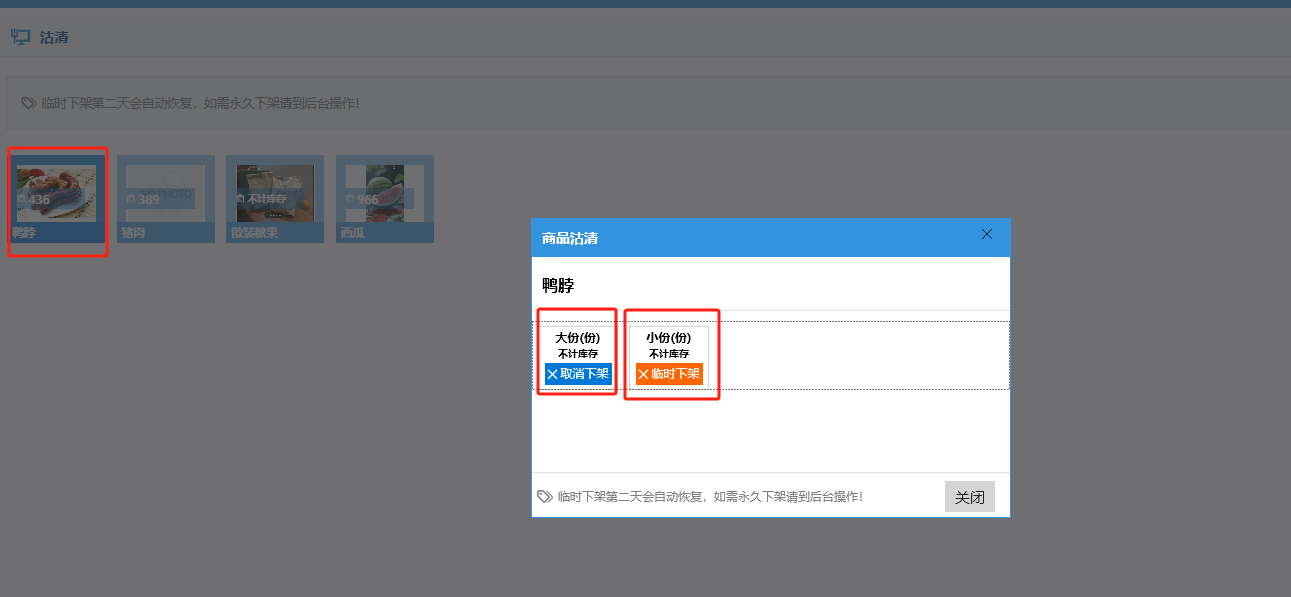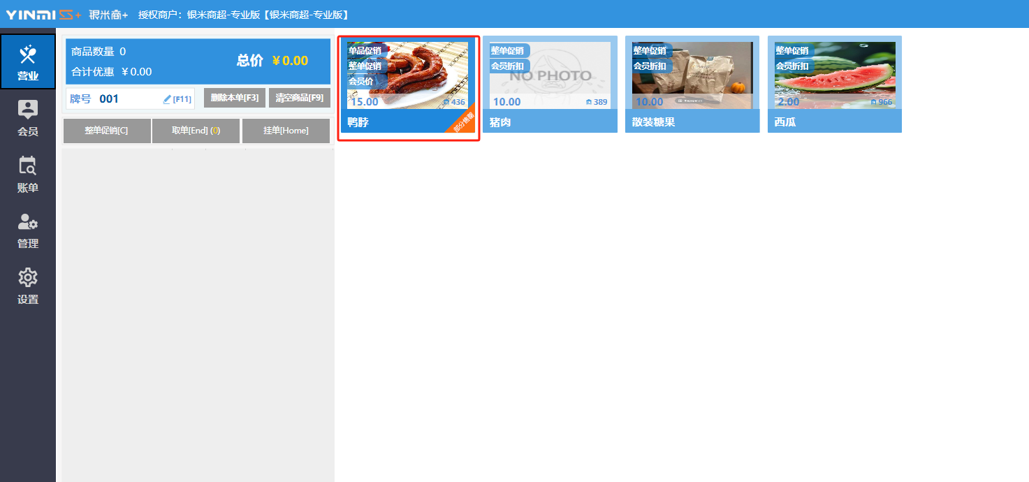 **管理** “管理”是营业交接、报表分析与商品状态管理。营业包含:沽清、挂帐单、交班;报表包含:营业汇总、商品日销汇总、商品销售排行。 如图所示  一、沽清 “沽清”是手动将某商品在系统中的库存数量直接设置为零,标记为“已售罄”状态。点击“沽清”进入页面,操作完成点击“返回”,回到管理页面。**注意:沽清为临时下架,第二天会自动恢复上架**。 如图所示  1、商品查询是通过输入商品条码、名称、拼音码,快速检索商品。如图所示  2、商品上下架 商品需要沽清,点击该商品,点击“临时下架“即可完成,商品营业页面该商品显示”部分售罄“;如需要恢复商品上架,点击”取消下架“即可,商品恢复正常售卖。 如图所示   二、挂帐单 挂账单是允许被授权的会员在额度范围内消费时不当场支付,而是由系统记录欠款金额,之后在规定账期内统一结算。点击”挂账单"进入页面,完成后点击“返回”即可回到管理页面。 如图所示  1、挂账单查询 挂账单查询是通过输入挂账日期、会员手机号或者卡号,快速检索挂帐单。 如图所示  2、挂账单详情 挂帐单详情可以查看销售单号、支付单号、会员、挂账金额、已结算、门店、挂账时间。 如图所示  3、挂帐单核销 A、挂帐单核销是把会员的挂帐单,进行支付然后核销。双击“销售单号”,右侧会出现挂账单的详情包含:销售单号、挂账金额、已结算金额、结算金额、支付方式、订单信息、结算记录、账单核销。 如图所示  B、点击“订单信息”,会弹出订单详情信息。如图所示  C、点击“结算记录”,会显示结算时间、结算金额、结算用户。如图所示  D、选择支付方式,点击“账单核销”即可完成挂账单的核销。如图所示 三、交班 “交班”是收银系统中结束当前操作员的工作时段,并完成财务清点和工作交接的流程。点击“交班”即可弹出交班详情页面,包含:店员、当班时间段、销售汇总、会员充值、总收款、总找零、总退款、实收款、金额核查。 如图所示  接班金额是上次接班预留的现金,预留现金是下次接班的现金,上交现金是当班过程上缴的现金;点击“打印小票”即可打印当班时所有订单小票;如确认无误点击“交班退出”即可结束当班,有疑问点击“继续收银”即可继续当班。 如图所示  四、营业汇总 “营业汇总”是收银系统对一天所有经营数据进行全面统计和总结的报表。点击“营业汇总”即可进入页面,点击“返回”即可回到管理页面。 如图所示  1、营业汇总查询是输入时间段或选择今天,昨天,近一周、本月。点击查询即可。如图所示  2、营业汇总详情包含:日期、销售额、销售笔数、退款总额、退款笔数、折扣总额、积分抵扣、优惠劵抵扣、会员销售额、会员退款、会员销售笔数、会员退款笔数、新增会员数。 如图所示  五、商品日销汇总 “商品日销汇总”是一项专门针对商品销售情况进行每日统计的数据报表。点击“商品日销汇总”即可进入页面,点击“返回”即可回到管理页面。  1、商品日销汇总查询是输入时间段或选择今天,昨天,近一周、本月。点击查询即可。如图所示  2、商品日销汇总详情包含:日期、商品名称、商品分类 、规格、单位、销售数量、销售额、均价、退货总数、退款总额、赠送数量、数量小计、金额小计。 如图所示  六、商品销售排行 “商品销售排行”是对商品销售表现进行自动排序的报表。点击“商品销售排行 ”即可进入页面,点击“返回”即可回到管理页面。 如图所示  1、商品销售排行查询是输入时间段或选择今天,昨天,近一周、本月。点击查询即可。如图所示  2、商品销售排行详情包含:排序、商品名称、规格、单位、销售数量、销售金额、退款总金额。 如图所示