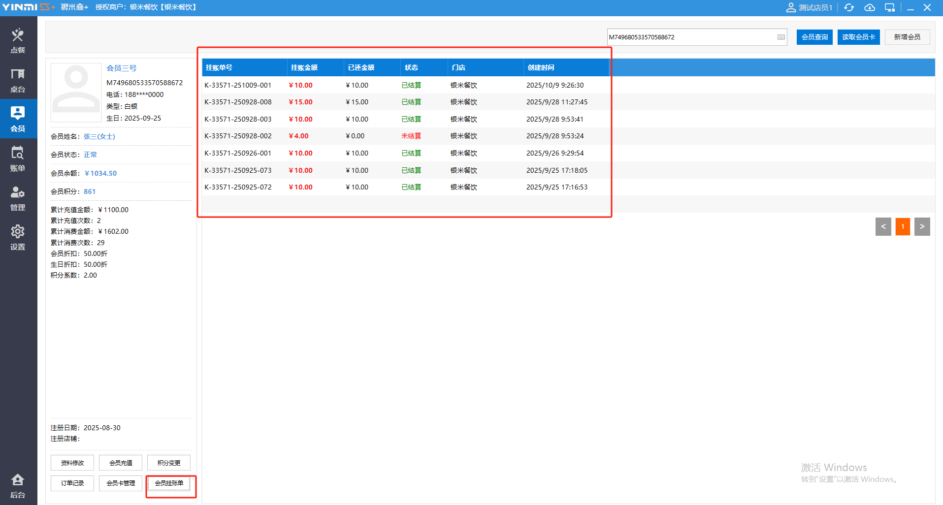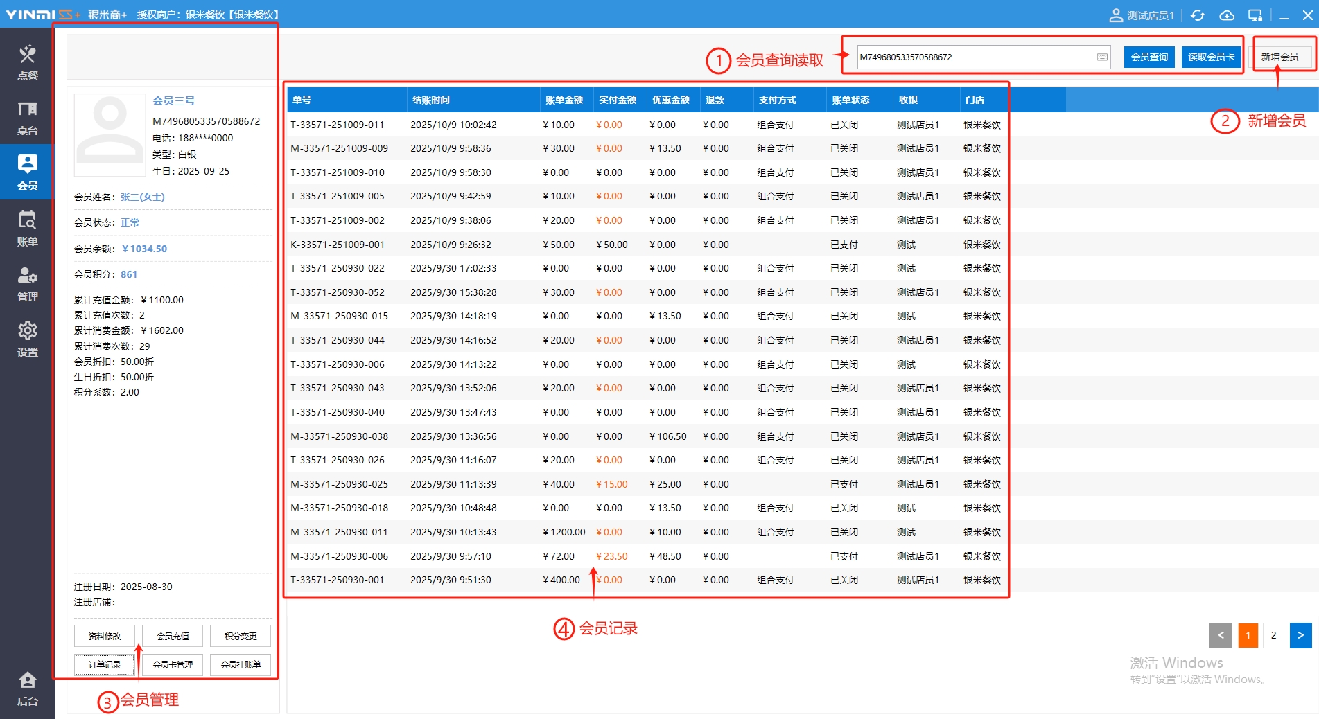 **会员** 会员界面是通过收银员操作,管理会员信息的体系,包含查询读取会员信息、新增会员、会员管理、会员记录。 如图所示 ![](http://adm.yinminet.com/uploads/20251009/74edf218431b5790d3d17fa8c6e721f4.jpg) 一、会员查询读取 会员查询读取是为了快速识别会员身份并调取账户信息,为实现会员权益和精准服务提供即时数据支持,包含:会员查询、读取会员卡。 1、会员查询 会员查询是通过手机号、姓名、卡号等关键词快速搜索会员。如图所示 ![](http://adm.yinminet.com/uploads/20250914/c6196918c318f055c13fad41b690e72f.png) 2、读取会员卡 读取会员卡是通过刷卡(磁条/IC芯片)、扫码(会员二维码/条形码)等方式快速识别会员。如图所示 ![](http://adm.yinminet.com/uploads/20250910/493bcbf7ba01d583b524e297c0f6d79b.png) 二、新增会员 新增会员是快速将顾客转化为系统可识别的会员,建立会员档案,录入手机号(必填),昵称、姓名、性别、生日、地址等(选填)。点击确认添加会员,然后确认即可完成。如图所示 ![](http://adm.yinminet.com/uploads/20250910/a9766394b8f35871674b58f99a2dee20.png) 三、会员管理 会员管理是展示会员档案(姓名、电话、卡号、类型、生日等),支持查询、修改。包含:资料修改、会员充值、积分变更、订单记录、会员卡管理、会员挂帐单。 如图所示 ![](http://adm.yinminet.com/uploads/20251009/ffd215cfee57d3233a55065a8fd16b12.png) 1、资料修改 资料修改是修改会员的昵称、姓名、手机号、生日等核心身份信息。点击“修改资料”,修改右侧的相关内容,点击确认修改即可。如需更换手机号,点击更换手机号码确认即可;如需要重置密码,点击重置密码,点击确认即可完成。 如图所示 ![](http://adm.yinminet.com/uploads/20251009/601ed41179cbecc30267b25677df8209.png) ![](http://adm.yinminet.com/uploads/20250910/acc0bedd4efa63db746ec193f177f1a2.png)![](http://adm.yinminet.com/uploads/20250910/99898c532b3a2d27f895aedcc142cec8.png) 2、会员充值 会员充值是通过自定义金额和赠送优惠,给会员账号充值或充值退款。包含:会员充值、充值退款。 A、会员充值是输入充值金额、赠送金额、选择支付方式、选择促销员、备注等,点击确认充值即可完。 如图所示 ![](http://adm.yinminet.com/uploads/20251009/3fe87c54cce45fcfa59fd5c73aa94b4c.png) B、充值退款 充值退款是根据会员的余额,部分或者全部退还会员余额的金额。输入退款金额、选择支付方式、备注,点击确认退款 即可完成。如图所示 ![](http://adm.yinminet.com/uploads/20250910/991a446e38e209924d8aaf9515014b43.png) 3、积分变更 积分变更是通过自定义给会员账号赠送或扣减积分。点击“积分变更”、选择赠送或扣减,输入变更数量,备注原因,点击确认积分变更即可完成。 如图所示 ![](http://adm.yinminet.com/uploads/20251009/fe680424f1ae8c66f769303405c5c9aa.png) 4、订单记录 交易记录是会员的账号消费记录数据,便于查看明细。包含 :单号、结账时间、账单金额、实付金额、活动优惠、会员优惠、支付方式、账单状态、收银、门店。 如图所示 ![](http://adm.yinminet.com/uploads/20251009/a51965f8675ad25e1b16b5c5c6a915f0.png) 5、会员卡管理 会员卡管理是对会员卡的发行、使用和状态进行全面管控。点击“会员卡管理”,备注原因,选择读卡(读取会员卡) 、写卡(修改会员卡)、抹卡(注销会员卡)、取消操作。 如图所示 ![](http://adm.yinminet.com/uploads/20251010/a857d2605b0db2684b7775b0dfd8bec4.png) 6、会员挂账单 会员挂帐单是会员的挂帐单消费记录数据,便于查看明细。包含 :挂账单号、挂账金额、已还金额、状态、门店、创建时间。 ![](http://adm.yinminet.com/uploads/20251010/9b5317de932018e8138914d628e76e4b.png) 四、会员记录 会员记录是会员消费的明细账单展示区。包含:订单记录和挂账单记录。 ![](http://adm.yinminet.com/uploads/20251010/0567d360898d25acfcc588aa363db2f6.png)