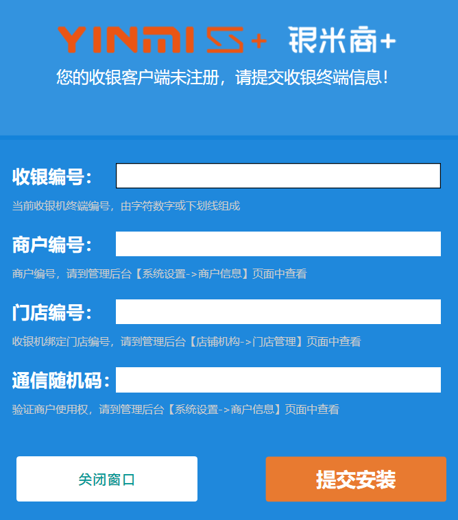 初次下载使用PC客户端需要绑定商户信息,界面如下图: |  | | :------------------------------------------------------------------------------- | 1、收银编号:当前收银终端的唯一编号 例如:10008 2、商户编号:当前商户在系统中唯一编号,请到商户后台或者【银管家】APP、小程序查看 3、门店编号:当前门店唯一编号,请到商户后台或者【银管家】APP、小程序查看 4、通信随机码:绑定终端鉴权码,系统没间隔一段时间自动更新,请到商户后台或者【银管家】APP、小程序查看 点击提交后,如果绑定成功,系统会自动进入登录界面。
