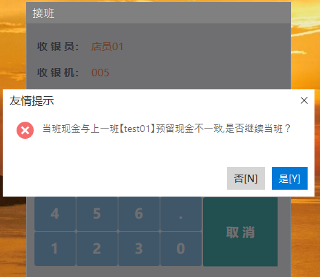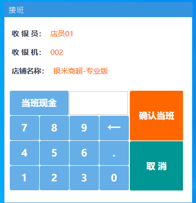 以下为登录收银系统后“接班”操作流程:  1. **收银员**:显示当前登录的操作员账号(示例:`店员01`)。 2. **收银机**:显示当前操作的收银机编号(示例:`002`)。 3. **店铺信息**:确认所属门店名称(示例:银米商超-专业版) 4. 接班流程1:输入“当班现金”金额的数字和上次“接班金额”相符,点击”确认当班“即正式接班,如不接班点击”取消“; 5. 接班流程2:输入“当班现金”金额的数字和上次“接班金额”不符,界面提示预留现金不一致,是否继续当班,点击”是【Y】“即正式接班,如不接班点击”否【N】“; 6. 如下图所示: 7.