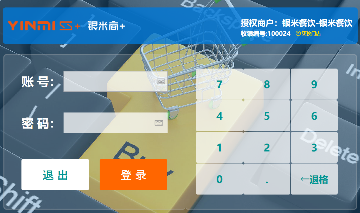 PC客户端登录收银界面,界面如下:  1.在“收银账号”输入框中输入收银员账号 例如:test001 2.在"收银密码"输入框中输入对应密码(例如:123456) 3.点击"登录"按钮进入系统,或点击"退出"按钮退出程序