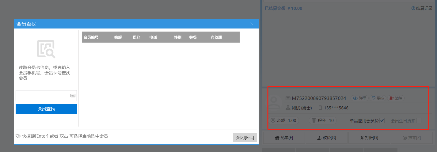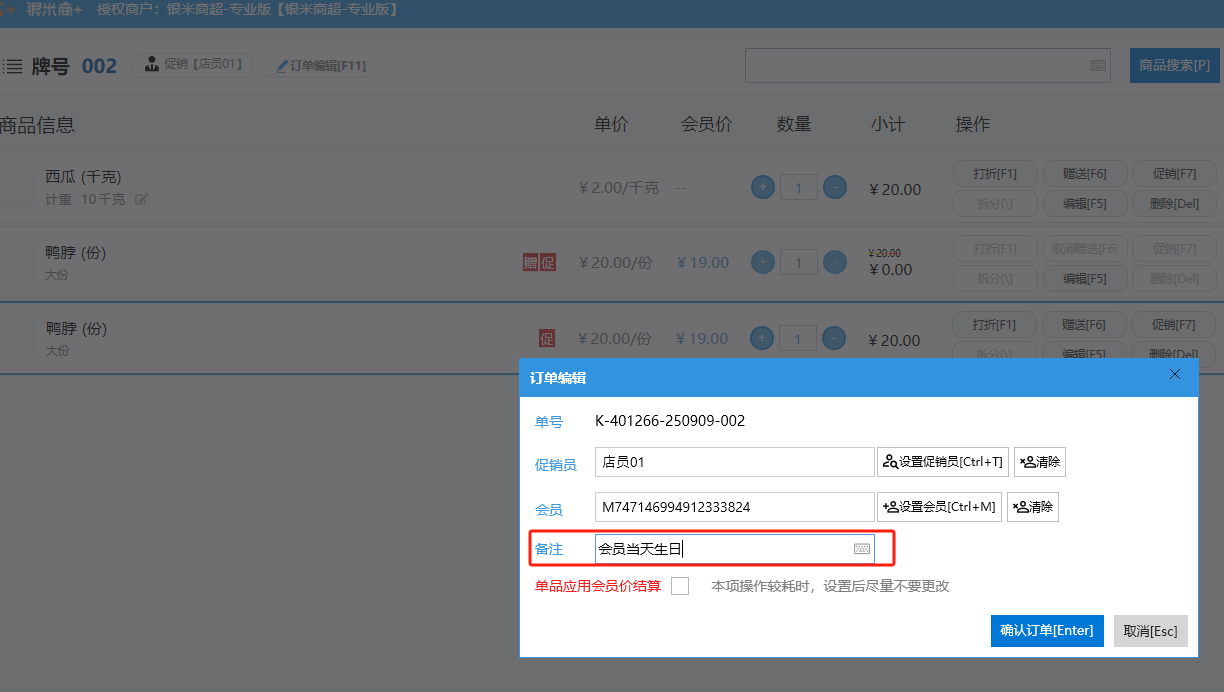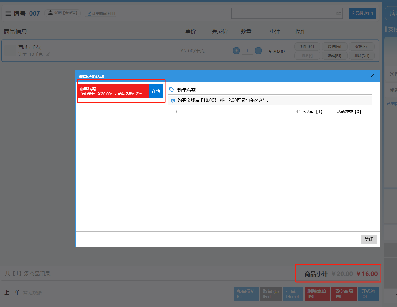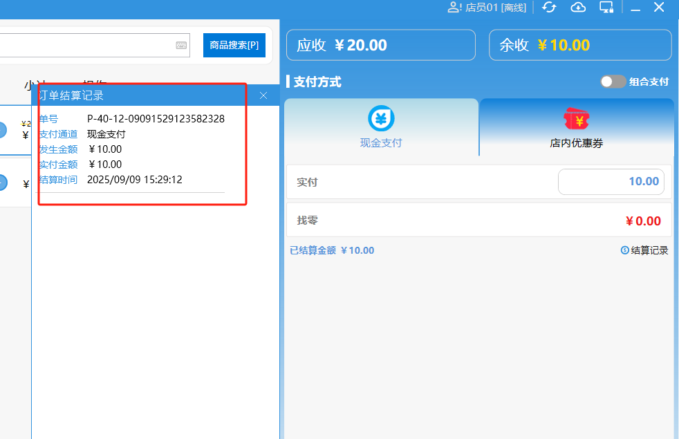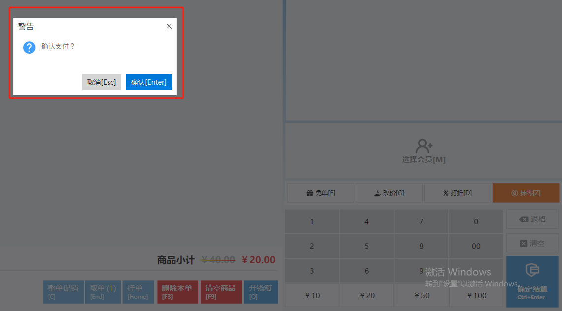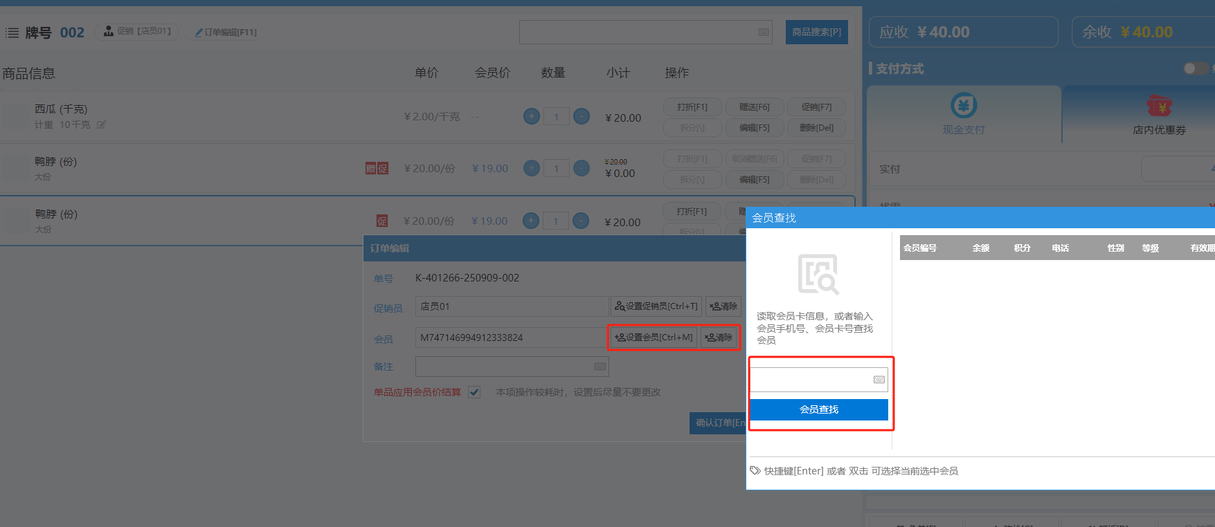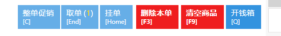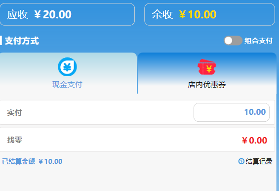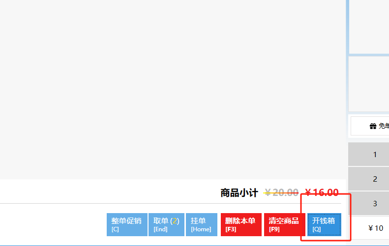 **扫码模式** 扫码模式是用扫码枪快速、准确地识别商品条码或支付码,极大提升收银效率,减少人工输入错误。包含有:购物车、结算栏、常用功能。 如图所示  1、购物车 购物车是临时承载和管理顾客当前所选的所有商品,作为结算前的核心操作界面,是完成交易的“中转站”。包括:订单编辑、商品搜索、商品信息、商品小计。 A:订单编辑 订单编辑是在订单完成结算前,对促销员信息、会员信息的修改和调整,确保最终订单的准确性。点击”订单编辑“中”设置促销员“选择促销员点击确认即可;如需更换,再次点击”设置促销员“选择新促销员点击确认即可完成更换;如无需促销员信息 。点击消除即可消除促销员信息。 如图所示  点击”设置会员“,出现会员搜索页面,通过读取会员卡新年,或者输入会员手机号,会员卡信息点击会员搜索即可出现会员信息,双击会员信息即可完成设置;如需更换,再次点击”设置会员“选择新会员点击确认即可完成更换;如无需会员信息 。点击消除即可消除会员信息。 如图所示  点击”备注“,即可输入订单的相关备注信息。 如图所示  单品应用会员价结算是为特定会员群体提供专属的单品优惠价格,实现精准营销,提升会员忠诚度和复购率。如需要使用,点击方框打”✔“,无需要则不打。点击确认订单即可完成所有设置。 如图所示  B、商品搜索 商品搜索是为了快速定位并找到目标商品,将其添加到订单中,极大提升收银效率,尤其是在无法扫码或记不清条码时。点击搜索商品,商品页面会跟随弹出,选择相关商品即可;可以添加临时商品,和收银操作添加临时商品相同。 如图所示  C、商品小计 商品小计是实时计算并显示当前已添加所有商品的累计总金额,让顾客和收银员在结算前对消费金额有一个清晰的预期。 如图所示  2、结算栏 结算栏是作为收银流程的最终确认和付款执行界面,完成从商品清单到资金收讫的最终转换。包含有:支付方式、选择会员 、人工折扣、辅助键盘,确定结算。 A、支付方式 支付方式是顾客提供多样化的付款选择,并准确、安全地完成资金接收**,**是交易流程的最终环节。包含:现金支付,微信支付,余额支付,优惠劵支付等多种付款方式,并可以选择2种或者多种的组合支付方式。 如图所示  结算记录可以查看完成部分支付的订单详情,点击”结算记录“即可查看。 如图所示  B、选择会员 选择会员是通过读取会员卡新年,或者输入会员手机号,会员卡信息点击会员搜索即可出现会员信息,双击会员信息即可完成设置;会员可查看会员详情,显示余额、积分,选择是否使用单品会员价、会员生日折扣价;如需更换会员信息,点击”更换“即可重新查找会员信息;如无需使用会员点击”清除“即可。 如图所示  C、人工折扣 人工折扣是授予经过授权的收银员(如店员01)一种灵活的权力,使其能够根据实际情况,临时为顾客提供额外的价格优惠。包含:免单、改价、打折、抹零。注意:多种折扣形式只能选择其中一种,不能采用2种以及多种的形式进行人工折扣。 免单是免除顾客该订单的所有金额。如图所示  改价是收银员输入该订单的应付金额,改价金额不能超过该订单的小计金额。如图所示  打折是收银员对该订单进行打折,折扣金额最低1折到最高99折。如图所示  抹零是收银员免除订单总额中的小额零头(通常是角、分)。如图所示  D、辅助键盘 辅助键盘作为数字的集合,将高频操作一键化,极大提升收银速度和操作效率。如图所示  E、确定结算 确定结算是作为收银流程的“最终确认键”,正式完成订单计算并进入付款环节。确认支付点击”确认“,不确认支付点击”取消“。如图所示  3、常用功能 常用功能是为收银员快捷处理商品订单而服务的常用功能汇总。包含有:整单促销、取单 、挂单、删除本单,清空商品、开钱箱。如图所示  A、整单促销 整单促销是通过设置基于订单总金额或条件的优惠规则,包含:满减、满赠 、满量。点击整单促销选择商品能参与的促销活动,点击即可参加。如图所示  B、取单 取单是快速恢复之前暂时保存的未付款订单,继续进行处理和结算,保证销售流程不中断。点击取单,选择未支付或部分支付的订单,点击确认订单即可。如图所示  C、挂单 挂单是暂停当前未完成的订单,临时保存起来,以便先处理其他更紧急的事务,之后可快速恢复继续操作。点击挂单,确认挂单点击”确认“即可,不挂单点击”取消“即可。如图所示  D、删除本单 删除本单是为了彻底取消并删除当前正在操作的未结算订单,通常用于作废无效或错误的交易。点击删除本单,确认删除点击”确认“即可,不删除点击”取消“即可。如图所示  E、清空商品 清空商品是一键移除当前购物车内的所有商品,为一笔新订单做准备。点击清空商品,确认清空点击”确认“即可,不清空点击”取消“即可。如图所示  F、开钱箱 开钱箱是通过按钮指令自动触发物理钱箱弹开,以便进行现金收款和找零操作。点击”开钱箱“,即可弹出钱箱。如图所示