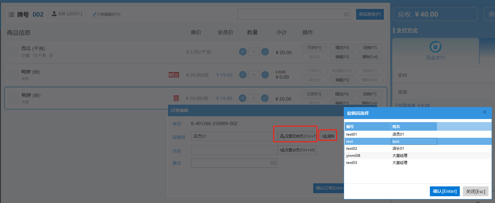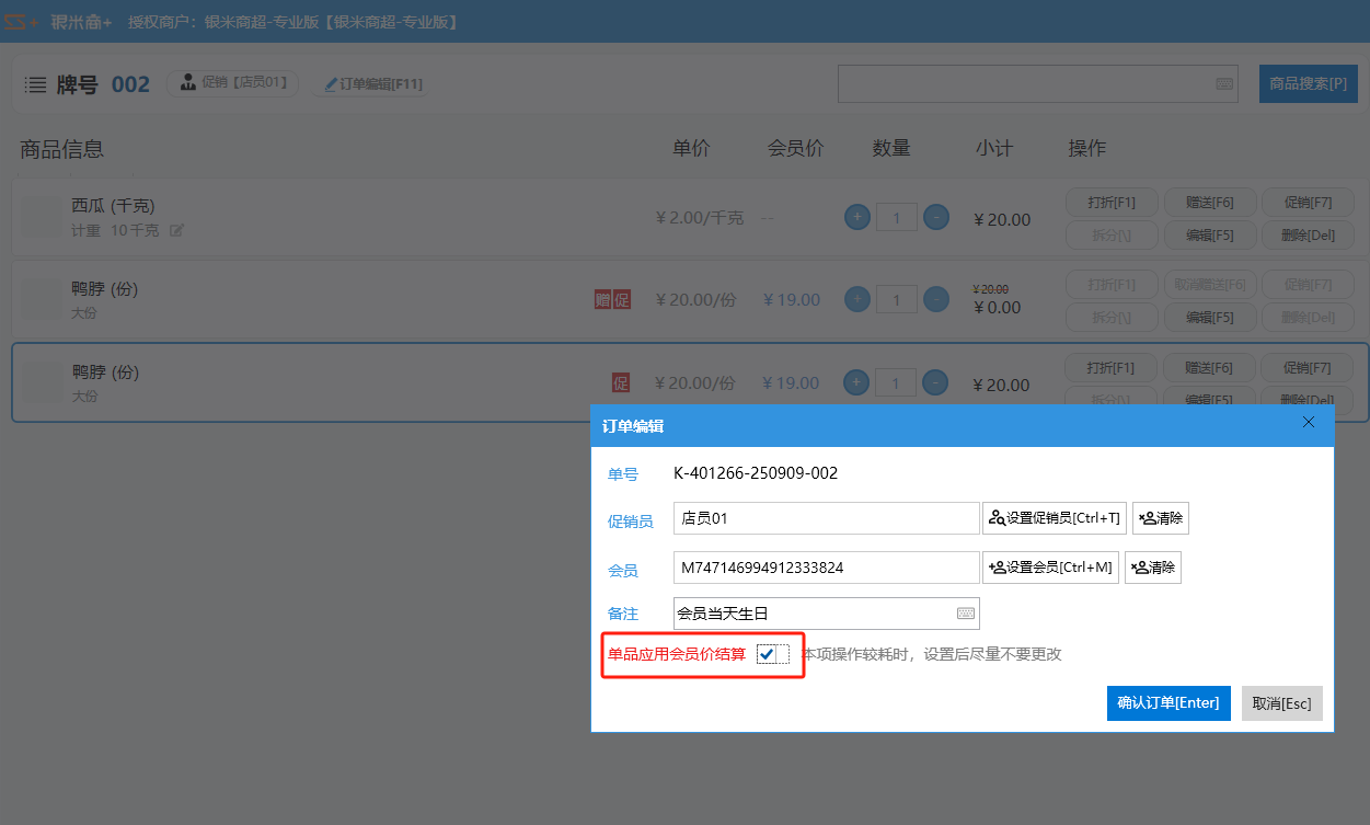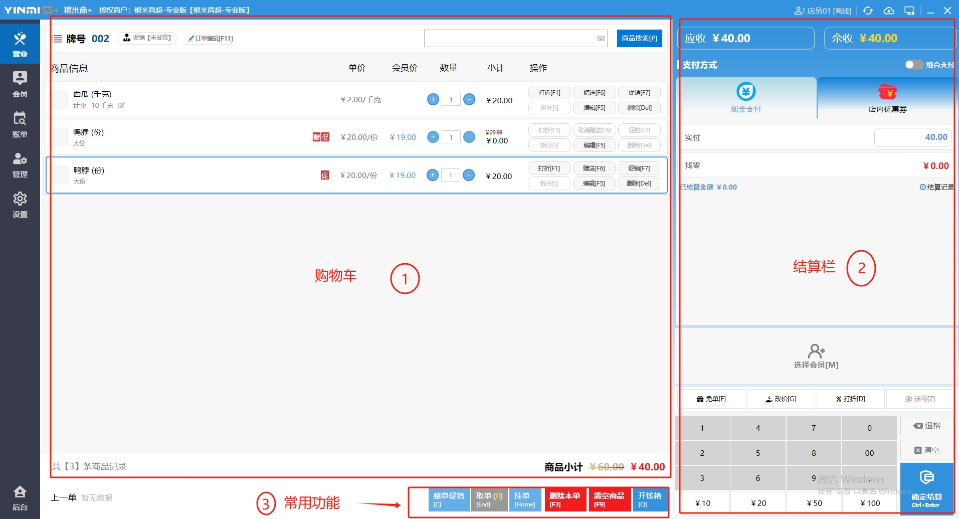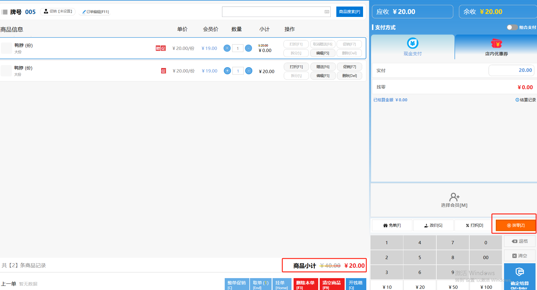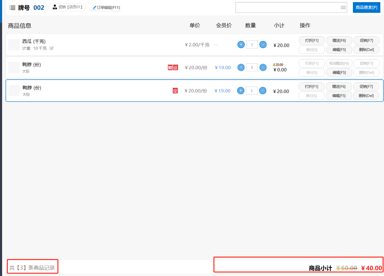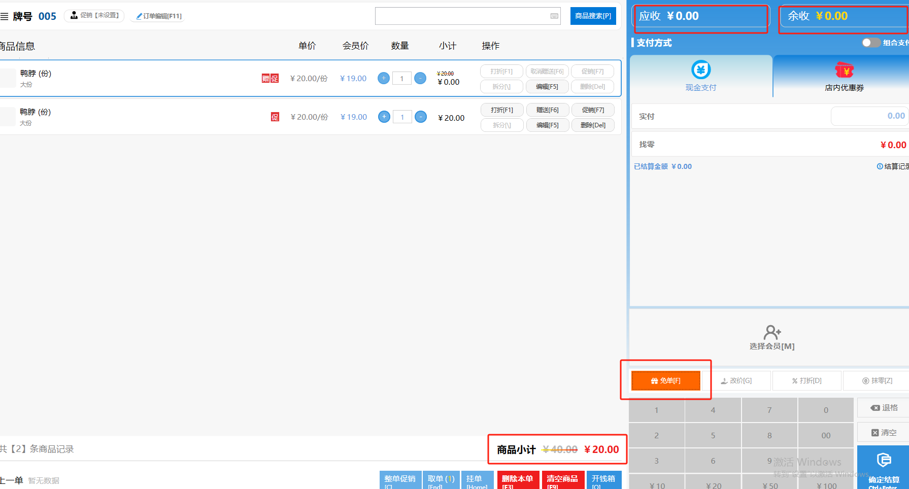 **扫码模式** 扫码模式是用扫码枪快速、准确地识别商品条码或支付码,极大提升收银效率,减少人工输入错误。包含有:购物车、结算栏、常用功能。 如图所示  1、购物车 购物车是临时承载和管理顾客当前所选的所有商品,作为结算前的核心操作界面,是完成交易的“中转站”。包括:订单编辑、商品搜索、商品信息、商品小计。 A:订单编辑 订单编辑是在订单完成结算前,对促销员信息、会员信息的修改和调整,确保最终订单的准确性。点击”订单编辑“中”设置促销员“选择促销员点击确认即可;如需更换,再次点击”设置促销员“选择新促销员点击确认即可完成更换;如无需促销员信息 。点击消除即可消除促销员信息。 如图所示  点击”设置会员“,出现会员搜索页面,通过读取会员卡新年,或者输入会员手机号,会员卡信息点击会员搜索即可出现会员信息,双击会员信息即可完成设置;如需更换,再次点击”设置会员“选择新会员点击确认即可完成更换;如无需会员信息 。点击消除即可消除会员信息。 如图所示  点击”备注“,即可输入订单的相关备注信息。 如图所示  单品应用会员价结算是为特定会员群体提供专属的单品优惠价格,实现精准营销,提升会员忠诚度和复购率。如需要使用,点击方框打”✔“,无需要则不打。点击确认订单即可完成所有设置。 如图所示  B、商品搜索 商品搜索是为了快速定位并找到目标商品,将其添加到订单中,极大提升收银效率,尤其是在无法扫码或记不清条码时。点击搜索商品,商品页面会跟随弹出,选择相关商品即可;可以添加临时商品,和收银操作添加临时商品相同。 如图所示  C、商品小计 商品小计是实时计算并显示当前已添加所有商品的累计总金额,让顾客和收银员在结算前对消费金额有一个清晰的预期。 如图所示  2、结算栏 结算栏是作为收银流程的最终确认和付款执行界面,完成从商品清单到资金收讫的最终转换。包含有:支付方式、选择会员 、人工折扣、辅助键盘,确定结算。 A、支付方式 支付方式是顾客提供多样化的付款选择,并准确、安全地完成资金接收**,**是交易流程的最终环节。包含:现金支付,微信支付,余额支付,优惠劵支付等多种付款方式,并可以选择2种或者多种的组合支付方式。 如图所示  结算记录可以查看完成部分支付的订单详情,点击”结算记录“即可查看。 如图所示  B、选择会员 选择会员是通过读取会员卡新年,或者输入会员手机号,会员卡信息点击会员搜索即可出现会员信息,双击会员信息即可完成设置;会员可查看会员详情,显示余额、积分,选择是否使用单品会员价、会员生日折扣价;如需更换会员信息,点击”更换“即可重新查找会员信息;如无需使用会员点击”清除“即可。 如图所示  C、人工折扣 人工折扣是授予经过授权的收银员(如店员01)一种灵活的权力,使其能够根据实际情况,临时为顾客提供额外的价格优惠。包含:免单、改价、打折、抹零。注意:多种折扣形式只能选择其中一种,不能采用2种以及多种的形式进行人工折扣。 免单是免除顾客该订单的所有金额。如图所示  改价是收银员输入该订单的应付金额,改价金额不能超过该订单的小计金额。如图所示  打折是收银员对该订单进行打折,折扣金额最低1折到最高99折。如图所示  抹零是收银员免除订单总额中的小额零头(通常是角、分)。如图所示  D、辅助键盘 辅助键盘作为数字的集合,将高频操作一键化,极大提升收银速度和操作效率。如图所示  E、确定结算 确定结算是作为收银流程的“最终确认键”,正式完成订单计算并进入付款环节。确认支付点击”确认“,不确认支付点击”取消“。如图所示  3、常用功能 常用功能是为收银员快捷处理商品订单而服务的常用功能汇总。包含有:整单促销、取单 、挂单、删除本单,清空商品、开钱箱。如图所示  A、整单促销 整单促销是通过设置基于订单总金额或条件的优惠规则,包含:满减、满赠 、满量。点击整单促销选择商品能参与的促销活动,点击即可参加。如图所示  B、取单 取单是快速恢复之前暂时保存的未付款订单,继续进行处理和结算,保证销售流程不中断。点击取单,选择未支付或部分支付的订单,点击确认订单即可。如图所示  C、挂单 挂单是暂停当前未完成的订单,临时保存起来,以便先处理其他更紧急的事务,之后可快速恢复继续操作。点击挂单,确认挂单点击”确认“即可,不挂单点击”取消“即可。如图所示  D、删除本单 删除本单是为了彻底取消并删除当前正在操作的未结算订单,通常用于作废无效或错误的交易。点击删除本单,确认删除点击”确认“即可,不删除点击”取消“即可。如图所示  E、清空商品 清空商品是一键移除当前购物车内的所有商品,为一笔新订单做准备。点击清空商品,确认清空点击”确认“即可,不清空点击”取消“即可。如图所示  F、开钱箱 开钱箱是通过按钮指令自动触发物理钱箱弹开,以便进行现金收款和找零操作。点击”开钱箱“,即可弹出钱箱。如图所示