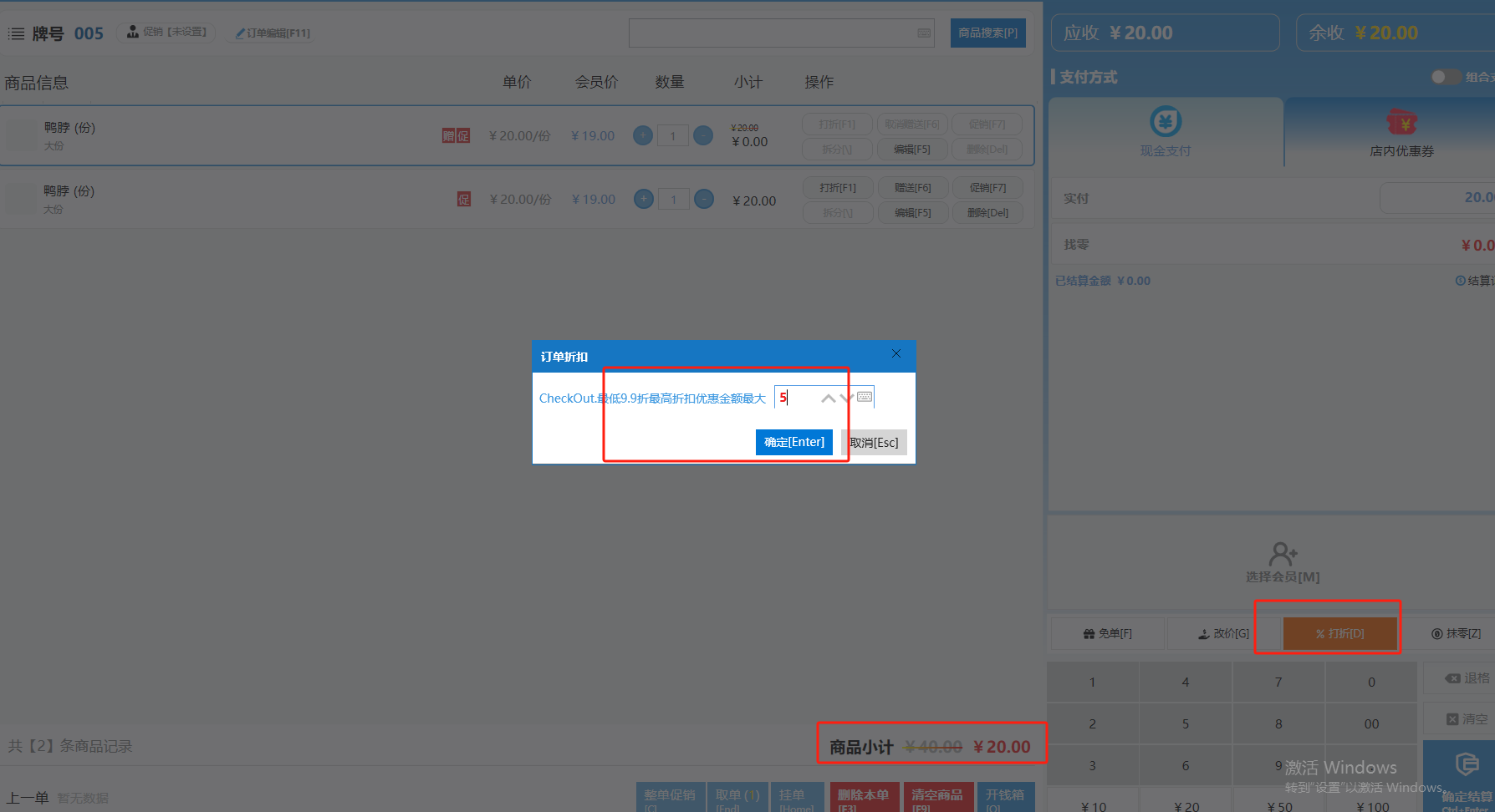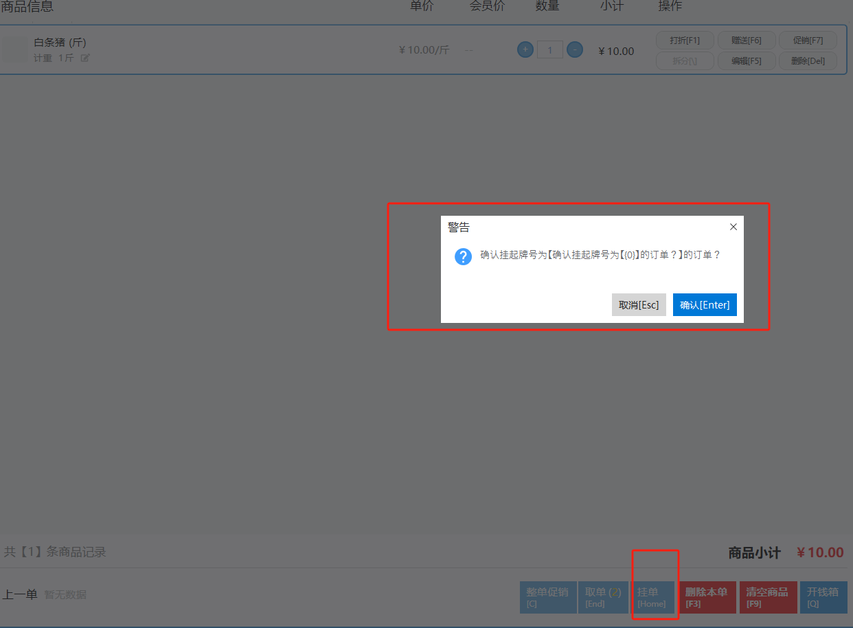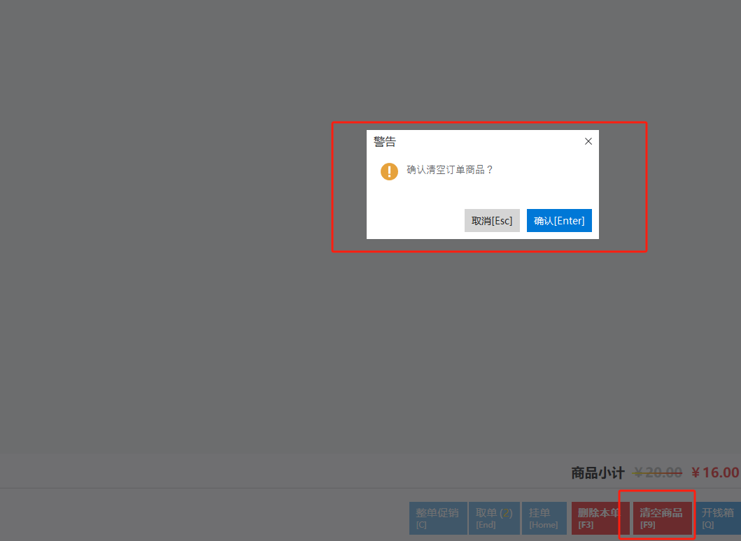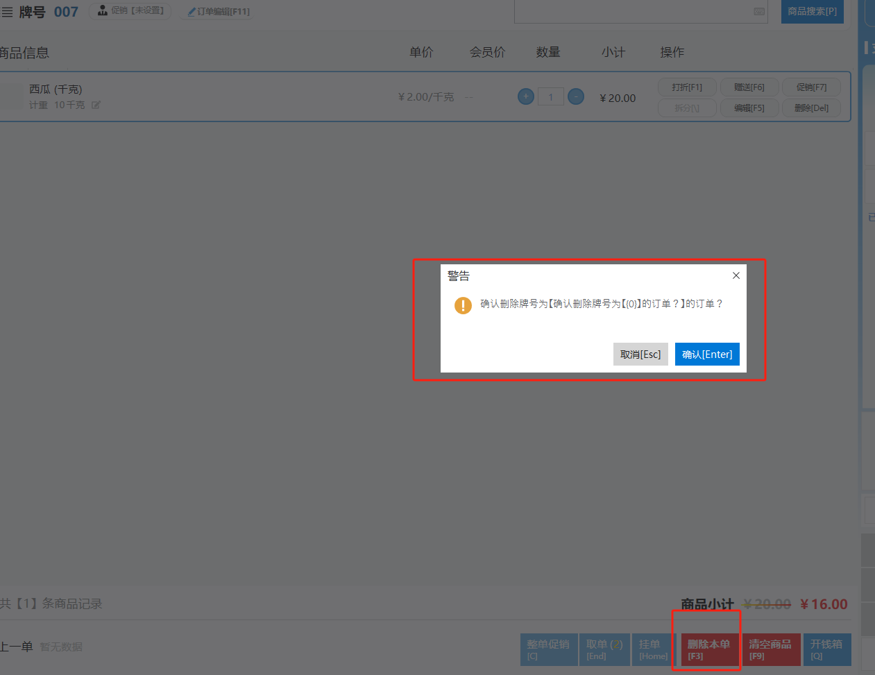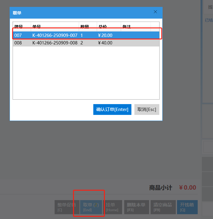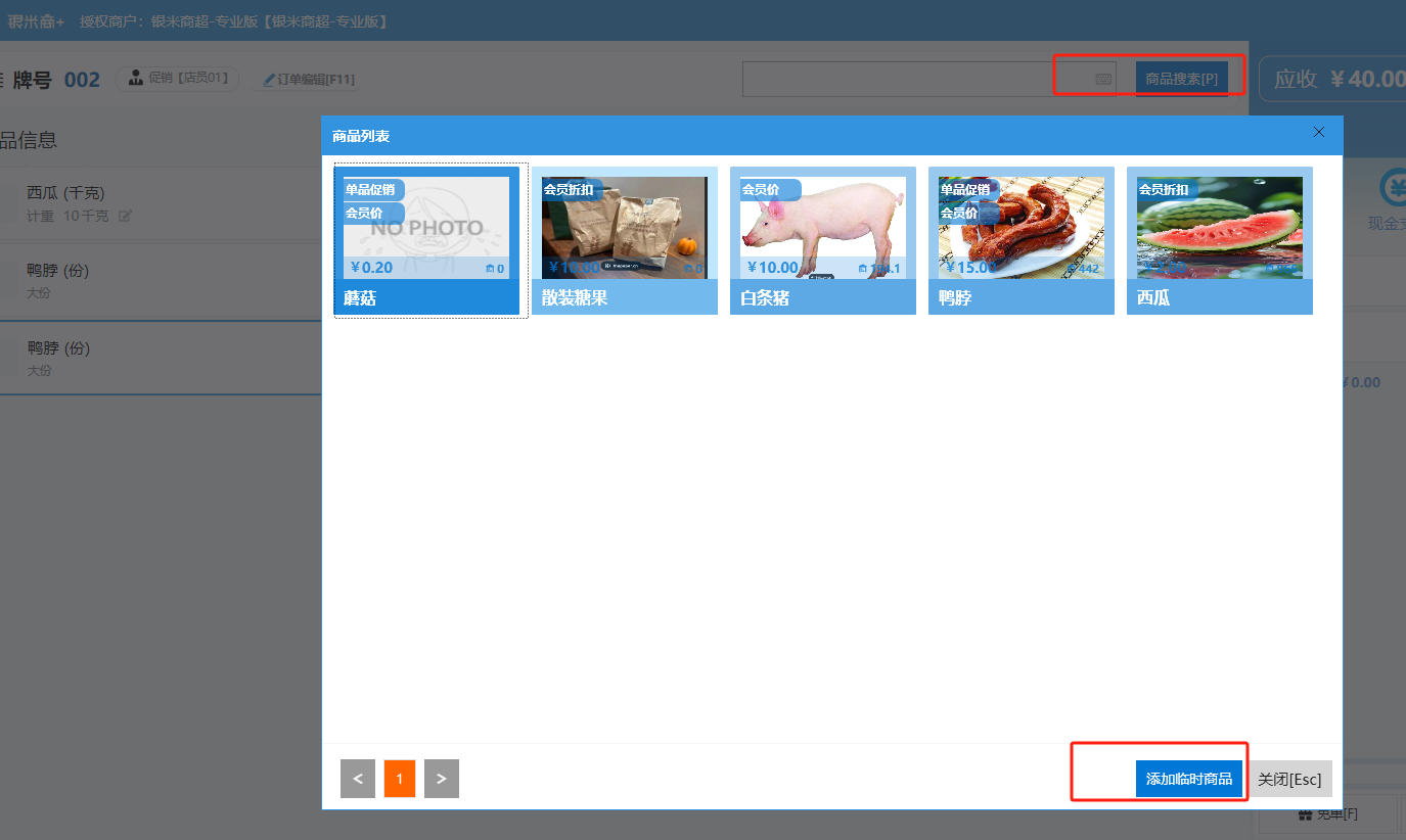 **扫码模式** 扫码模式是用扫码枪快速、准确地识别商品条码或支付码,极大提升收银效率,减少人工输入错误。包含有:购物车、结算栏、常用功能。 如图所示  1、购物车 购物车是临时承载和管理顾客当前所选的所有商品,作为结算前的核心操作界面,是完成交易的“中转站”。包括:订单编辑、商品搜索、商品信息、商品小计。 A:订单编辑 订单编辑是在订单完成结算前,对促销员信息、会员信息的修改和调整,确保最终订单的准确性。点击”订单编辑“中”设置促销员“选择促销员点击确认即可;如需更换,再次点击”设置促销员“选择新促销员点击确认即可完成更换;如无需促销员信息 。点击消除即可消除促销员信息。 如图所示  点击”设置会员“,出现会员搜索页面,通过读取会员卡新年,或者输入会员手机号,会员卡信息点击会员搜索即可出现会员信息,双击会员信息即可完成设置;如需更换,再次点击”设置会员“选择新会员点击确认即可完成更换;如无需会员信息 。点击消除即可消除会员信息。 如图所示  点击”备注“,即可输入订单的相关备注信息。 如图所示  单品应用会员价结算是为特定会员群体提供专属的单品优惠价格,实现精准营销,提升会员忠诚度和复购率。如需要使用,点击方框打”✔“,无需要则不打。点击确认订单即可完成所有设置。 如图所示  B、商品搜索 商品搜索是为了快速定位并找到目标商品,将其添加到订单中,极大提升收银效率,尤其是在无法扫码或记不清条码时。点击搜索商品,商品页面会跟随弹出,选择相关商品即可;可以添加临时商品,和收银操作添加临时商品相同。 如图所示  C、商品小计 商品小计是实时计算并显示当前已添加所有商品的累计总金额,让顾客和收银员在结算前对消费金额有一个清晰的预期。 如图所示  2、结算栏 结算栏是作为收银流程的最终确认和付款执行界面,完成从商品清单到资金收讫的最终转换。包含有:支付方式、选择会员 、人工折扣、辅助键盘,确定结算。 A、支付方式 支付方式是顾客提供多样化的付款选择,并准确、安全地完成资金接收**,**是交易流程的最终环节。包含:现金支付,微信支付,余额支付,优惠劵支付等多种付款方式,并可以选择2种或者多种的组合支付方式。 如图所示  结算记录可以查看完成部分支付的订单详情,点击”结算记录“即可查看。 如图所示  B、选择会员 选择会员是通过读取会员卡新年,或者输入会员手机号,会员卡信息点击会员搜索即可出现会员信息,双击会员信息即可完成设置;会员可查看会员详情,显示余额、积分,选择是否使用单品会员价、会员生日折扣价;如需更换会员信息,点击”更换“即可重新查找会员信息;如无需使用会员点击”清除“即可。 如图所示  C、人工折扣 人工折扣是授予经过授权的收银员(如店员01)一种灵活的权力,使其能够根据实际情况,临时为顾客提供额外的价格优惠。包含:免单、改价、打折、抹零。注意:多种折扣形式只能选择其中一种,不能采用2种以及多种的形式进行人工折扣。 免单是免除顾客该订单的所有金额。如图所示  改价是收银员输入该订单的应付金额,改价金额不能超过该订单的小计金额。如图所示  打折是收银员对该订单进行打折,折扣金额最低1折到最高99折。如图所示  抹零是收银员免除订单总额中的小额零头(通常是角、分)。如图所示  D、辅助键盘 辅助键盘作为数字的集合,将高频操作一键化,极大提升收银速度和操作效率。如图所示  E、确定结算 确定结算是作为收银流程的“最终确认键”,正式完成订单计算并进入付款环节。确认支付点击”确认“,不确认支付点击”取消“。如图所示  3、常用功能 常用功能是为收银员快捷处理商品订单而服务的常用功能汇总。包含有:整单促销、取单 、挂单、删除本单,清空商品、开钱箱。如图所示  A、整单促销 整单促销是通过设置基于订单总金额或条件的优惠规则,包含:满减、满赠 、满量。点击整单促销选择商品能参与的促销活动,点击即可参加。如图所示  B、取单 取单是快速恢复之前暂时保存的未付款订单,继续进行处理和结算,保证销售流程不中断。点击取单,选择未支付或部分支付的订单,点击确认订单即可。如图所示  C、挂单 挂单是暂停当前未完成的订单,临时保存起来,以便先处理其他更紧急的事务,之后可快速恢复继续操作。点击挂单,确认挂单点击”确认“即可,不挂单点击”取消“即可。如图所示  D、删除本单 删除本单是为了彻底取消并删除当前正在操作的未结算订单,通常用于作废无效或错误的交易。点击删除本单,确认删除点击”确认“即可,不删除点击”取消“即可。如图所示  E、清空商品 清空商品是一键移除当前购物车内的所有商品,为一笔新订单做准备。点击清空商品,确认清空点击”确认“即可,不清空点击”取消“即可。如图所示  F、开钱箱 开钱箱是通过按钮指令自动触发物理钱箱弹开,以便进行现金收款和找零操作。点击”开钱箱“,即可弹出钱箱。如图所示