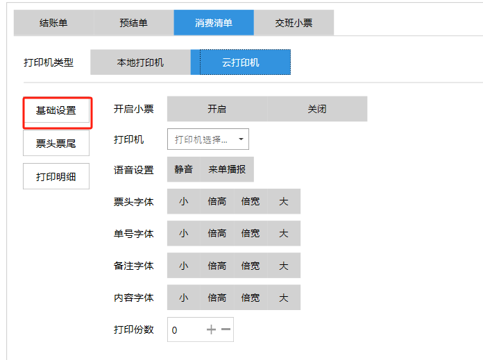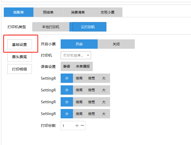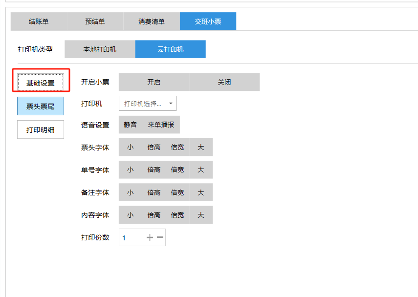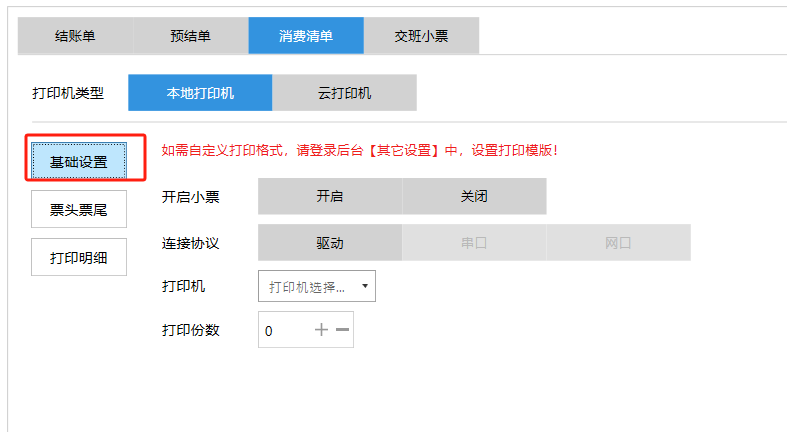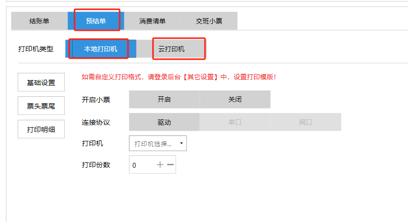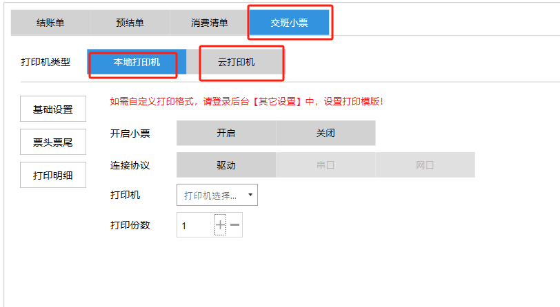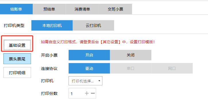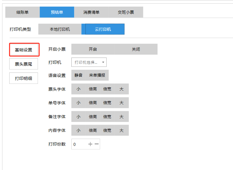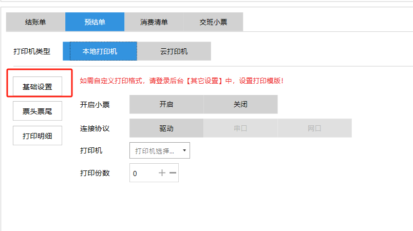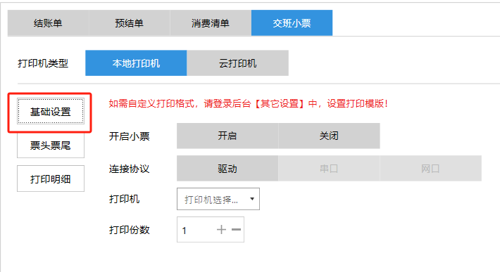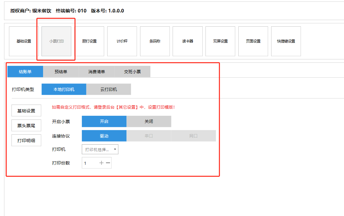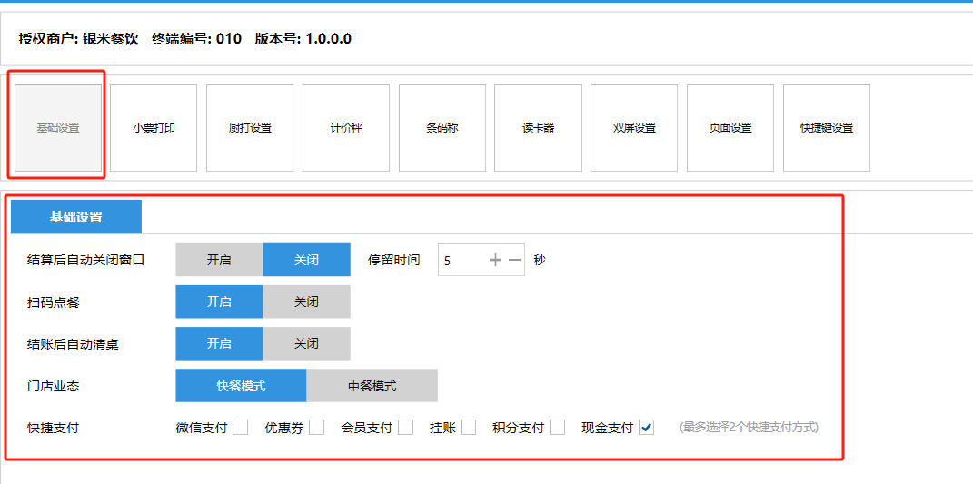 **设置** “设置”界面是为商户提供收银及相关外设的快速管理入口。包含:基础设置、小票打印、厨打设置、计价秤、条码称、读卡器、双屏设置、页面设置、快捷键设置。**注意:设置页面操作后需要点击“保存设置信息”,系统重启后才能生效。** 如图所示  一、基础设置 “基础设置”是收银系统的日常销售的所有操作流程、界面表现和业务规则。如图所示  1、结算后自动关闭窗口,选择开启即可结算后自动关闭窗口;选择关闭,需要设置窗口停留时间。 如图所示  2、扫码点餐选择开启即可扫码点餐;选择关闭,即可关闭扫码点餐 。如图所示  3、结账后自动清桌选择开启即可结账后自动清桌;选择关闭,即可结账后手动清桌。如图所示  4、门店业态选择快餐模式即登录页面进入点餐页面;选择中餐模式即登录页面进入桌台页面。如图所示   5、快捷支付可以选择现金支付、优惠劵支付、挂账等,最多同时选择2个快捷支付方式。如图所示  二、小票打印 “小票打印”是收银系统中用于管理和配置交易完成后打印纸质凭证(小票)行为。它连接软件订单与硬件打印机。包含 :结账单、预结单、消费清单、交班小票。 如图所示  1、结账单打印 “结账单打印”是收银系统中在完成一笔交易结算后,自动或手动驱动打印机为顾客输出纸质消费明细凭证的功能。这张纸就是通常所说的“小票”或“收据”。包含 :本地打印机、云打印机。 如图所示  A、本地打印机包含:基础设置、票头票尾、打印明细。 基础设置包含:开启小票(开启或者关闭)、连接协议(驱动 、串口、网口)、打印机(选择打印机)、打印份数。**注意:如需自定义打印格式在商户后台“其它设置”中设置打印模板。** 如图所示  票头票尾包含:小票抬头、票头留白、票头文字、票头图片、票尾留白、票尾文字、票尾图片。 如图所示  打印明细包含:商品列表选择商品名称、数量、单价、小计、实付;其它设置选择订单号、结账时间、优惠金额、会员信息、折扣信息。 如图所示  B、云打印机包含:基础设置、票头票尾、打印明细。 基础设置包含:开启小票(开启或者关闭)、打印机(选择打印机)、语音设置(静音、来单播报)、打印份数。 如图所示  票头票尾包含:小票抬头、票头留白、票头文字、票尾留白、票尾文字。  打印明细包含:商品列表选择商品名称、数量、单价、小计、实付;其它设置选择订单号、结账时间、优惠金额、会员信息、折扣信息。  2、预结单打印 “预结单打印”是打印一份包含日期、桌台和客人信息的简洁单据,作为结账前的核对凭证。包含 :本地打印机、云打印机。 如图所示  A、本地打印机包含:基础设置、票头票尾、打印明细。 基础设置包含:开启小票(开启或者关闭)、连接协议(驱动 、串口、网口)、打印机(选择打印机)、打印份数。**注意:如需自定义打印格式在商户后台“其它设置”中设置打印模板。** 如图所示  票头票尾包含:小票抬头、票头留白、票头文字、票头图片、票尾留白、票尾文字、票尾图片。 如图所示  打印明细包含:商品列表选择商品名称、数量、单价、小计、实付;其它设置选择订单号、结账时间、优惠金额、会员信息、折扣信息。 如图所示  B、云打印机包含:基础设置、票头票尾、打印明细。 基础设置包含:开启小票(开启或者关闭)、打印机(选择打印机)、语音设置(静音、来单播报)、打印份数。 如图所示  票头票尾包含:小票抬头、票头留白、票头文字、票尾留白、票尾文字。  打印明细包含:商品列表选择商品名称、数量、单价、小计、实付;其它设置选择订单号、结账时间、优惠金额、会员信息、折扣信息。  3、消费清单打印 “消费清单打印”是为顾客清晰罗列所有消费项目、单价、数量及总金额的消费凭证。包含 :本地打印机、云打印机。 如图所示  A、本地打印机包含:基础设置、票头票尾、打印明细。 基础设置包含:开启小票(开启或者关闭)、连接协议(驱动 、串口、网口)、打印机(选择打印机)、打印份数。**注意:如需自定义打印格式在商户后台“其它设置”中设置打印模板。** 如图所示  票头票尾包含:小票抬头、票头留白、票头文字、票头图片、票尾留白、票尾文字、票尾图片。 如图所示  打印明细包含:商品列表选择商品名称、数量、单价、小计、实付;其它设置选择订单号、桌台信息、会员信息。 如图所示  B、云打印机包含:基础设置、票头票尾、打印明细。 基础设置包含:开启小票(开启或者关闭)、打印机(选择打印机)、语音设置(静音、来单播报)、打印份数。 如图所示  票头票尾包含:小票抬头、票头留白、票头文字、票尾留白、票尾文字。  打印明细包含:商品列表选择商品名称、数量、单价、小计、实付;其它设置选择订单号、结账时间、优惠金额、会员信息、折扣信息。  4、交班小票打印 “交班小票打印”是收银系统中在执行交班操作时,自动打印一份详尽的当班财务和业务汇总小票。这张小票是收银员之间进行责任交接和财务核对的核心凭证。包含 :本地打印机、云打印机。  A、本地打印机包含:基础设置、票头票尾、打印明细。 基础设置包含:开启小票(开启或者关闭)、连接协议(驱动 、串口、网口)、打印机(选择打印机)、打印份数。**注意:如需自定义打印格式在商户后台“其它设置”中设