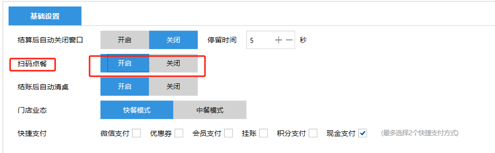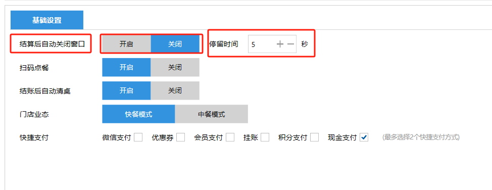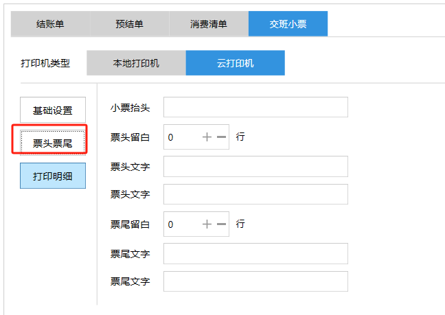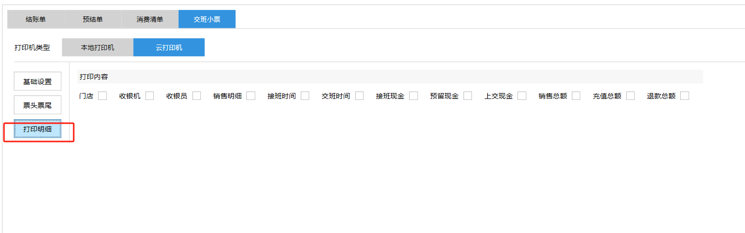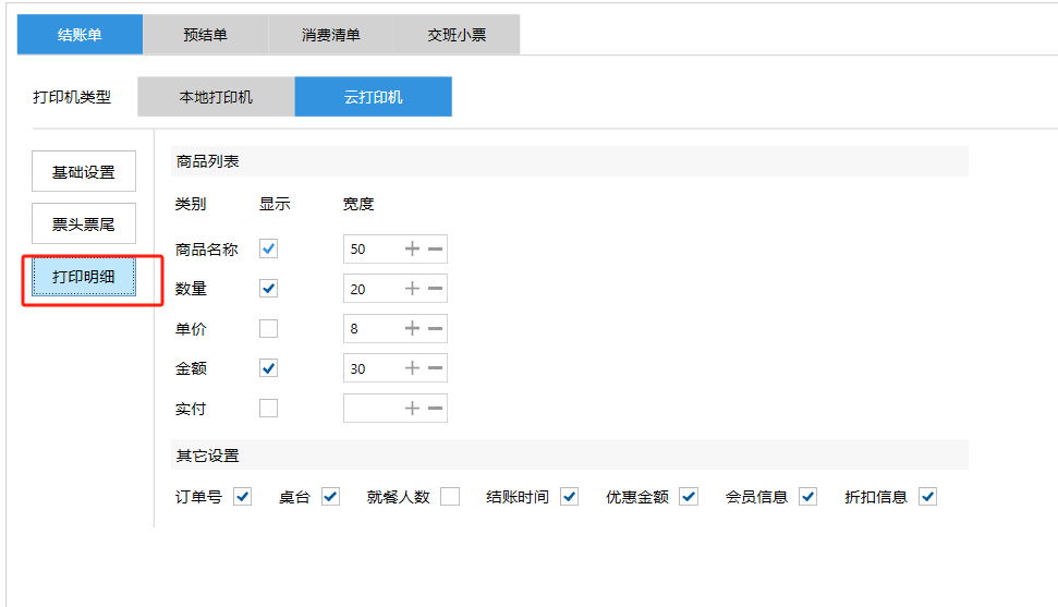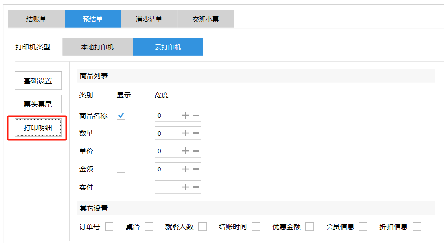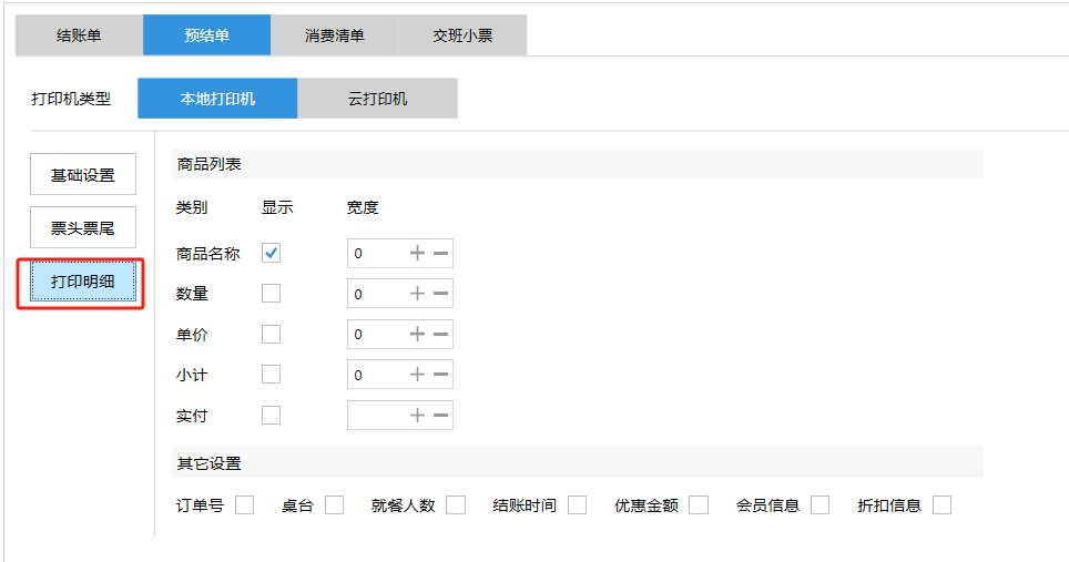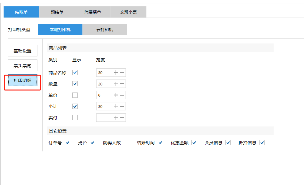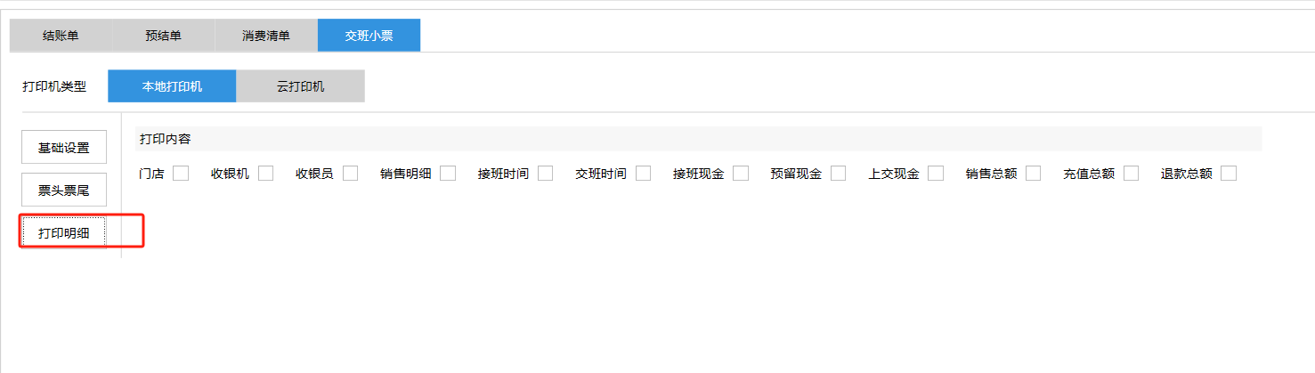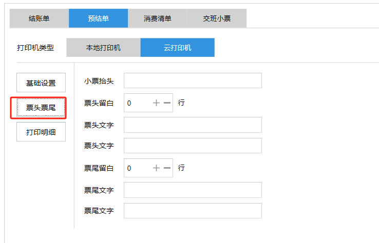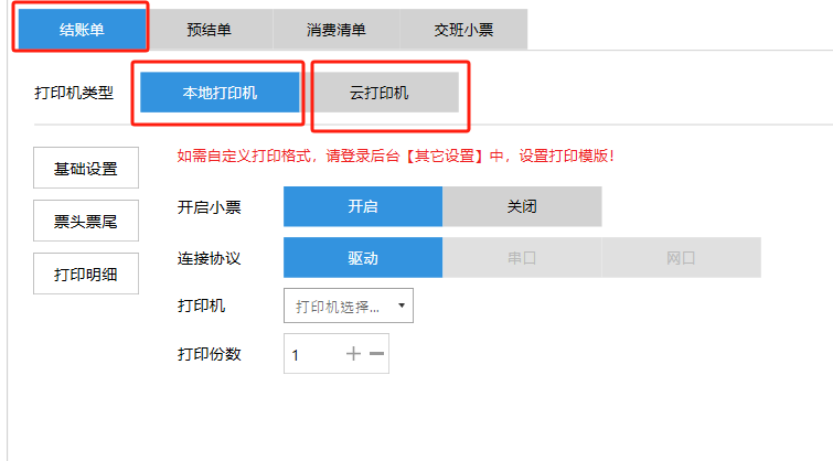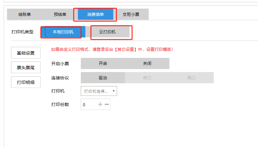 **设置** “设置”界面是为商户提供收银及相关外设的快速管理入口。包含:基础设置、小票打印、厨打设置、计价秤、条码称、读卡器、双屏设置、页面设置、快捷键设置。**注意:设置页面操作后需要点击“保存设置信息”,系统重启后才能生效。** 如图所示  一、基础设置 “基础设置”是收银系统的日常销售的所有操作流程、界面表现和业务规则。如图所示  1、结算后自动关闭窗口,选择开启即可结算后自动关闭窗口;选择关闭,需要设置窗口停留时间。 如图所示  2、扫码点餐选择开启即可扫码点餐;选择关闭,即可关闭扫码点餐 。如图所示  3、结账后自动清桌选择开启即可结账后自动清桌;选择关闭,即可结账后手动清桌。如图所示  4、门店业态选择快餐模式即登录页面进入点餐页面;选择中餐模式即登录页面进入桌台页面。如图所示   5、快捷支付可以选择现金支付、优惠劵支付、挂账等,最多同时选择2个快捷支付方式。如图所示  二、小票打印 “小票打印”是收银系统中用于管理和配置交易完成后打印纸质凭证(小票)行为。它连接软件订单与硬件打印机。包含 :结账单、预结单、消费清单、交班小票。 如图所示  1、结账单打印 “结账单打印”是收银系统中在完成一笔交易结算后,自动或手动驱动打印机为顾客输出纸质消费明细凭证的功能。这张纸就是通常所说的“小票”或“收据”。包含 :本地打印机、云打印机。 如图所示  A、本地打印机包含:基础设置、票头票尾、打印明细。 基础设置包含:开启小票(开启或者关闭)、连接协议(驱动 、串口、网口)、打印机(选择打印机)、打印份数。**注意:如需自定义打印格式在商户后台“其它设置”中设置打印模板。** 如图所示  票头票尾包含:小票抬头、票头留白、票头文字、票头图片、票尾留白、票尾文字、票尾图片。 如图所示  打印明细包含:商品列表选择商品名称、数量、单价、小计、实付;其它设置选择订单号、结账时间、优惠金额、会员信息、折扣信息。 如图所示  B、云打印机包含:基础设置、票头票尾、打印明细。 基础设置包含:开启小票(开启或者关闭)、打印机(选择打印机)、语音设置(静音、来单播报)、打印份数。 如图所示  票头票尾包含:小票抬头、票头留白、票头文字、票尾留白、票尾文字。  打印明细包含:商品列表选择商品名称、数量、单价、小计、实付;其它设置选择订单号、结账时间、优惠金额、会员信息、折扣信息。  2、预结单打印 “预结单打印”是打印一份包含日期、桌台和客人信息的简洁单据,作为结账前的核对凭证。包含 :本地打印机、云打印机。 如图所示  A、本地打印机包含:基础设置、票头票尾、打印明细。 基础设置包含:开启小票(开启或者关闭)、连接协议(驱动 、串口、网口)、打印机(选择打印机)、打印份数。**注意:如需自定义打印格式在商户后台“其它设置”中设置打印模板。** 如图所示  票头票尾包含:小票抬头、票头留白、票头文字、票头图片、票尾留白、票尾文字、票尾图片。 如图所示  打印明细包含:商品列表选择商品名称、数量、单价、小计、实付;其它设置选择订单号、结账时间、优惠金额、会员信息、折扣信息。 如图所示  B、云打印机包含:基础设置、票头票尾、打印明细。 基础设置包含:开启小票(开启或者关闭)、打印机(选择打印机)、语音设置(静音、来单播报)、打印份数。 如图所示  票头票尾包含:小票抬头、票头留白、票头文字、票尾留白、票尾文字。  打印明细包含:商品列表选择商品名称、数量、单价、小计、实付;其它设置选择订单号、结账时间、优惠金额、会员信息、折扣信息。  3、消费清单打印 “消费清单打印”是为顾客清晰罗列所有消费项目、单价、数量及总金额的消费凭证。包含 :本地打印机、云打印机。 如图所示  A、本地打印机包含:基础设置、票头票尾、打印明细。 基础设置包含:开启小票(开启或者关闭)、连接协议(驱动 、串口、网口)、打印机(选择打印机)、打印份数。**注意:如需自定义打印格式在商户后台“其它设置”中设置打印模板。** 如图所示  票头票尾包含:小票抬头、票头留白、票头文字、票头图片、票尾留白、票尾文字、票尾图片。 如图所示  打印明细包含:商品列表选择商品名称、数量、单价、小计、实付;其它设置选择订单号、桌台信息、会员信息。 如图所示  B、云打印机包含:基础设置、票头票尾、打印明细。 基础设置包含:开启小票(开启或者关闭)、打印机(选择打印机)、语音设置(静音、来单播报)、打印份数。 如图所示  票头票尾包含:小票抬头、票头留白、票头文字、票尾留白、票尾文字。  打印明细包含:商品列表选择商品名称、数量、单价、小计、实付;其它设置选择订单号、结账时间、优惠金额、会员信息、折扣信息。  4、交班小票打印 “交班小票打印”是收银系统中在执行交班操作时,自动打印一份详尽的当班财务和业务汇总小票。这张小票是收银员之间进行责任交接和财务核对的核心凭证。包含 :本地打印机、云打印机。  A、本地打印机包含:基础设置、票头票尾、打印明细。 基础设置包含:开启小票(开启或者关闭)、连接协议(驱动 、串口、网口)、打印机(选择打印机)、打印份数。**注意:如需自定义打印格式在商户后台“其它设置”中设