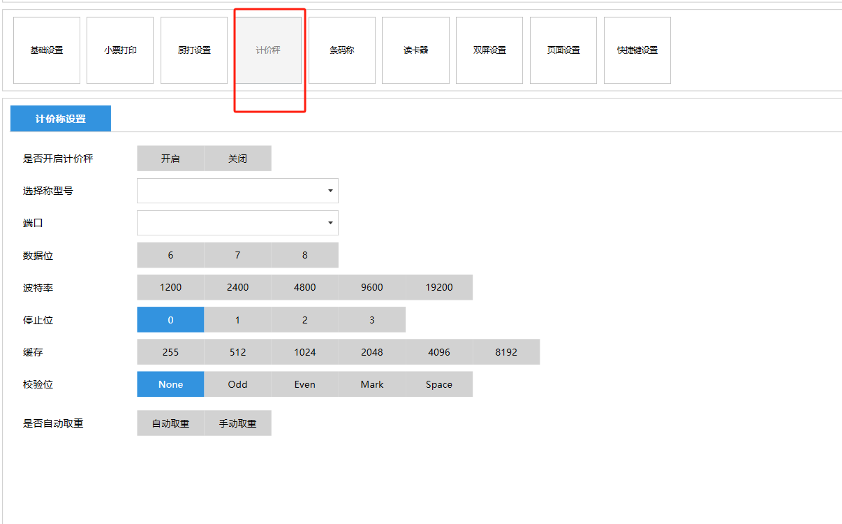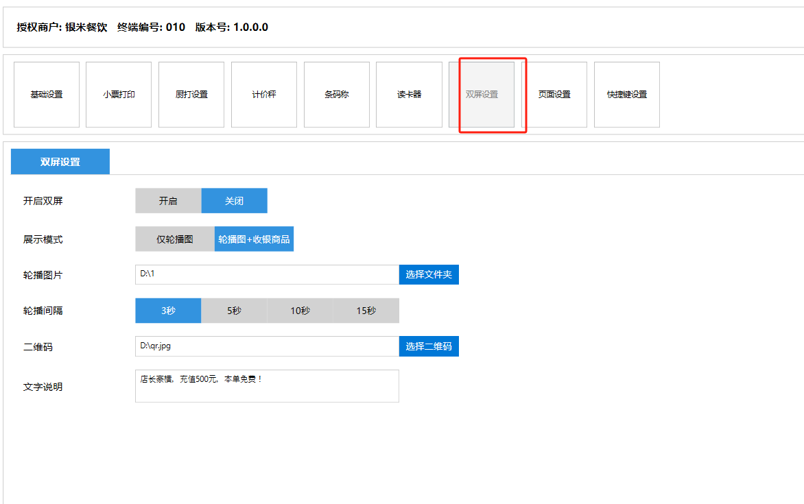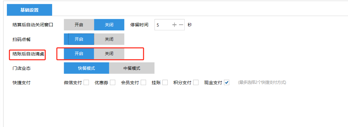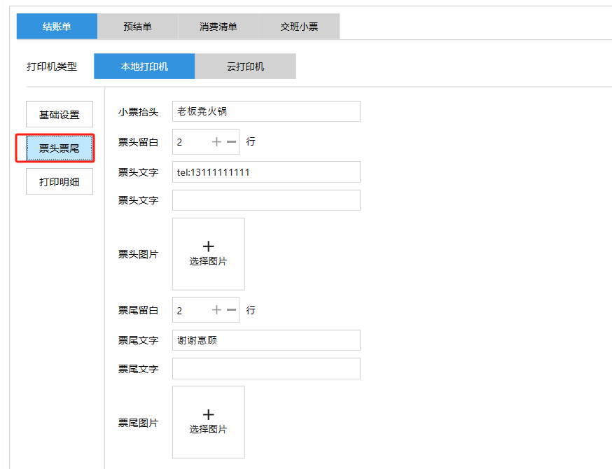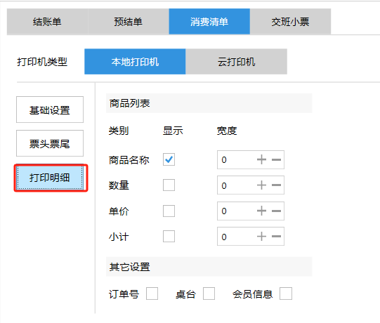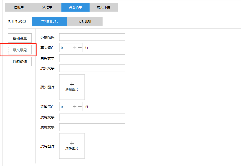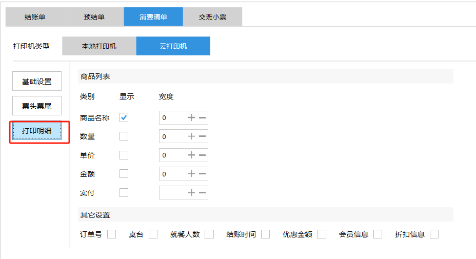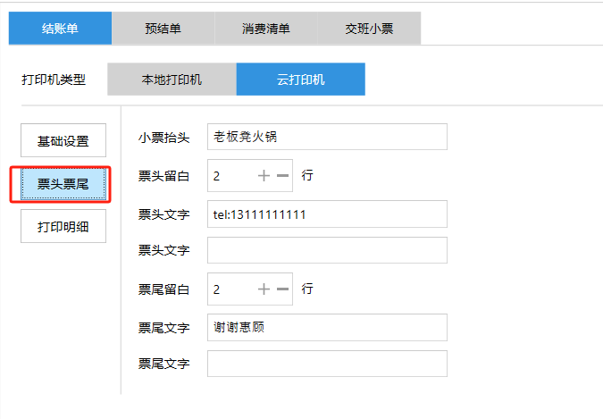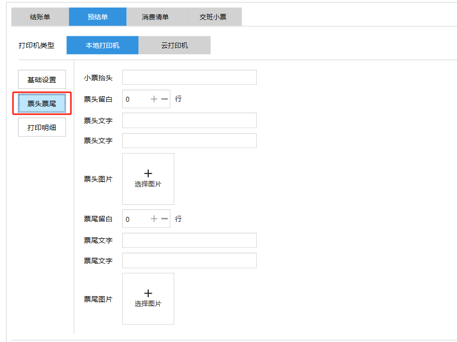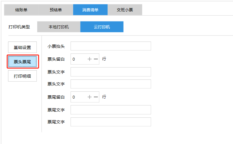 **设置** “设置”界面是为商户提供收银及相关外设的快速管理入口。包含:基础设置、小票打印、厨打设置、计价秤、条码称、读卡器、双屏设置、页面设置、快捷键设置。**注意:设置页面操作后需要点击“保存设置信息”,系统重启后才能生效。** 如图所示  一、基础设置 “基础设置”是收银系统的日常销售的所有操作流程、界面表现和业务规则。如图所示  1、结算后自动关闭窗口,选择开启即可结算后自动关闭窗口;选择关闭,需要设置窗口停留时间。 如图所示  2、扫码点餐选择开启即可扫码点餐;选择关闭,即可关闭扫码点餐 。如图所示  3、结账后自动清桌选择开启即可结账后自动清桌;选择关闭,即可结账后手动清桌。如图所示  4、门店业态选择快餐模式即登录页面进入点餐页面;选择中餐模式即登录页面进入桌台页面。如图所示   5、快捷支付可以选择现金支付、优惠劵支付、挂账等,最多同时选择2个快捷支付方式。如图所示  二、小票打印 “小票打印”是收银系统中用于管理和配置交易完成后打印纸质凭证(小票)行为。它连接软件订单与硬件打印机。包含 :结账单、预结单、消费清单、交班小票。 如图所示  1、结账单打印 “结账单打印”是收银系统中在完成一笔交易结算后,自动或手动驱动打印机为顾客输出纸质消费明细凭证的功能。这张纸就是通常所说的“小票”或“收据”。包含 :本地打印机、云打印机。 如图所示  A、本地打印机包含:基础设置、票头票尾、打印明细。 基础设置包含:开启小票(开启或者关闭)、连接协议(驱动 、串口、网口)、打印机(选择打印机)、打印份数。**注意:如需自定义打印格式在商户后台“其它设置”中设置打印模板。** 如图所示  票头票尾包含:小票抬头、票头留白、票头文字、票头图片、票尾留白、票尾文字、票尾图片。 如图所示  打印明细包含:商品列表选择商品名称、数量、单价、小计、实付;其它设置选择订单号、结账时间、优惠金额、会员信息、折扣信息。 如图所示  B、云打印机包含:基础设置、票头票尾、打印明细。 基础设置包含:开启小票(开启或者关闭)、打印机(选择打印机)、语音设置(静音、来单播报)、打印份数。 如图所示  票头票尾包含:小票抬头、票头留白、票头文字、票尾留白、票尾文字。  打印明细包含:商品列表选择商品名称、数量、单价、小计、实付;其它设置选择订单号、结账时间、优惠金额、会员信息、折扣信息。  2、预结单打印 “预结单打印”是打印一份包含日期、桌台和客人信息的简洁单据,作为结账前的核对凭证。包含 :本地打印机、云打印机。 如图所示  A、本地打印机包含:基础设置、票头票尾、打印明细。 基础设置包含:开启小票(开启或者关闭)、连接协议(驱动 、串口、网口)、打印机(选择打印机)、打印份数。**注意:如需自定义打印格式在商户后台“其它设置”中设置打印模板。** 如图所示  票头票尾包含:小票抬头、票头留白、票头文字、票头图片、票尾留白、票尾文字、票尾图片。 如图所示  打印明细包含:商品列表选择商品名称、数量、单价、小计、实付;其它设置选择订单号、结账时间、优惠金额、会员信息、折扣信息。 如图所示  B、云打印机包含:基础设置、票头票尾、打印明细。 基础设置包含:开启小票(开启或者关闭)、打印机(选择打印机)、语音设置(静音、来单播报)、打印份数。 如图所示  票头票尾包含:小票抬头、票头留白、票头文字、票尾留白、票尾文字。  打印明细包含:商品列表选择商品名称、数量、单价、小计、实付;其它设置选择订单号、结账时间、优惠金额、会员信息、折扣信息。  3、消费清单打印 “消费清单打印”是为顾客清晰罗列所有消费项目、单价、数量及总金额的消费凭证。包含 :本地打印机、云打印机。 如图所示  A、本地打印机包含:基础设置、票头票尾、打印明细。 基础设置包含:开启小票(开启或者关闭)、连接协议(驱动 、串口、网口)、打印机(选择打印机)、打印份数。**注意:如需自定义打印格式在商户后台“其它设置”中设置打印模板。** 如图所示  票头票尾包含:小票抬头、票头留白、票头文字、票头图片、票尾留白、票尾文字、票尾图片。 如图所示  打印明细包含:商品列表选择商品名称、数量、单价、小计、实付;其它设置选择订单号、桌台信息、会员信息。 如图所示  B、云打印机包含:基础设置、票头票尾、打印明细。 基础设置包含:开启小票(开启或者关闭)、打印机(选择打印机)、语音设置(静音、来单播报)、打印份数。 如图所示  票头票尾包含:小票抬头、票头留白、票头文字、票尾留白、票尾文字。  打印明细包含:商品列表选择商品名称、数量、单价、小计、实付;其它设置选择订单号、结账时间、优惠金额、会员信息、折扣信息。  4、交班小票打印 “交班小票打印”是收银系统中在执行交班操作时,自动打印一份详尽的当班财务和业务汇总小票。这张小票是收银员之间进行责任交接和财务核对的核心凭证。包含 :本地打印机、云打印机。  A、本地打印机包含:基础设置、票头票尾、打印明细。 基础设置包含:开启小票(开启或者关闭)、连接协议(驱动 、串口、网口)、打印机(选择打印机)、打印份数。**注意:如需自定义打印格式在商户后台“其它设置”中设
