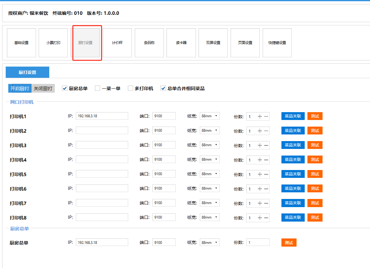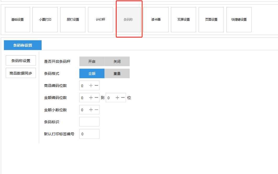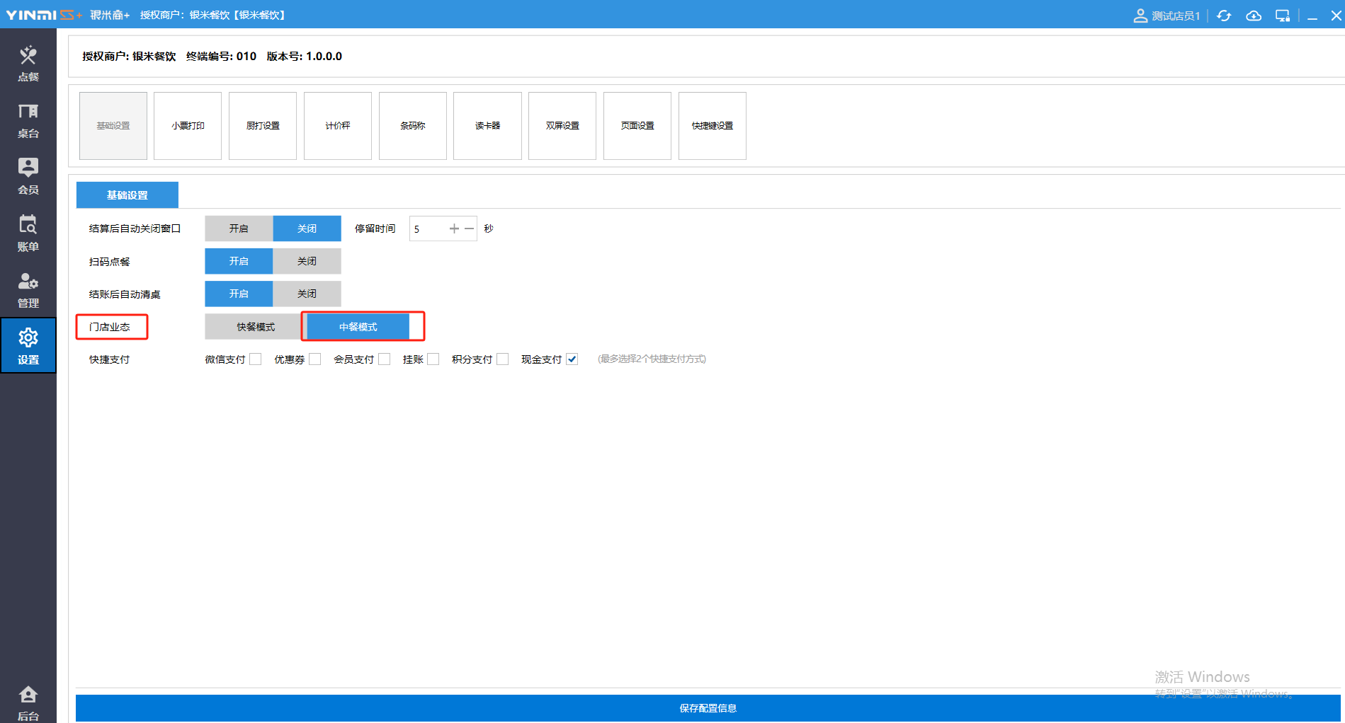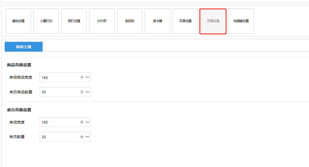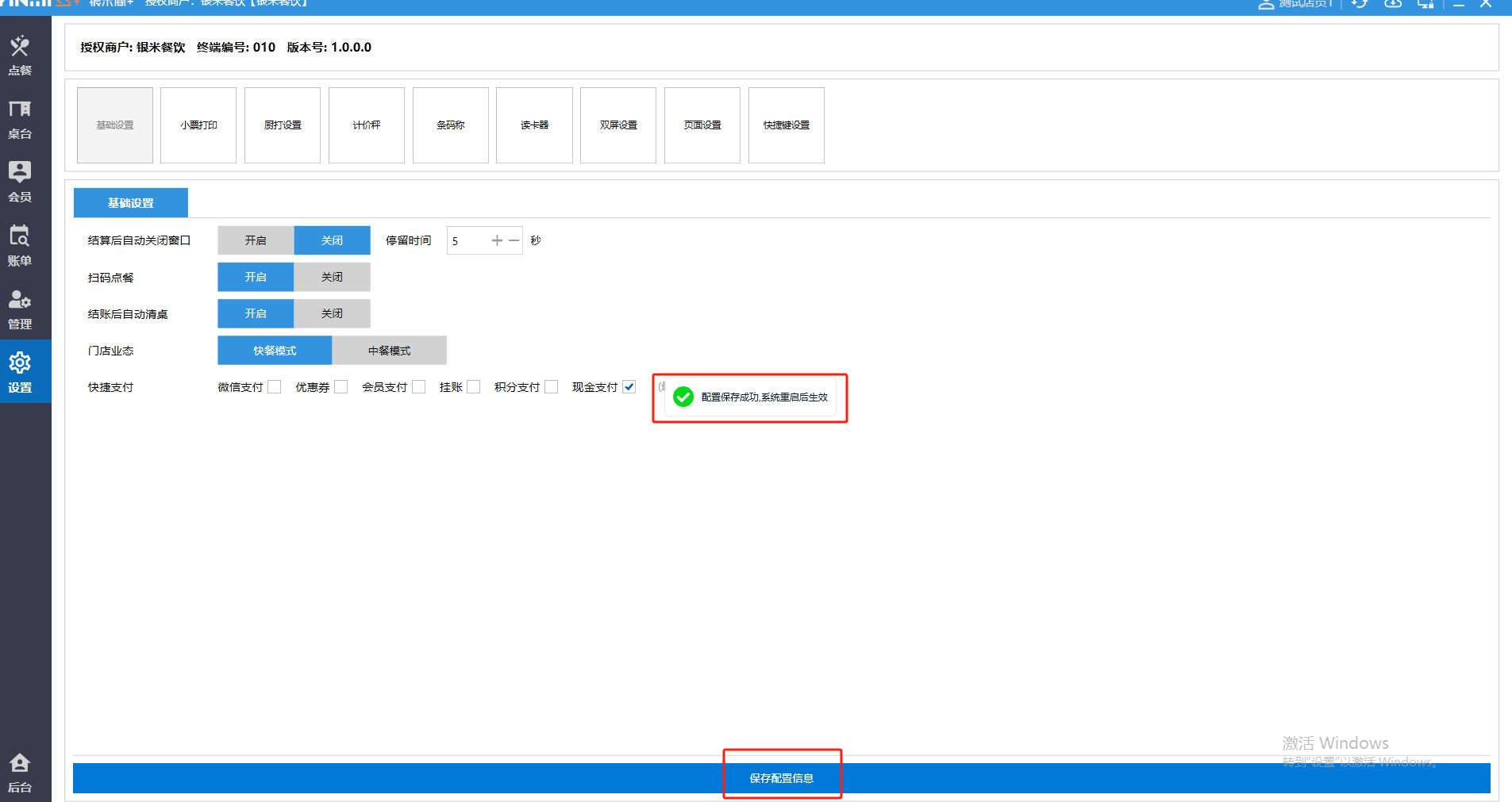 **设置** “设置”界面是为商户提供收银及相关外设的快速管理入口。包含:基础设置、小票打印、厨打设置、计价秤、条码称、读卡器、双屏设置、页面设置、快捷键设置。**注意:设置页面操作后需要点击“保存设置信息”,系统重启后才能生效。** 如图所示  一、基础设置 “基础设置”是收银系统的日常销售的所有操作流程、界面表现和业务规则。如图所示  1、结算后自动关闭窗口,选择开启即可结算后自动关闭窗口;选择关闭,需要设置窗口停留时间。 如图所示  2、扫码点餐选择开启即可扫码点餐;选择关闭,即可关闭扫码点餐 。如图所示  3、结账后自动清桌选择开启即可结账后自动清桌;选择关闭,即可结账后手动清桌。如图所示  4、门店业态选择快餐模式即登录页面进入点餐页面;选择中餐模式即登录页面进入桌台页面。如图所示   5、快捷支付可以选择现金支付、优惠劵支付、挂账等,最多同时选择2个快捷支付方式。如图所示  二、小票打印 “小票打印”是收银系统中用于管理和配置交易完成后打印纸质凭证(小票)行为。它连接软件订单与硬件打印机。包含 :结账单、预结单、消费清单、交班小票。 如图所示  1、结账单打印 “结账单打印”是收银系统中在完成一笔交易结算后,自动或手动驱动打印机为顾客输出纸质消费明细凭证的功能。这张纸就是通常所说的“小票”或“收据”。包含 :本地打印机、云打印机。 如图所示  A、本地打印机包含:基础设置、票头票尾、打印明细。 基础设置包含:开启小票(开启或者关闭)、连接协议(驱动 、串口、网口)、打印机(选择打印机)、打印份数。**注意:如需自定义打印格式在商户后台“其它设置”中设置打印模板。** 如图所示  票头票尾包含:小票抬头、票头留白、票头文字、票头图片、票尾留白、票尾文字、票尾图片。 如图所示  打印明细包含:商品列表选择商品名称、数量、单价、小计、实付;其它设置选择订单号、结账时间、优惠金额、会员信息、折扣信息。 如图所示  B、云打印机包含:基础设置、票头票尾、打印明细。 基础设置包含:开启小票(开启或者关闭)、打印机(选择打印机)、语音设置(静音、来单播报)、打印份数。 如图所示  票头票尾包含:小票抬头、票头留白、票头文字、票尾留白、票尾文字。  打印明细包含:商品列表选择商品名称、数量、单价、小计、实付;其它设置选择订单号、结账时间、优惠金额、会员信息、折扣信息。  2、预结单打印 “预结单打印”是打印一份包含日期、桌台和客人信息的简洁单据,作为结账前的核对凭证。包含 :本地打印机、云打印机。 如图所示  A、本地打印机包含:基础设置、票头票尾、打印明细。 基础设置包含:开启小票(开启或者关闭)、连接协议(驱动 、串口、网口)、打印机(选择打印机)、打印份数。**注意:如需自定义打印格式在商户后台“其它设置”中设置打印模板。** 如图所示  票头票尾包含:小票抬头、票头留白、票头文字、票头图片、票尾留白、票尾文字、票尾图片。 如图所示  打印明细包含:商品列表选择商品名称、数量、单价、小计、实付;其它设置选择订单号、结账时间、优惠金额、会员信息、折扣信息。 如图所示  B、云打印机包含:基础设置、票头票尾、打印明细。 基础设置包含:开启小票(开启或者关闭)、打印机(选择打印机)、语音设置(静音、来单播报)、打印份数。 如图所示  票头票尾包含:小票抬头、票头留白、票头文字、票尾留白、票尾文字。  打印明细包含:商品列表选择商品名称、数量、单价、小计、实付;其它设置选择订单号、结账时间、优惠金额、会员信息、折扣信息。  3、消费清单打印 “消费清单打印”是为顾客清晰罗列所有消费项目、单价、数量及总金额的消费凭证。包含 :本地打印机、云打印机。 如图所示  A、本地打印机包含:基础设置、票头票尾、打印明细。 基础设置包含:开启小票(开启或者关闭)、连接协议(驱动 、串口、网口)、打印机(选择打印机)、打印份数。**注意:如需自定义打印格式在商户后台“其它设置”中设置打印模板。** 如图所示  票头票尾包含:小票抬头、票头留白、票头文字、票头图片、票尾留白、票尾文字、票尾图片。 如图所示  打印明细包含:商品列表选择商品名称、数量、单价、小计、实付;其它设置选择订单号、桌台信息、会员信息。 如图所示  B、云打印机包含:基础设置、票头票尾、打印明细。 基础设置包含:开启小票(开启或者关闭)、打印机(选择打印机)、语音设置(静音、来单播报)、打印份数。 如图所示  票头票尾包含:小票抬头、票头留白、票头文字、票尾留白、票尾文字。  打印明细包含:商品列表选择商品名称、数量、单价、小计、实付;其它设置选择订单号、结账时间、优惠金额、会员信息、折扣信息。  4、交班小票打印 “交班小票打印”是收银系统中在执行交班操作时,自动打印一份详尽的当班财务和业务汇总小票。这张小票是收银员之间进行责任交接和财务核对的核心凭证。包含 :本地打印机、云打印机。  A、本地打印机包含:基础设置、票头票尾、打印明细。 基础设置包含:开启小票(开启或者关闭)、连接协议(驱动 、串口、网口)、打印机(选择打印机)、打印份数。**注意:如需自定义打印格式在商户后台“其它设置”中设