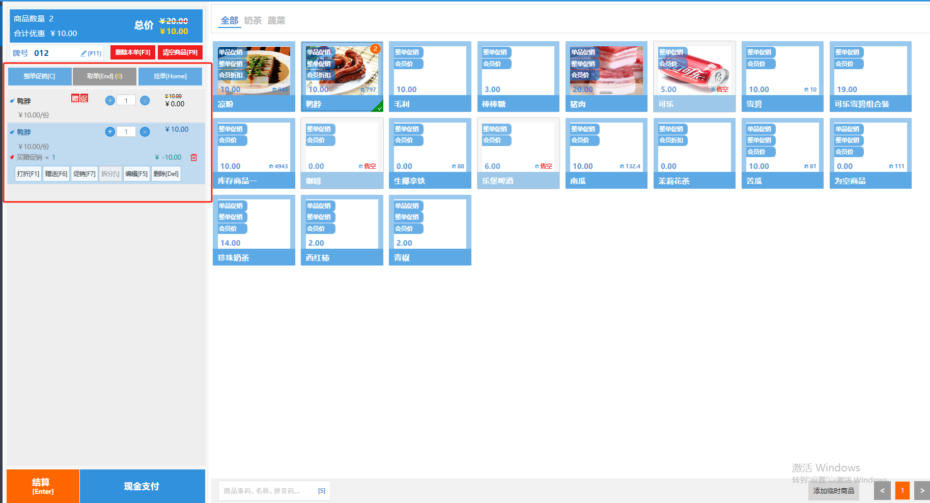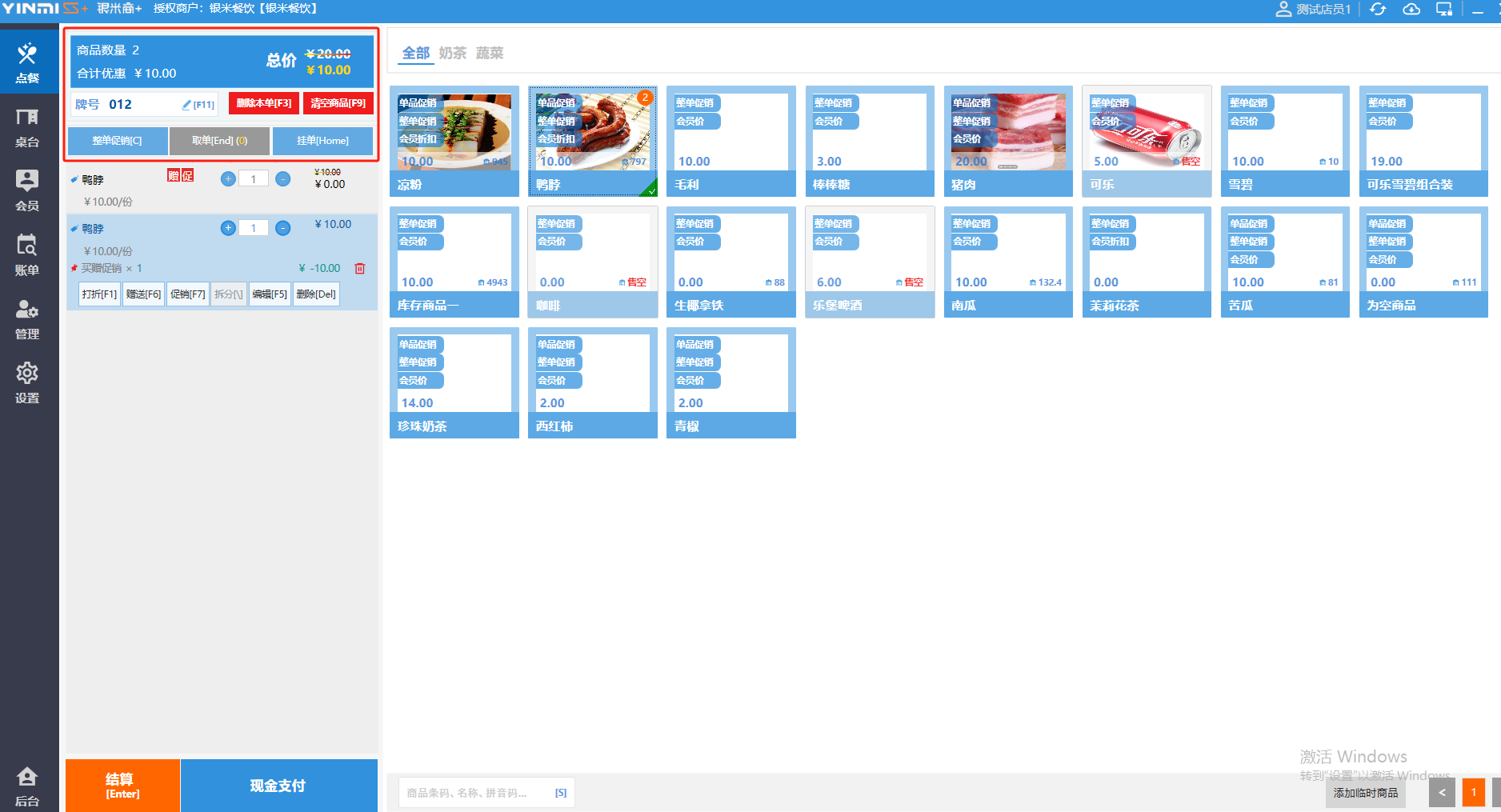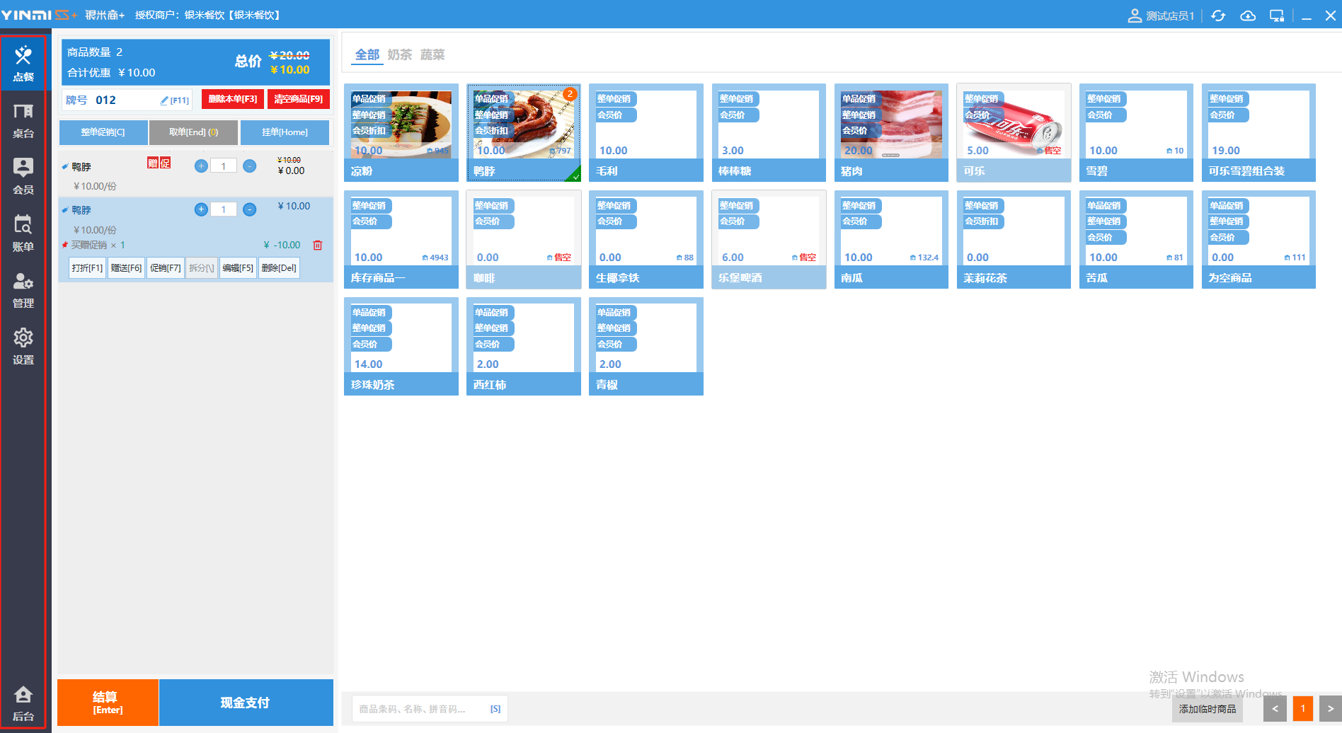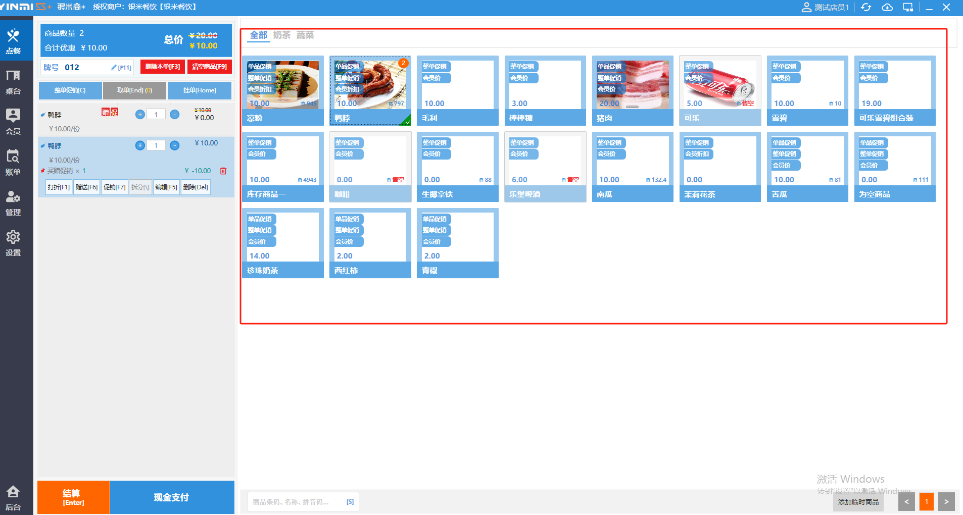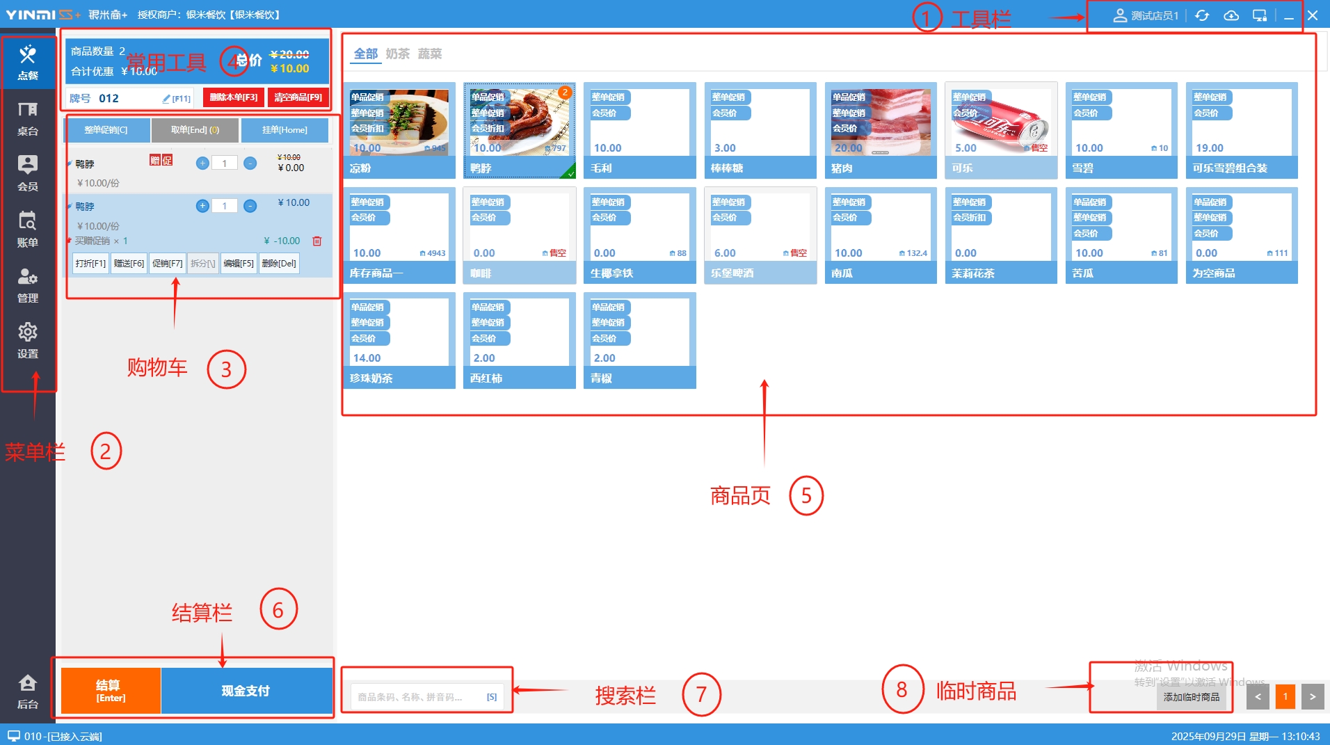 ### 收银界面 收银界面按功能划分,主要分为工具栏、菜单栏、购物车、常用功能、结算栏、商品页、搜索栏、临时商品。 如图所示  一、工具栏 详见“工具栏文档”  二、菜单栏 菜单栏包括:点餐、桌台、会员、账单、管理、设置以及进入后台。其中后台是网页端,需提前下载浏览并设置为默认浏览器,推荐使用谷歌浏览器或火狐浏览器。 如图所示  三、购物车 购物车可显示每个商品名称、数量、售价、以及全部商品的合计件数、合计优惠和总价。并可进行打折、赠送、促销、拆分、赠送、删除操作。 如图所示  四、常用功能 常用功能可显示牌号、删除本单、清空商品、整单促销以及挂单和取单的功能。 如图所示  五、商品页 商品页可显示商品名称,单价,库存 ,促销活动,会员活动以及购买的数量。 如图所示  六、结算栏 点击“结算”,进入结账界面,支持组合支付、整单折扣/折让等操作,详情见“收银流程文档”。 如图所示  七、搜索栏 点击“搜索栏”,可快捷搜索商品,输入商品条码、名称、拼音码等。 如图所示  八、临时商品 点击“添加临时商品”,可添加临时商品名称、价格,商品页可出现该商品进行售卖,售卖结束点击该商品右上角的“X“即可删除该商品。 如图所示
