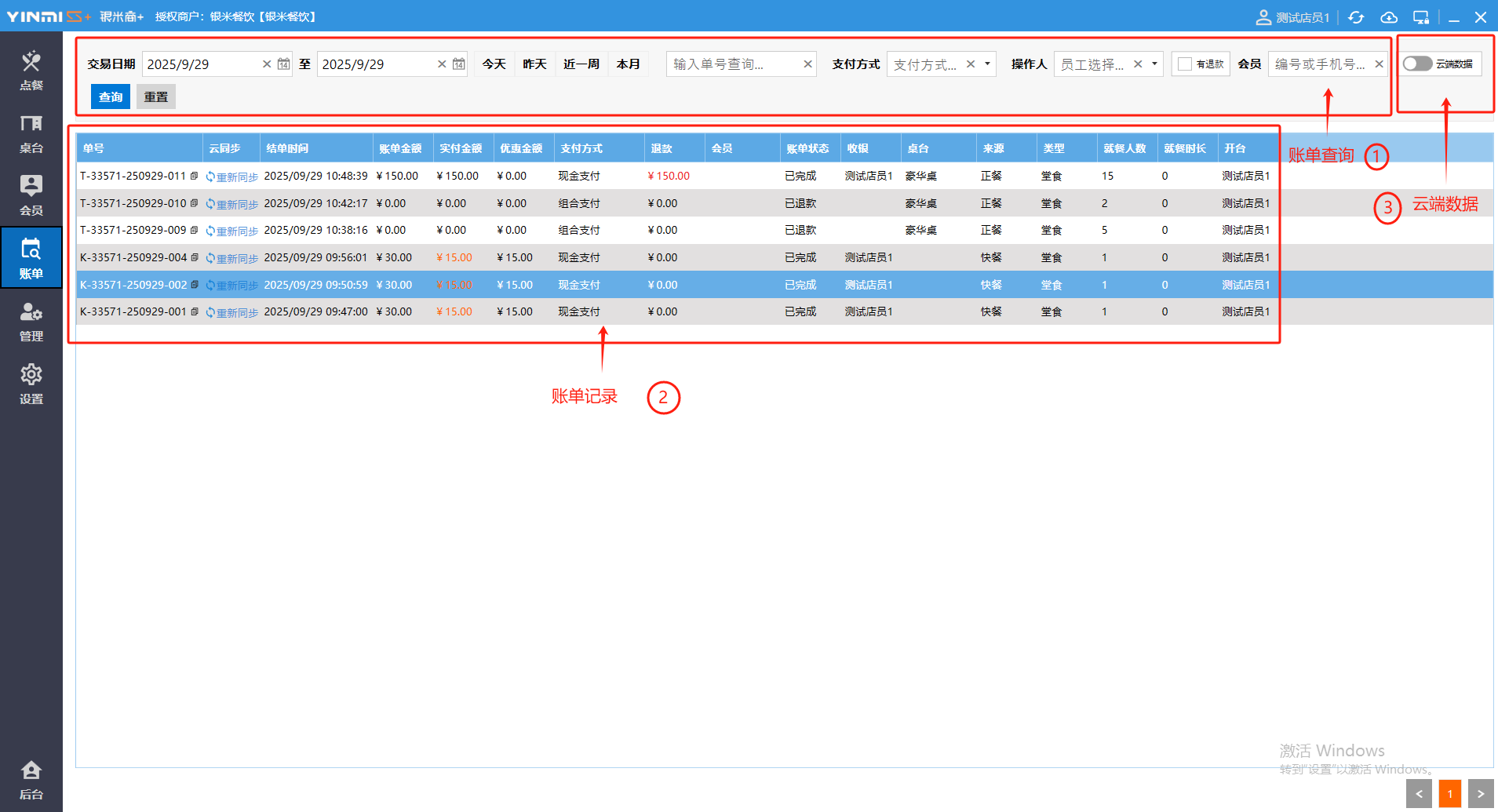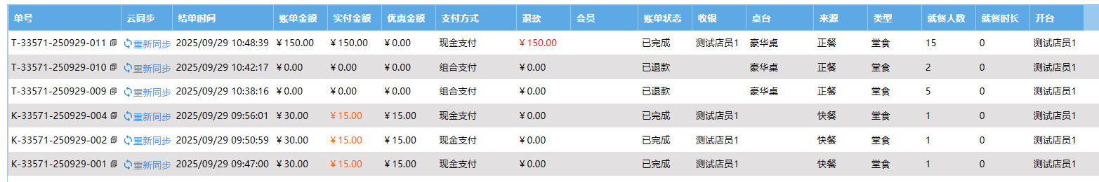 **账单** 账单页面是订单交易完成的最终凭证,清晰展示消费明细和支付详情。包含:账单查询、账单记录、云端数据。 如图所示  一、账单查询 账单查询是通过各类条件快速检索和追溯历史交易记录,查询条件包含:交易日期、订单号、收银员、支付方式、会员编号或手机号,退款。 如图所示  二、账单记录 账单记录是订单交易的数据存档,便于有据可查和财务对账。包含:单号、云同步(同步该笔订单)、结单时间、账单金额、实付金额、优惠金额、支付方式、退款、会员、账单状态、收银员、桌台、来源、类型、就餐人数、就餐时长、开台员。 如图所示  双击单号可显示订单详情。 如图所示  三、云端数据 云端数据是一键实现本地数据与云端服务器的双向同步,确保业务数据实时备份、多端共享并提升系统可靠性。点击云端数据按钮,选择是否开启云端数据。左图为关闭、右图为开启。 如图所示