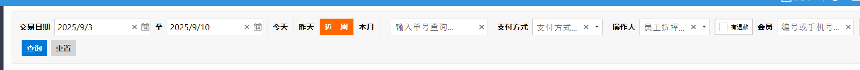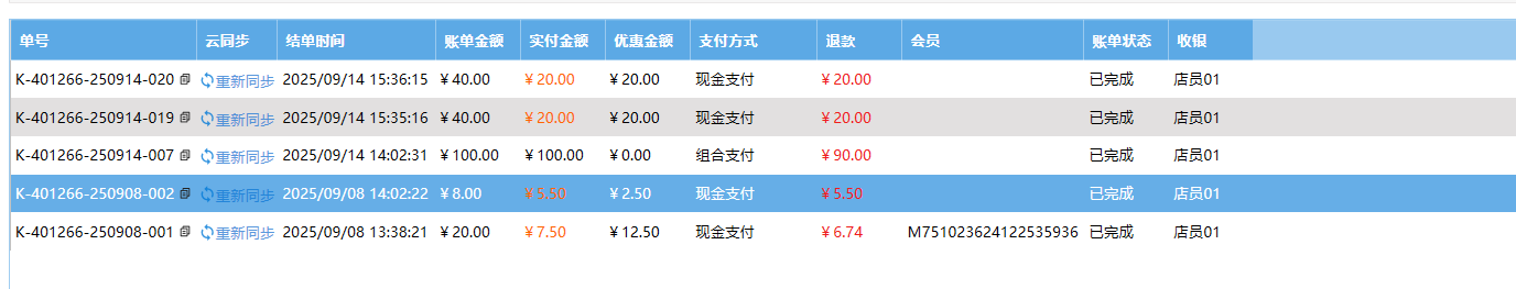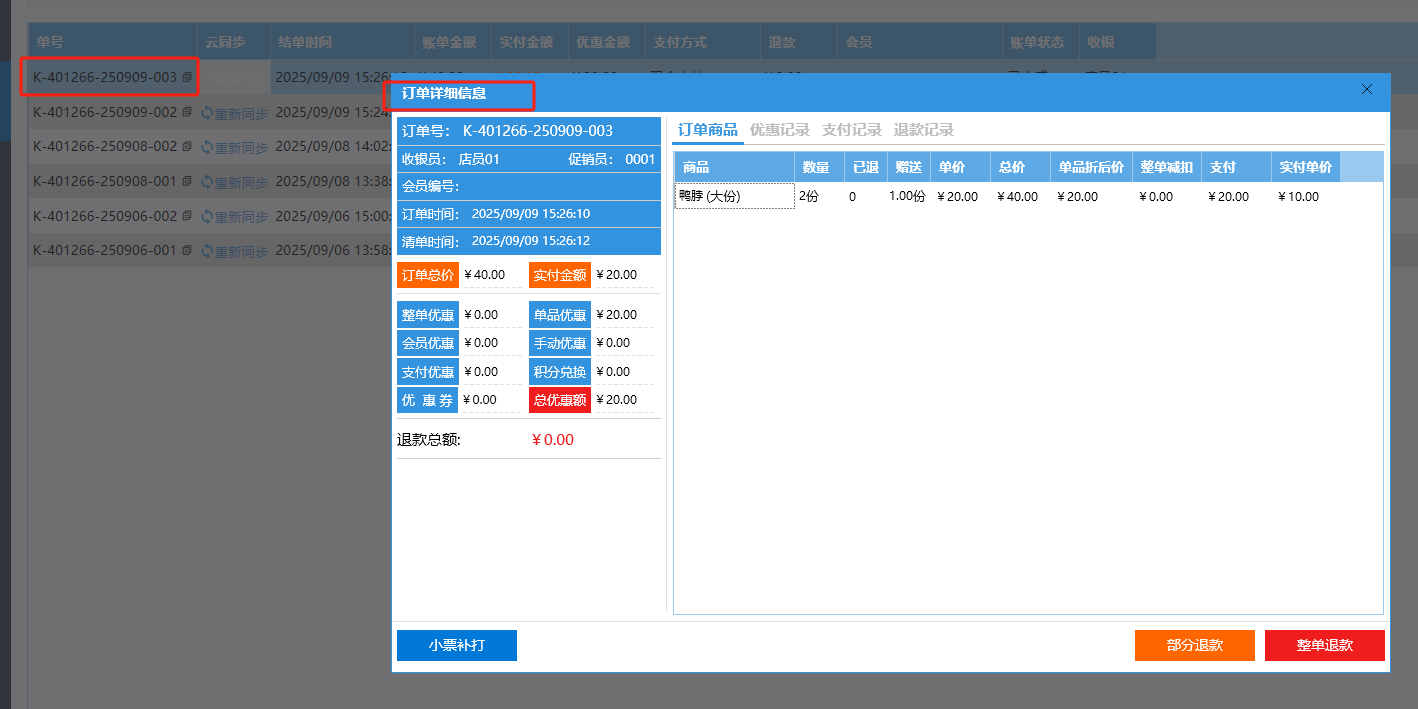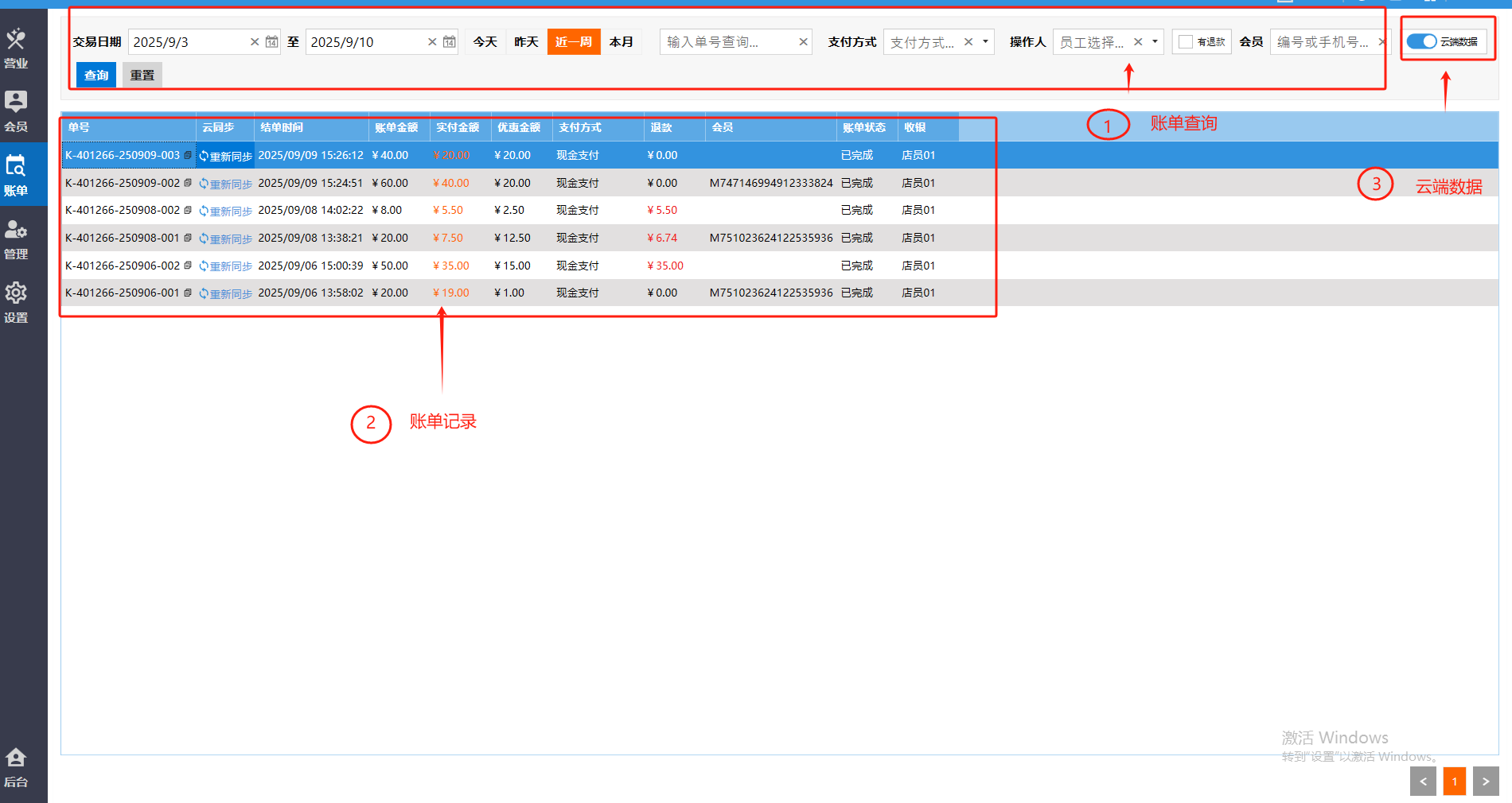 **账单** 账单页面是订单交易完成的最终凭证,清晰展示消费明细和支付详情。包含:账单查询、账单记录、云端数据。 如图所示  一、账单查询 账单查询是通过各类条件快速检索和追溯历史交易记录,查询条件包含:交易日期、订单号、收银员、支付方式、会员编号或手机号,退款。 如图所示  二、账单记录 账单记录是订单交易的数据存档,便于有据可查和财务对账。包含:单号、云同步(同步该笔订单)、结单时间、账单金额、实付金额、优惠金额、支付方式、退款、会员、账单状态、收银员。 如图所示  双击单号可显示订单详情。 如图所示  三、云端数据 云端数据是一键实现本地数据与云端服务器的双向同步,确保业务数据实时备份、多端共享并提升系统可靠性。点击云端数据按钮,选择是否开启云端数据。左图为关闭、右图为开启。 如图所示