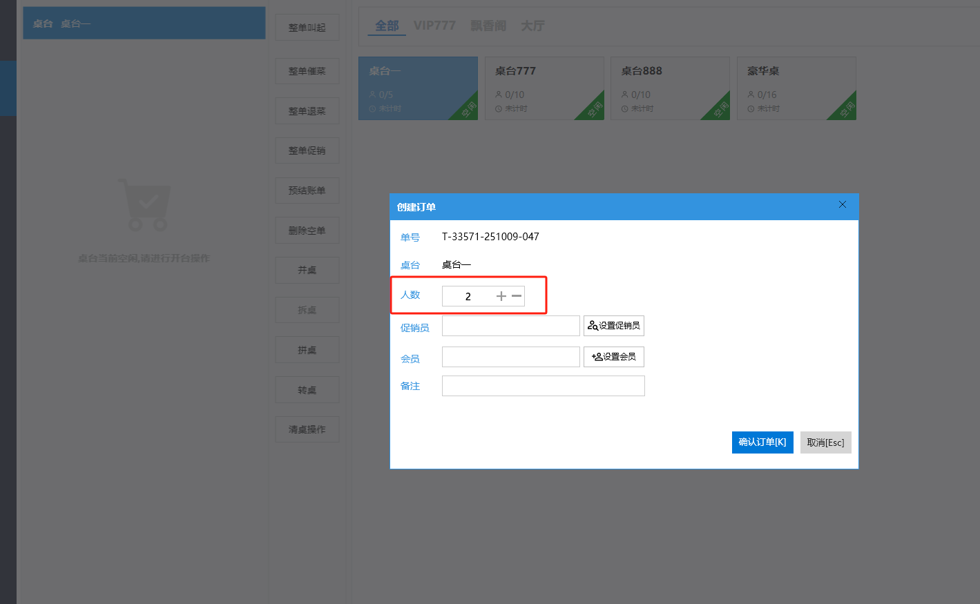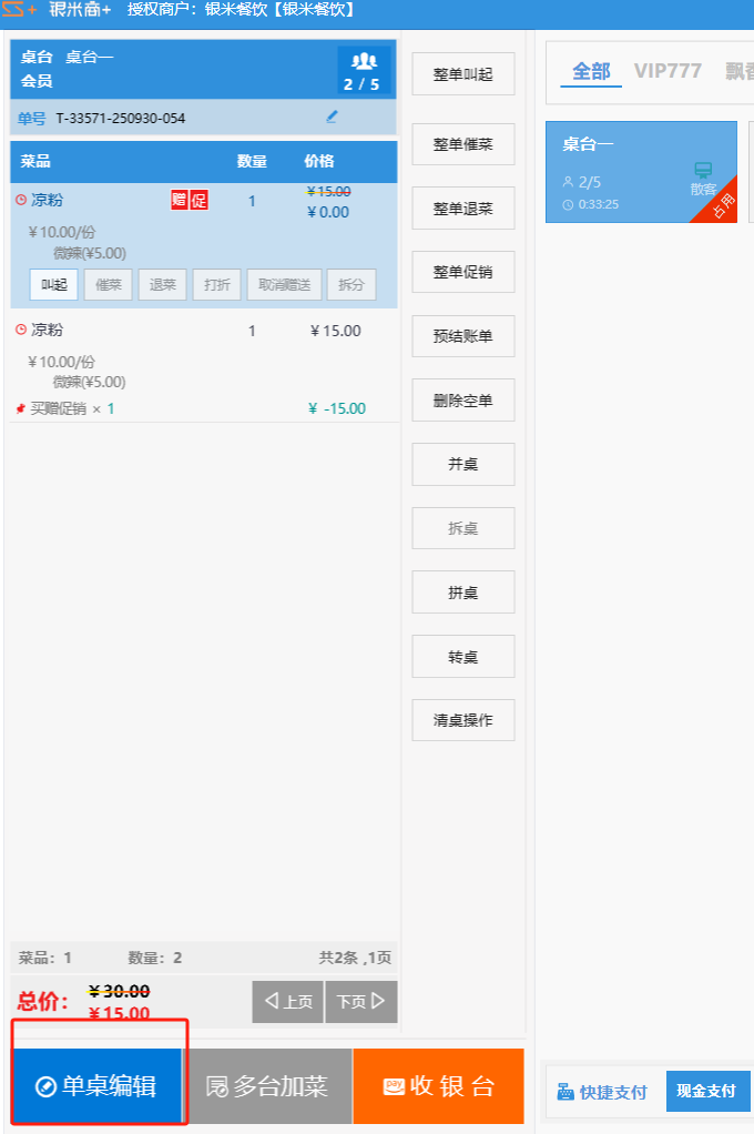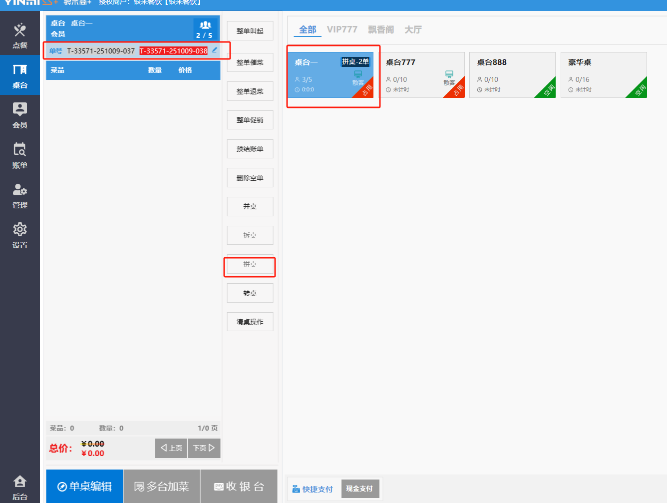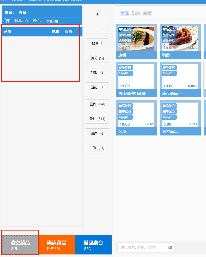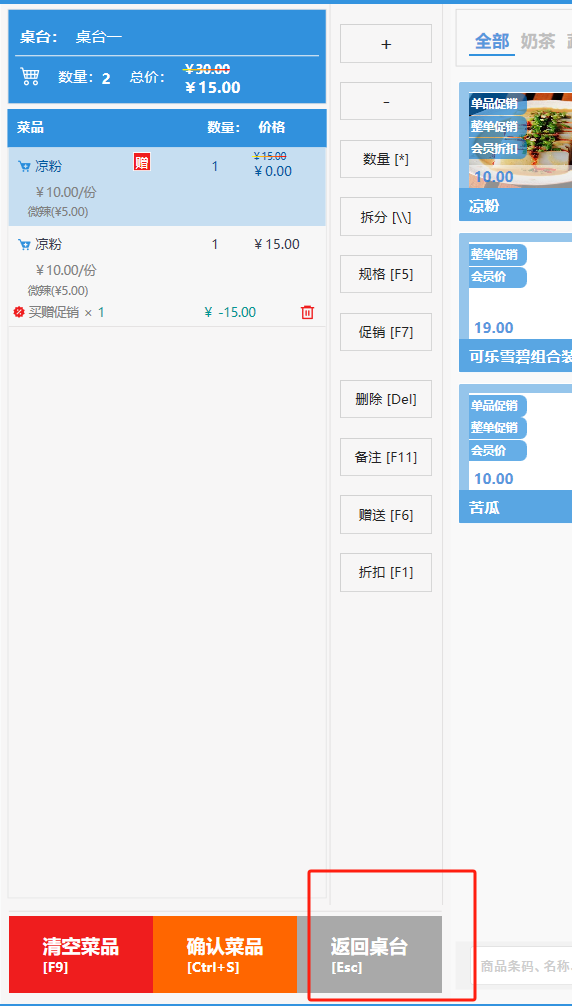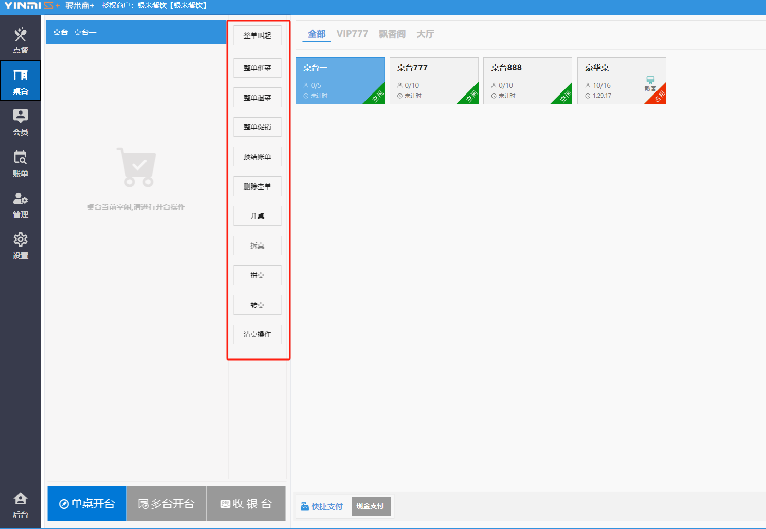 **桌台界面** 桌台:又称之为中餐模式操作界面。用于桌位的开桌、点菜用餐,将餐厅的物理空间和用餐流程数字化,需先在后台-【店铺机构】-【门店桌位】中添加设置好桌位名称、用餐人数,前台下传好数据方可使用。包含 :开台桌台、常用功能、桌台页、开台键、结算键、快捷支付、桌台状态。 如下图所示  一、开台桌台 “开台桌台”是桌台开桌后编辑菜单,并确认菜单的界面,一个集高效录入、灵活修改、智能营销和后厨联动于一体的核心模块。包含:购物车、菜品页、常用功能、清空确认键、搜索栏、临时菜品。 如图所示  1、购物车 购物车是顾客购买菜品的明细展示页面。包括:桌台号、数量、总价、优惠价、菜品明细。  2、菜品页 “菜品页”可显示菜品名称,单价,库存 ,促销活动,会员活动以及购买的数量。可以按分类点菜。 如图所示  3、常用功能 常用功能是为收银员快捷对商品订单进行编辑的常用功能汇总。包含有:加减、数量、规格、促销、删除、备注、赠送、折扣。  A、加减是快捷对菜品数量进行增加或者减少的按钮。如图所示  B、数量是快捷对菜品数量进行设定的按钮。如图所示  C、拆分是快捷对菜品的数量进行拆分的按钮。如图所示  D、规格是快捷编辑菜品的数量和单位的按钮。如图所示  E、促销是快捷对菜品添加、删除或者修改促销活动的按钮。 如图所示  点击菜品促销的红色按钮也可以快捷删除该促销活动。如图所示  F、删除是快捷对菜品进行删除的按钮。如图所示  G、备注是快捷对菜品的特殊要求进行标注。如图所示  H、赠送是快捷对菜品进行免费赠送的按钮。如需取消赠送,再次点击赠送即可 。如图所示  I、折扣是快捷对菜品进行打折优惠的按钮。如图所示  4、清空确认键 “清空确认键”是对编辑好的菜品进行最后确认的操作。包含:清空菜品、确认菜品,返回桌台。 如图所示  A、清空菜品是对编辑好的菜品全部一键删除,方便重新编辑菜品。如图所示  B、确认菜品是对编辑好的菜品进行最后确认。如图所示  如果确认菜品后,需要重新编辑点击“单桌编辑”即可。如图所示  C、返回桌台是直接返回桌台页面,编辑好的菜品都不会保留。如图所示  5、搜索栏 搜索栏是为了快速定位并找到目标菜品,将其添加到订单中,极大提升收银效率,尤其是在无法扫码或记不清条码时。点击搜索栏,输入菜品的条码、名称、拼音码,点击确认即可 。如图所示  如需要删除已搜索菜品,点击“清除筛选条件”即可完成。如图所示  6、临时菜品 点击“添加临时菜品”,可添加临时菜品名称、价格,商品页可出现该商品进行售卖,售卖结束点击该菜品右上角的“X“即可删除该菜品。 如图所示   二,常用功能 “常用功能”是桌台的日常运营中的常见需求快捷处理功能。包含:整单叫起、整单催菜、整单退菜、整单促销、预结账单、删除空单、并桌、拆桌、拼桌、转桌、清桌。 如图所示  1、整单叫起 “整单叫起”就是把全部待叫的菜品进行厨打,通知厨房可以出菜。 如图所示  2、整单催菜 “整单催菜”是再次把整单的菜品再次厨打,催促厨房加快菜的出品。 如图所示  3、整单退菜 “整单退菜”是对当前桌台进行整单退菜,删除单据并把桌台状态改为空闲状态。包含:退还库存和报损。 如图所示  4、整单促销 “整单促销”是对当前桌菜品进行整单促销。 如图所示  5、预结账单 “预结账单”是对当前桌台打印预结账单并把桌位的改预结状态。 如图所示  6、删除空单 “删除空单”是把当前已开台并没有点餐的桌位状态,改为空闲。 如图所示  7、并桌 “并桌”是两桌或两桌以上的桌台合并在同一个桌台上,可以统一点餐、统一结账。并桌的桌台,可以选择单台加菜或者是多台加菜;结账时,多可以张已经开的台一起结算,也可以单独结账。 如图所示  8、拆桌 “拆桌”是对处于并桌状态的桌台进行拆桌。在主台上进行拆桌时,会将所有的桌台全部拆桌,取消并桌的状态;在并台上进行拆桌时,会对当前桌台拆桌。 如图所示  9、拼桌 “拼桌”是两桌的客人合并坐在同一个餐桌上,分开点菜,分开结算。 如图所示  10、转桌 “转桌”是把当前桌台的菜品转到别的桌台上,并清空当前桌位状态。 如图所示  11、清桌 “清桌”是并桌的桌台结算后,当前桌位改为“待清”状态,清桌功能就是等服务员清理后,把状态改为“空闲”状态。 如图所示  三、桌台页 “桌台页”是整个桌台状态的展示页面。包含:全部、空闲、占用、预结、待清。 如图所示  四、开台键 “桌台开台”就是“为新客人创建消费档案,开始记账”。是所有后续操作(点菜、加菜、结账等)的基础前提,相当于餐厅接待流程的“启动键”。添加:人数、促销员、会员、备注。点击“确认订单”即可。 如图所示  1、设置就餐人数是根据桌台的接待人数范围添加就餐的人数。如图所示  2、设置促销员是根据桌台要求添加促销员。如无需促销员,点击“清除”即可。如图所示  3、设置会员是根据要求添加会员信息。如无需会员,点击“清除”即可。**注意:选择是否使用单品会员价。** 如图所示  4、备注是根据顾客需要添加注意事项,如图所示  五、结算键 结算键是作为收银流程的最终确认和付款执行界面,完成从商品清单到资金收讫的最终转换。包含有:支付方式、