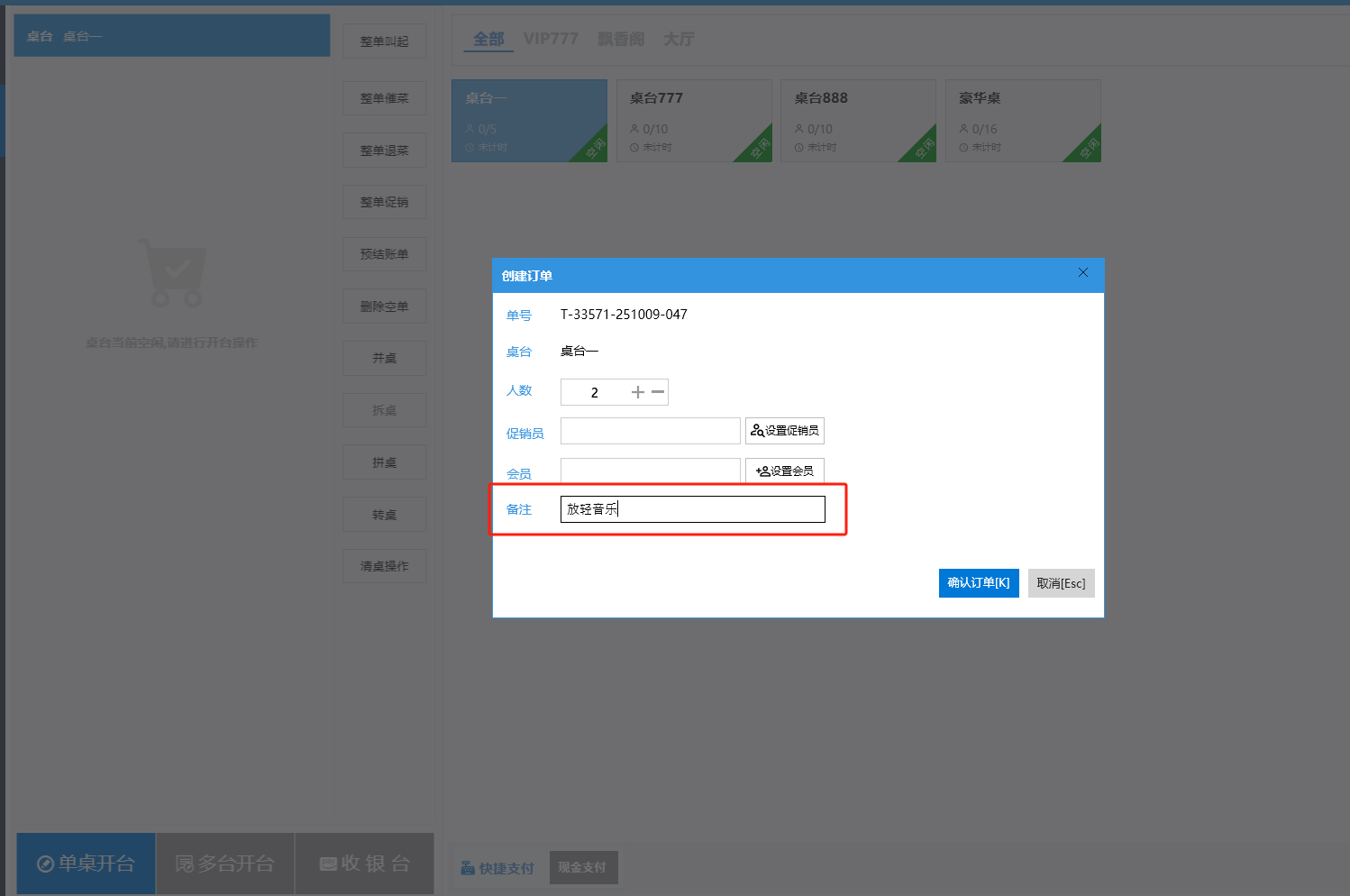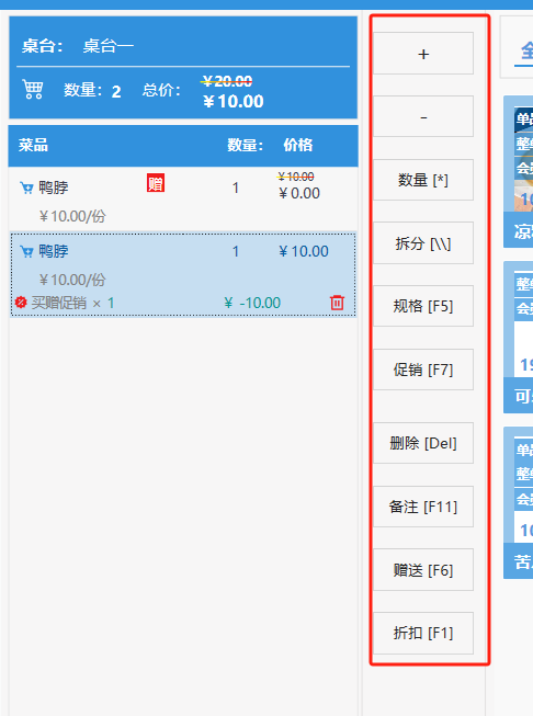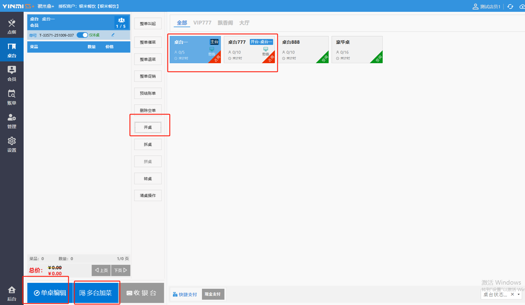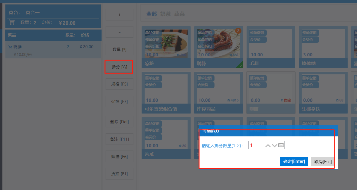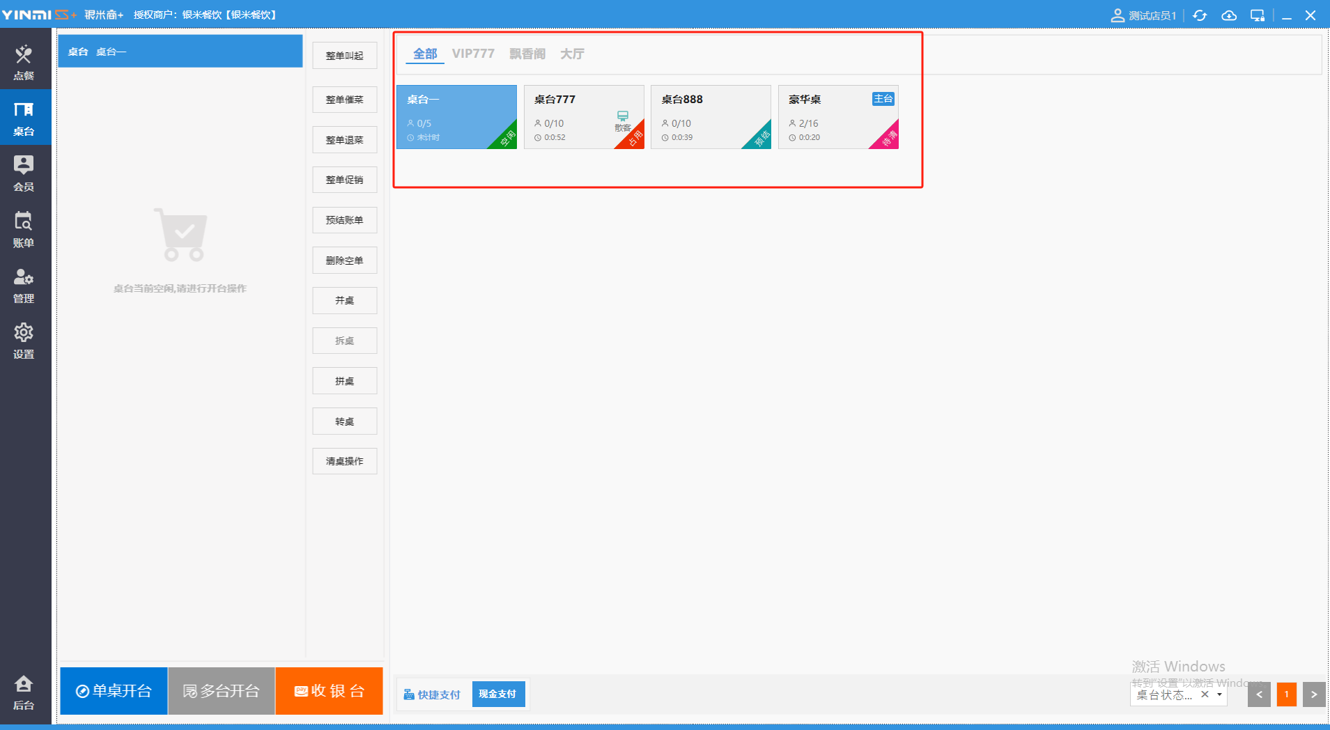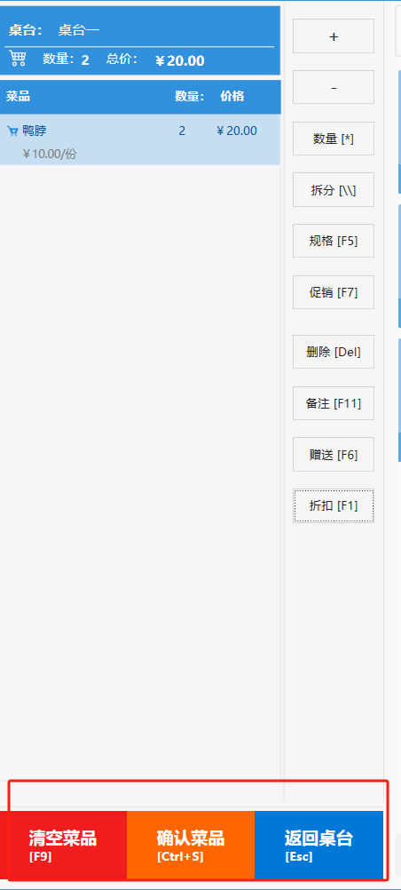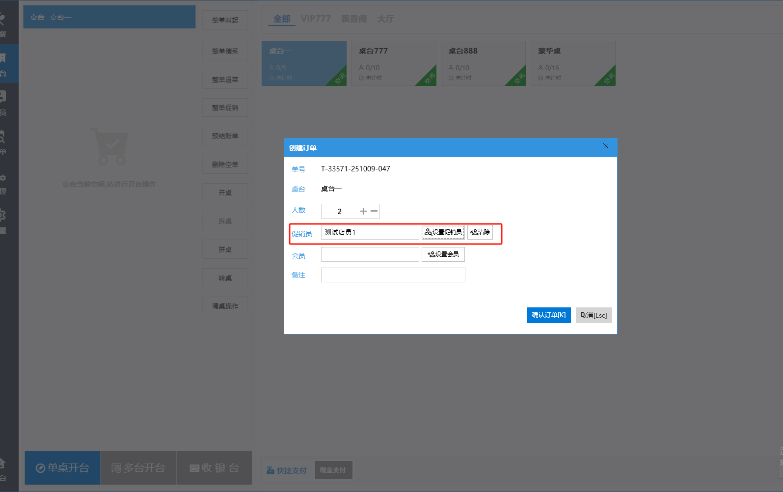 **桌台界面** 桌台:又称之为中餐模式操作界面。用于桌位的开桌、点菜用餐,将餐厅的物理空间和用餐流程数字化,需先在后台-【店铺机构】-【门店桌位】中添加设置好桌位名称、用餐人数,前台下传好数据方可使用。包含 :开台桌台、常用功能、桌台页、开台键、结算键、快捷支付、桌台状态。 如下图所示  一、开台桌台 “开台桌台”是桌台开桌后编辑菜单,并确认菜单的界面,一个集高效录入、灵活修改、智能营销和后厨联动于一体的核心模块。包含:购物车、菜品页、常用功能、清空确认键、搜索栏、临时菜品。 如图所示  1、购物车 购物车是顾客购买菜品的明细展示页面。包括:桌台号、数量、总价、优惠价、菜品明细。  2、菜品页 “菜品页”可显示菜品名称,单价,库存 ,促销活动,会员活动以及购买的数量。可以按分类点菜。 如图所示  3、常用功能 常用功能是为收银员快捷对商品订单进行编辑的常用功能汇总。包含有:加减、数量、规格、促销、删除、备注、赠送、折扣。  A、加减是快捷对菜品数量进行增加或者减少的按钮。如图所示  B、数量是快捷对菜品数量进行设定的按钮。如图所示  C、拆分是快捷对菜品的数量进行拆分的按钮。如图所示  D、规格是快捷编辑菜品的数量和单位的按钮。如图所示  E、促销是快捷对菜品添加、删除或者修改促销活动的按钮。 如图所示  点击菜品促销的红色按钮也可以快捷删除该促销活动。如图所示  F、删除是快捷对菜品进行删除的按钮。如图所示  G、备注是快捷对菜品的特殊要求进行标注。如图所示  H、赠送是快捷对菜品进行免费赠送的按钮。如需取消赠送,再次点击赠送即可 。如图所示  I、折扣是快捷对菜品进行打折优惠的按钮。如图所示  4、清空确认键 “清空确认键”是对编辑好的菜品进行最后确认的操作。包含:清空菜品、确认菜品,返回桌台。 如图所示  A、清空菜品是对编辑好的菜品全部一键删除,方便重新编辑菜品。如图所示  B、确认菜品是对编辑好的菜品进行最后确认。如图所示  如果确认菜品后,需要重新编辑点击“单桌编辑”即可。如图所示  C、返回桌台是直接返回桌台页面,编辑好的菜品都不会保留。如图所示  5、搜索栏 搜索栏是为了快速定位并找到目标菜品,将其添加到订单中,极大提升收银效率,尤其是在无法扫码或记不清条码时。点击搜索栏,输入菜品的条码、名称、拼音码,点击确认即可 。如图所示  如需要删除已搜索菜品,点击“清除筛选条件”即可完成。如图所示  6、临时菜品 点击“添加临时菜品”,可添加临时菜品名称、价格,商品页可出现该商品进行售卖,售卖结束点击该菜品右上角的“X“即可删除该菜品。 如图所示   二,常用功能 “常用功能”是桌台的日常运营中的常见需求快捷处理功能。包含:整单叫起、整单催菜、整单退菜、整单促销、预结账单、删除空单、并桌、拆桌、拼桌、转桌、清桌。 如图所示  1、整单叫起 “整单叫起”就是把全部待叫的菜品进行厨打,通知厨房可以出菜。 如图所示  2、整单催菜 “整单催菜”是再次把整单的菜品再次厨打,催促厨房加快菜的出品。 如图所示  3、整单退菜 “整单退菜”是对当前桌台进行整单退菜,删除单据并把桌台状态改为空闲状态。包含:退还库存和报损。 如图所示  4、整单促销 “整单促销”是对当前桌菜品进行整单促销。 如图所示  5、预结账单 “预结账单”是对当前桌台打印预结账单并把桌位的改预结状态。 如图所示  6、删除空单 “删除空单”是把当前已开台并没有点餐的桌位状态,改为空闲。 如图所示  7、并桌 “并桌”是两桌或两桌以上的桌台合并在同一个桌台上,可以统一点餐、统一结账。并桌的桌台,可以选择单台加菜或者是多台加菜;结账时,多可以张已经开的台一起结算,也可以单独结账。 如图所示  8、拆桌 “拆桌”是对处于并桌状态的桌台进行拆桌。在主台上进行拆桌时,会将所有的桌台全部拆桌,取消并桌的状态;在并台上进行拆桌时,会对当前桌台拆桌。 如图所示  9、拼桌 “拼桌”是两桌的客人合并坐在同一个餐桌上,分开点菜,分开结算。 如图所示  10、转桌 “转桌”是把当前桌台的菜品转到别的桌台上,并清空当前桌位状态。 如图所示  11、清桌 “清桌”是并桌的桌台结算后,当前桌位改为“待清”状态,清桌功能就是等服务员清理后,把状态改为“空闲”状态。 如图所示  三、桌台页 “桌台页”是整个桌台状态的展示页面。包含:全部、空闲、占用、预结、待清。 如图所示  四、开台键 “桌台开台”就是“为新客人创建消费档案,开始记账”。是所有后续操作(点菜、加菜、结账等)的基础前提,相当于餐厅接待流程的“启动键”。添加:人数、促销员、会员、备注。点击“确认订单”即可。 如图所示  1、设置就餐人数是根据桌台的接待人数范围添加就餐的人数。如图所示  2、设置促销员是根据桌台要求添加促销员。如无需促销员,点击“清除”即可。如图所示  3、设置会员是根据要求添加会员信息。如无需会员,点击“清除”即可。**注意:选择是否使用单品会员价。** 如图所示  4、备注是根据顾客需要添加注意事项,如图所示  五、结算键 结算键是作为收银流程的最终确认和付款执行界面,完成从商品清单到资金收讫的最终转换。包含有:支付方式、