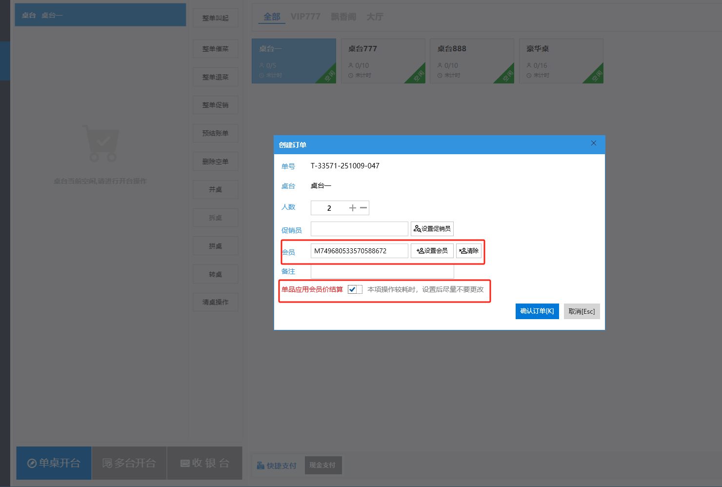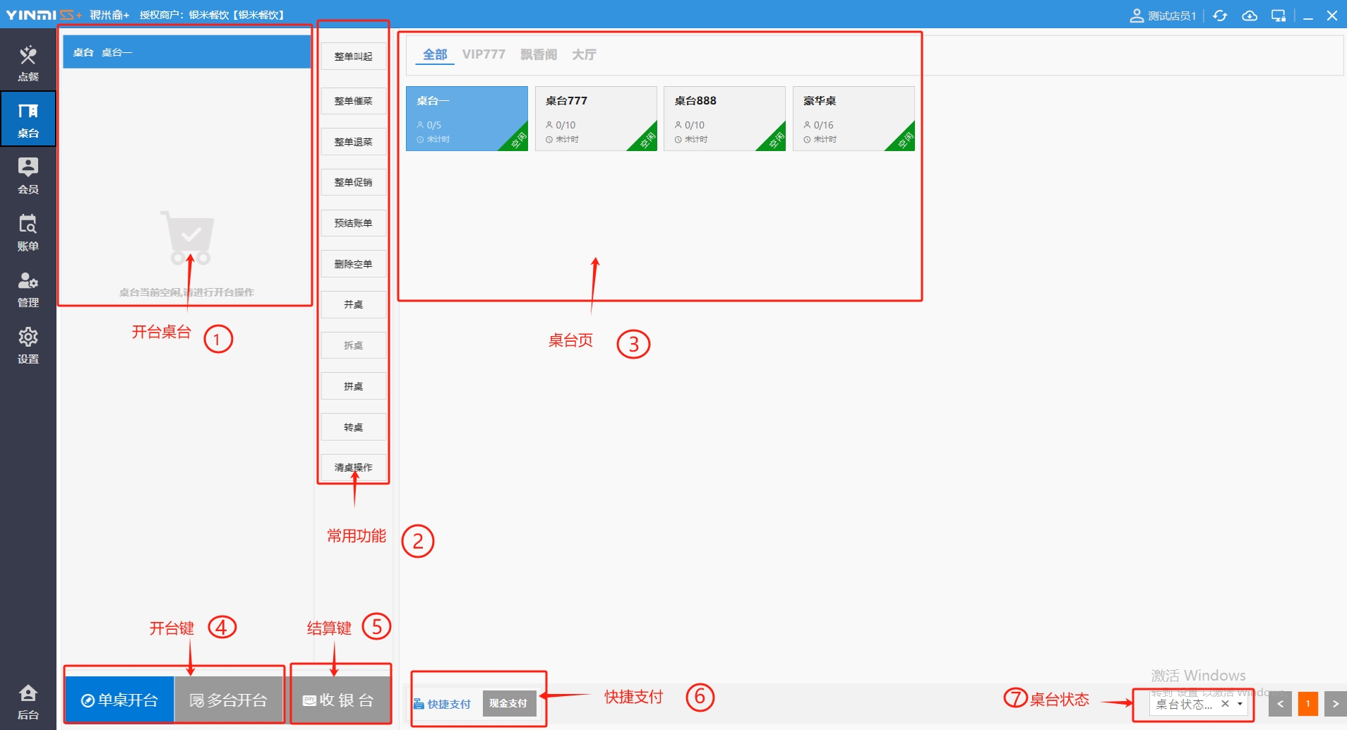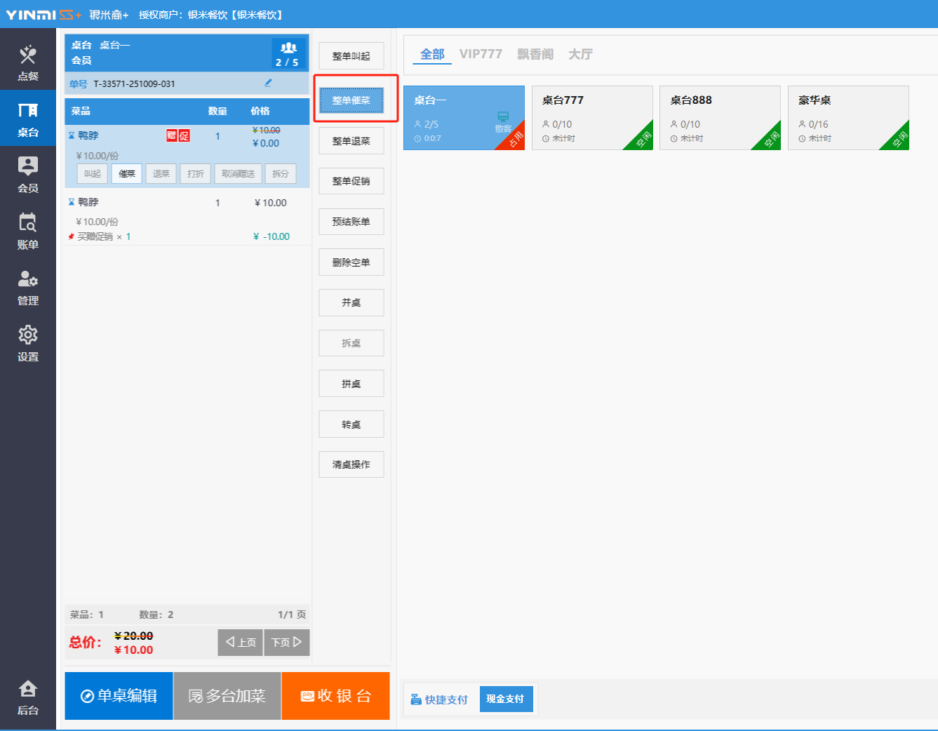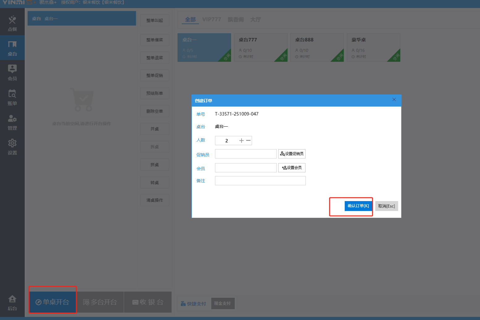 **桌台界面** 桌台:又称之为中餐模式操作界面。用于桌位的开桌、点菜用餐,将餐厅的物理空间和用餐流程数字化,需先在后台-【店铺机构】-【门店桌位】中添加设置好桌位名称、用餐人数,前台下传好数据方可使用。包含 :开台桌台、常用功能、桌台页、开台键、结算键、快捷支付、桌台状态。 如下图所示  一、开台桌台 “开台桌台”是桌台开桌后编辑菜单,并确认菜单的界面,一个集高效录入、灵活修改、智能营销和后厨联动于一体的核心模块。包含:购物车、菜品页、常用功能、清空确认键、搜索栏、临时菜品。 如图所示  1、购物车 购物车是顾客购买菜品的明细展示页面。包括:桌台号、数量、总价、优惠价、菜品明细。  2、菜品页 “菜品页”可显示菜品名称,单价,库存 ,促销活动,会员活动以及购买的数量。可以按分类点菜。 如图所示  3、常用功能 常用功能是为收银员快捷对商品订单进行编辑的常用功能汇总。包含有:加减、数量、规格、促销、删除、备注、赠送、折扣。  A、加减是快捷对菜品数量进行增加或者减少的按钮。如图所示  B、数量是快捷对菜品数量进行设定的按钮。如图所示  C、拆分是快捷对菜品的数量进行拆分的按钮。如图所示  D、规格是快捷编辑菜品的数量和单位的按钮。如图所示  E、促销是快捷对菜品添加、删除或者修改促销活动的按钮。 如图所示  点击菜品促销的红色按钮也可以快捷删除该促销活动。如图所示  F、删除是快捷对菜品进行删除的按钮。如图所示  G、备注是快捷对菜品的特殊要求进行标注。如图所示  H、赠送是快捷对菜品进行免费赠送的按钮。如需取消赠送,再次点击赠送即可 。如图所示  I、折扣是快捷对菜品进行打折优惠的按钮。如图所示  4、清空确认键 “清空确认键”是对编辑好的菜品进行最后确认的操作。包含:清空菜品、确认菜品,返回桌台。 如图所示  A、清空菜品是对编辑好的菜品全部一键删除,方便重新编辑菜品。如图所示  B、确认菜品是对编辑好的菜品进行最后确认。如图所示  如果确认菜品后,需要重新编辑点击“单桌编辑”即可。如图所示  C、返回桌台是直接返回桌台页面,编辑好的菜品都不会保留。如图所示  5、搜索栏 搜索栏是为了快速定位并找到目标菜品,将其添加到订单中,极大提升收银效率,尤其是在无法扫码或记不清条码时。点击搜索栏,输入菜品的条码、名称、拼音码,点击确认即可 。如图所示  如需要删除已搜索菜品,点击“清除筛选条件”即可完成。如图所示  6、临时菜品 点击“添加临时菜品”,可添加临时菜品名称、价格,商品页可出现该商品进行售卖,售卖结束点击该菜品右上角的“X“即可删除该菜品。 如图所示   二,常用功能 “常用功能”是桌台的日常运营中的常见需求快捷处理功能。包含:整单叫起、整单催菜、整单退菜、整单促销、预结账单、删除空单、并桌、拆桌、拼桌、转桌、清桌。 如图所示  1、整单叫起 “整单叫起”就是把全部待叫的菜品进行厨打,通知厨房可以出菜。 如图所示  2、整单催菜 “整单催菜”是再次把整单的菜品再次厨打,催促厨房加快菜的出品。 如图所示  3、整单退菜 “整单退菜”是对当前桌台进行整单退菜,删除单据并把桌台状态改为空闲状态。包含:退还库存和报损。 如图所示  4、整单促销 “整单促销”是对当前桌菜品进行整单促销。 如图所示  5、预结账单 “预结账单”是对当前桌台打印预结账单并把桌位的改预结状态。 如图所示  6、删除空单 “删除空单”是把当前已开台并没有点餐的桌位状态,改为空闲。 如图所示  7、并桌 “并桌”是两桌或两桌以上的桌台合并在同一个桌台上,可以统一点餐、统一结账。并桌的桌台,可以选择单台加菜或者是多台加菜;结账时,多可以张已经开的台一起结算,也可以单独结账。 如图所示  8、拆桌 “拆桌”是对处于并桌状态的桌台进行拆桌。在主台上进行拆桌时,会将所有的桌台全部拆桌,取消并桌的状态;在并台上进行拆桌时,会对当前桌台拆桌。 如图所示  9、拼桌 “拼桌”是两桌的客人合并坐在同一个餐桌上,分开点菜,分开结算。 如图所示  10、转桌 “转桌”是把当前桌台的菜品转到别的桌台上,并清空当前桌位状态。 如图所示  11、清桌 “清桌”是并桌的桌台结算后,当前桌位改为“待清”状态,清桌功能就是等服务员清理后,把状态改为“空闲”状态。 如图所示  三、桌台页 “桌台页”是整个桌台状态的展示页面。包含:全部、空闲、占用、预结、待清。 如图所示  四、开台键 “桌台开台”就是“为新客人创建消费档案,开始记账”。是所有后续操作(点菜、加菜、结账等)的基础前提,相当于餐厅接待流程的“启动键”。添加:人数、促销员、会员、备注。点击“确认订单”即可。 如图所示  1、设置就餐人数是根据桌台的接待人数范围添加就餐的人数。如图所示  2、设置促销员是根据桌台要求添加促销员。如无需促销员,点击“清除”即可。如图所示  3、设置会员是根据要求添加会员信息。如无需会员,点击“清除”即可。**注意:选择是否使用单品会员价。** 如图所示  4、备注是根据顾客需要添加注意事项,如图所示  五、结算键 结算键是作为收银流程的最终确认和付款执行界面,完成从商品清单到资金收讫的最终转换。包含有:支付方式、