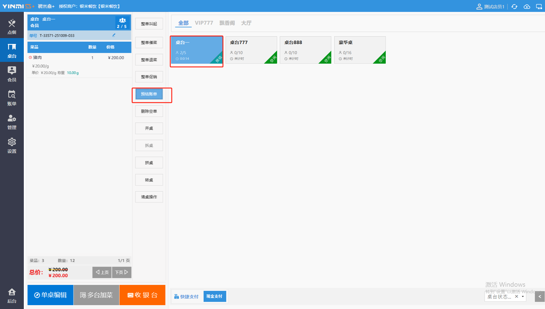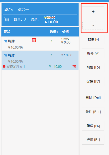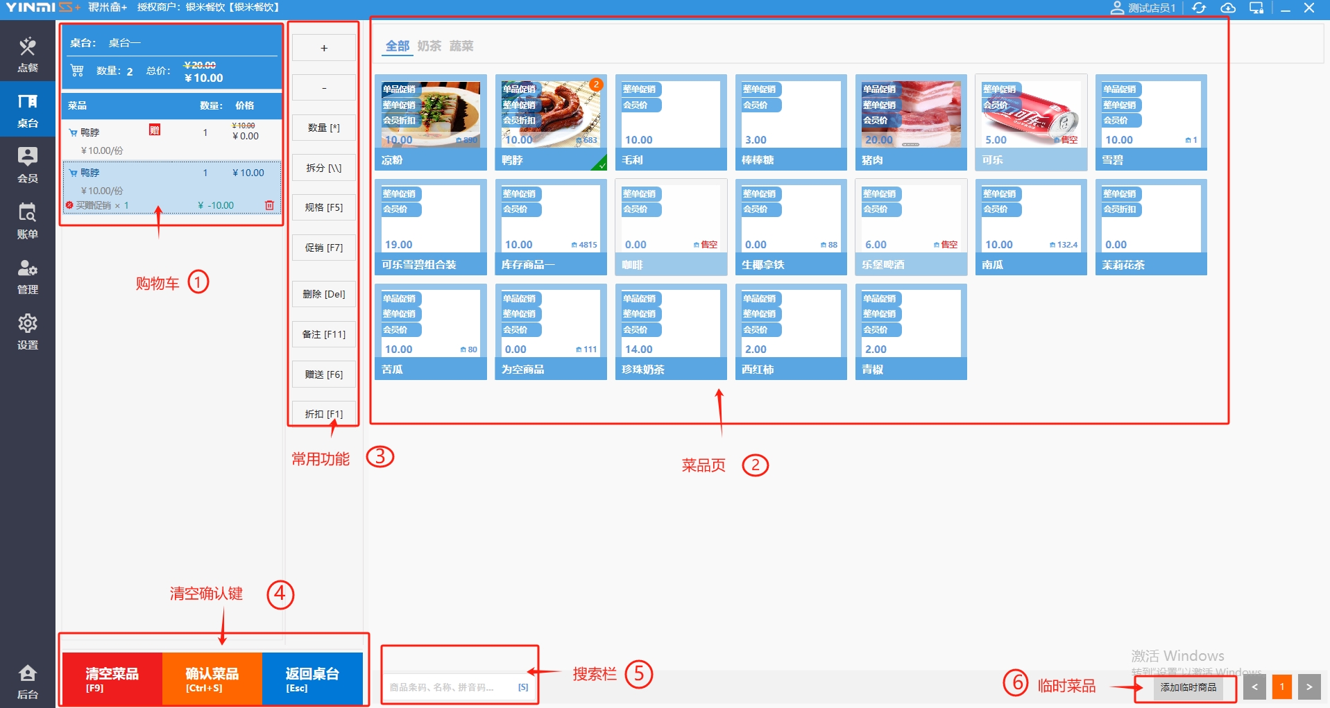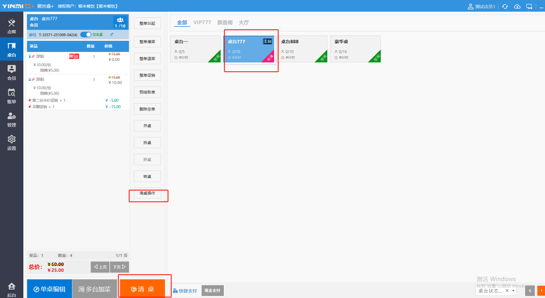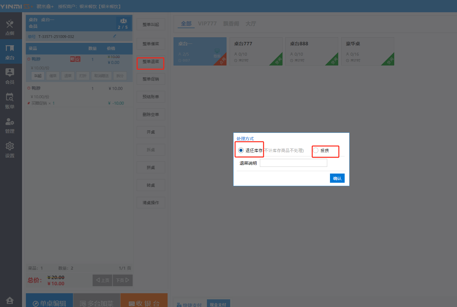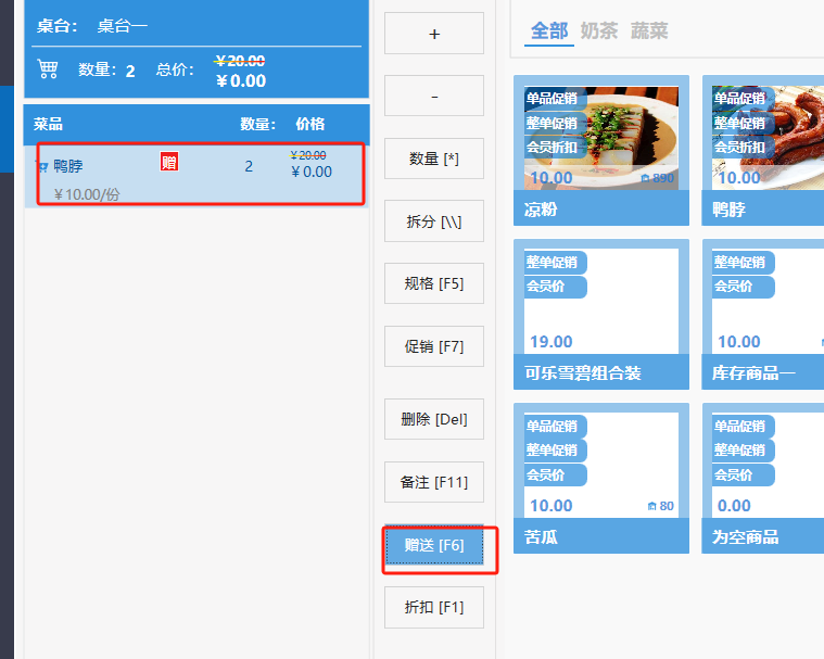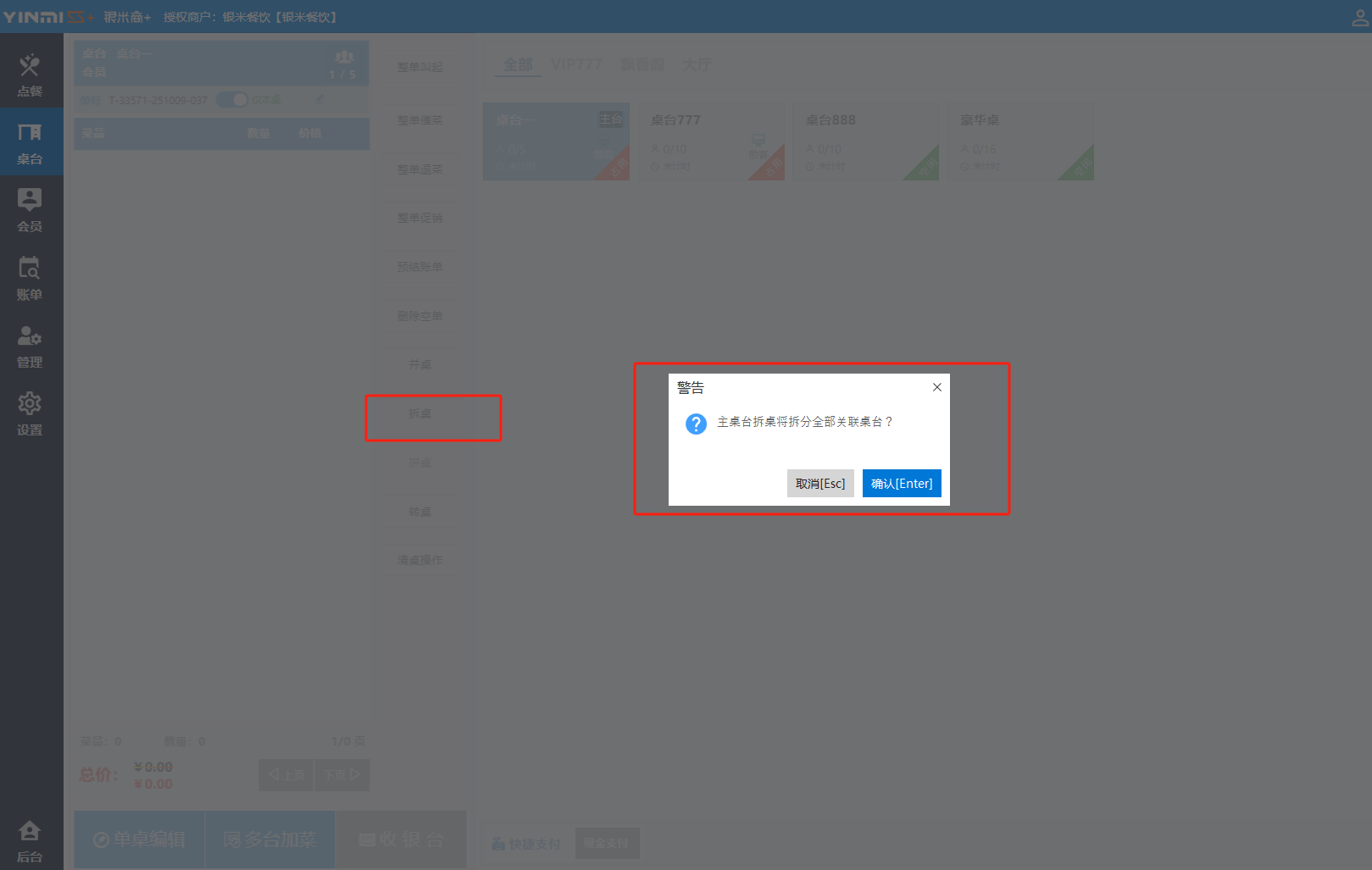 **桌台界面** 桌台:又称之为中餐模式操作界面。用于桌位的开桌、点菜用餐,将餐厅的物理空间和用餐流程数字化,需先在后台-【店铺机构】-【门店桌位】中添加设置好桌位名称、用餐人数,前台下传好数据方可使用。包含 :开台桌台、常用功能、桌台页、开台键、结算键、快捷支付、桌台状态。 如下图所示  一、开台桌台 “开台桌台”是桌台开桌后编辑菜单,并确认菜单的界面,一个集高效录入、灵活修改、智能营销和后厨联动于一体的核心模块。包含:购物车、菜品页、常用功能、清空确认键、搜索栏、临时菜品。 如图所示  1、购物车 购物车是顾客购买菜品的明细展示页面。包括:桌台号、数量、总价、优惠价、菜品明细。  2、菜品页 “菜品页”可显示菜品名称,单价,库存 ,促销活动,会员活动以及购买的数量。可以按分类点菜。 如图所示  3、常用功能 常用功能是为收银员快捷对商品订单进行编辑的常用功能汇总。包含有:加减、数量、规格、促销、删除、备注、赠送、折扣。  A、加减是快捷对菜品数量进行增加或者减少的按钮。如图所示  B、数量是快捷对菜品数量进行设定的按钮。如图所示  C、拆分是快捷对菜品的数量进行拆分的按钮。如图所示  D、规格是快捷编辑菜品的数量和单位的按钮。如图所示  E、促销是快捷对菜品添加、删除或者修改促销活动的按钮。 如图所示  点击菜品促销的红色按钮也可以快捷删除该促销活动。如图所示  F、删除是快捷对菜品进行删除的按钮。如图所示  G、备注是快捷对菜品的特殊要求进行标注。如图所示  H、赠送是快捷对菜品进行免费赠送的按钮。如需取消赠送,再次点击赠送即可 。如图所示  I、折扣是快捷对菜品进行打折优惠的按钮。如图所示  4、清空确认键 “清空确认键”是对编辑好的菜品进行最后确认的操作。包含:清空菜品、确认菜品,返回桌台。 如图所示  A、清空菜品是对编辑好的菜品全部一键删除,方便重新编辑菜品。如图所示  B、确认菜品是对编辑好的菜品进行最后确认。如图所示  如果确认菜品后,需要重新编辑点击“单桌编辑”即可。如图所示  C、返回桌台是直接返回桌台页面,编辑好的菜品都不会保留。如图所示  5、搜索栏 搜索栏是为了快速定位并找到目标菜品,将其添加到订单中,极大提升收银效率,尤其是在无法扫码或记不清条码时。点击搜索栏,输入菜品的条码、名称、拼音码,点击确认即可 。如图所示  如需要删除已搜索菜品,点击“清除筛选条件”即可完成。如图所示  6、临时菜品 点击“添加临时菜品”,可添加临时菜品名称、价格,商品页可出现该商品进行售卖,售卖结束点击该菜品右上角的“X“即可删除该菜品。 如图所示   二,常用功能 “常用功能”是桌台的日常运营中的常见需求快捷处理功能。包含:整单叫起、整单催菜、整单退菜、整单促销、预结账单、删除空单、并桌、拆桌、拼桌、转桌、清桌。 如图所示  1、整单叫起 “整单叫起”就是把全部待叫的菜品进行厨打,通知厨房可以出菜。 如图所示  2、整单催菜 “整单催菜”是再次把整单的菜品再次厨打,催促厨房加快菜的出品。 如图所示  3、整单退菜 “整单退菜”是对当前桌台进行整单退菜,删除单据并把桌台状态改为空闲状态。包含:退还库存和报损。 如图所示  4、整单促销 “整单促销”是对当前桌菜品进行整单促销。 如图所示  5、预结账单 “预结账单”是对当前桌台打印预结账单并把桌位的改预结状态。 如图所示  6、删除空单 “删除空单”是把当前已开台并没有点餐的桌位状态,改为空闲。 如图所示  7、并桌 “并桌”是两桌或两桌以上的桌台合并在同一个桌台上,可以统一点餐、统一结账。并桌的桌台,可以选择单台加菜或者是多台加菜;结账时,多可以张已经开的台一起结算,也可以单独结账。 如图所示  8、拆桌 “拆桌”是对处于并桌状态的桌台进行拆桌。在主台上进行拆桌时,会将所有的桌台全部拆桌,取消并桌的状态;在并台上进行拆桌时,会对当前桌台拆桌。 如图所示  9、拼桌 “拼桌”是两桌的客人合并坐在同一个餐桌上,分开点菜,分开结算。 如图所示  10、转桌 “转桌”是把当前桌台的菜品转到别的桌台上,并清空当前桌位状态。 如图所示  11、清桌 “清桌”是并桌的桌台结算后,当前桌位改为“待清”状态,清桌功能就是等服务员清理后,把状态改为“空闲”状态。 如图所示  三、桌台页 “桌台页”是整个桌台状态的展示页面。包含:全部、空闲、占用、预结、待清。 如图所示  四、开台键 “桌台开台”就是“为新客人创建消费档案,开始记账”。是所有后续操作(点菜、加菜、结账等)的基础前提,相当于餐厅接待流程的“启动键”。添加:人数、促销员、会员、备注。点击“确认订单”即可。 如图所示  1、设置就餐人数是根据桌台的接待人数范围添加就餐的人数。如图所示  2、设置促销员是根据桌台要求添加促销员。如无需促销员,点击“清除”即可。如图所示  3、设置会员是根据要求添加会员信息。如无需会员,点击“清除”即可。**注意:选择是否使用单品会员价。** 如图所示  4、备注是根据顾客需要添加注意事项,如图所示  五、结算键 结算键是作为收银流程的最终确认和付款执行界面,完成从商品清单到资金收讫的最终转换。包含有:支付方式、