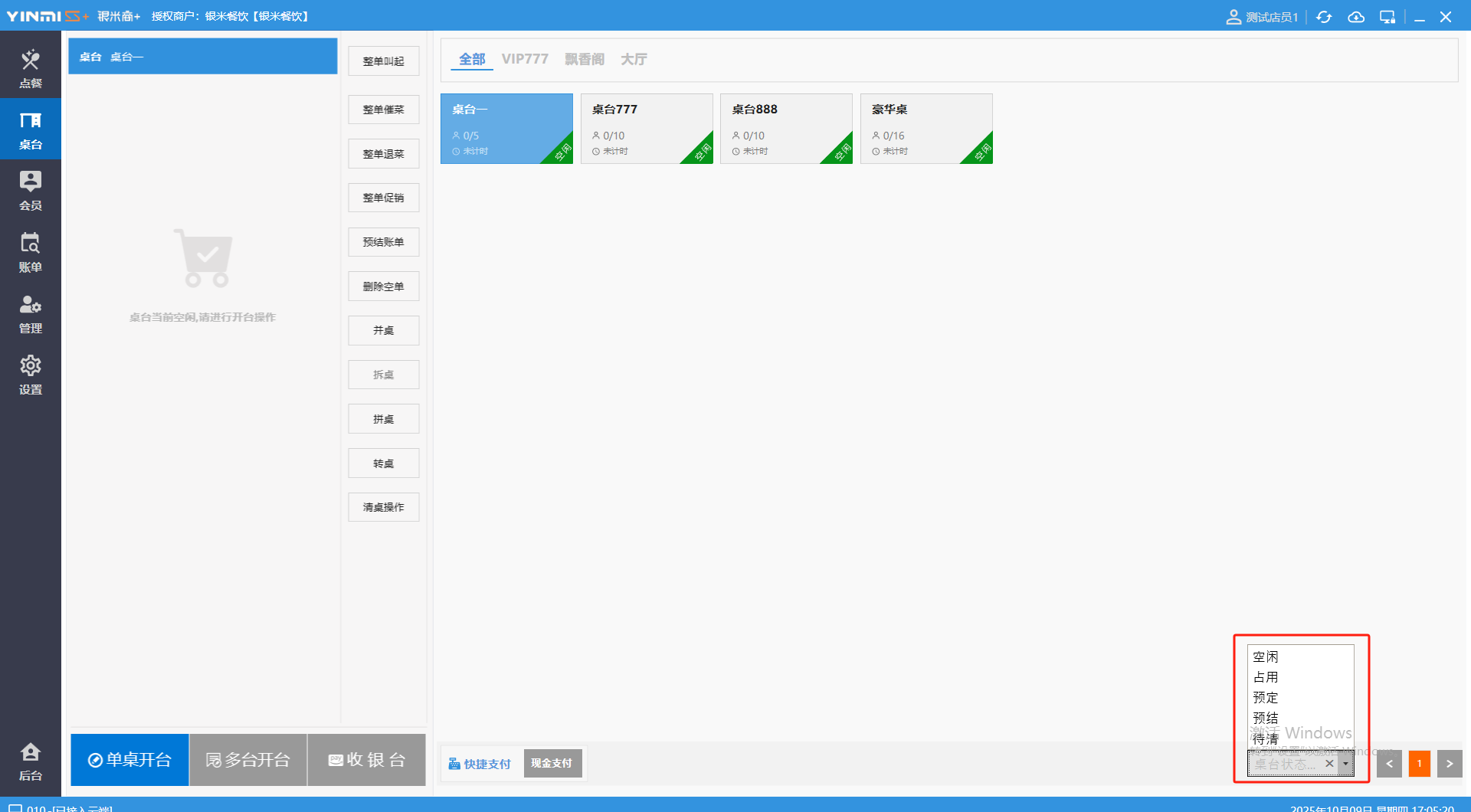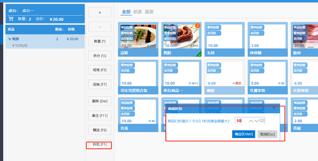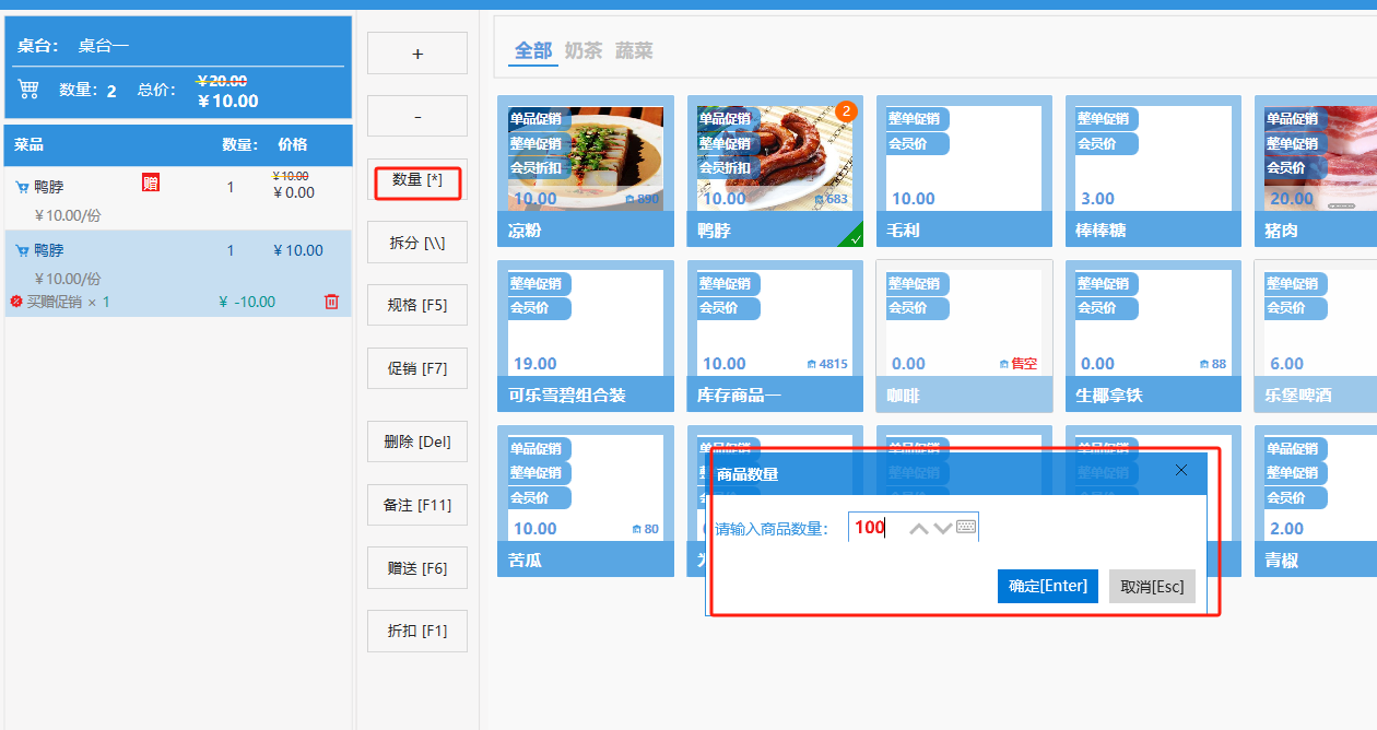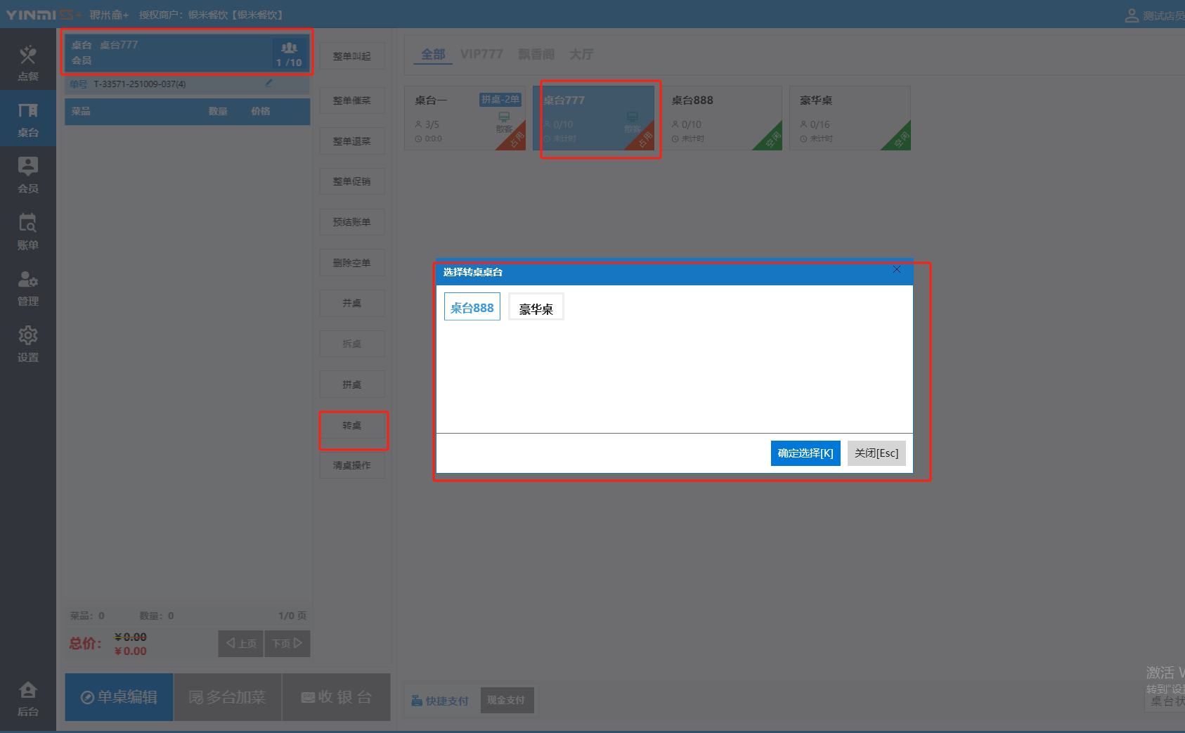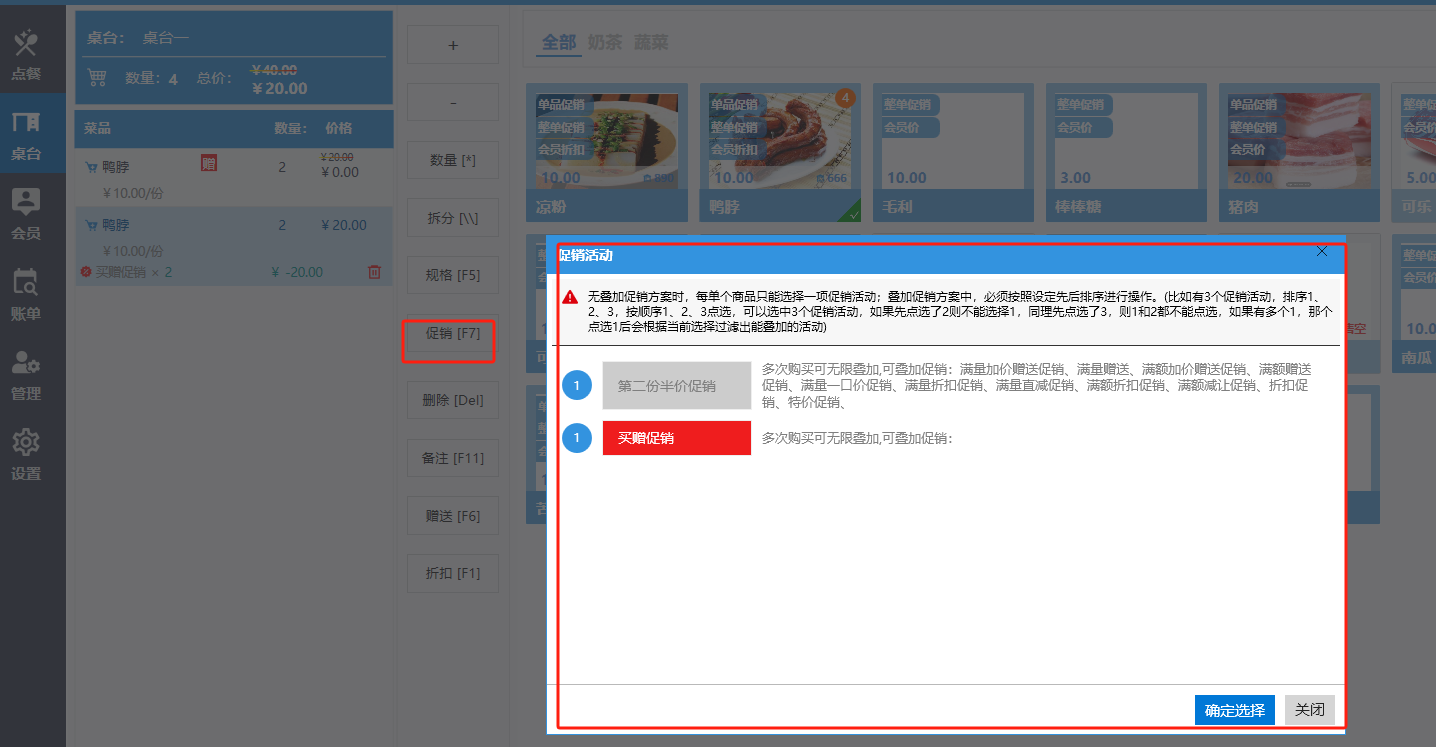 **桌台界面** 桌台:又称之为中餐模式操作界面。用于桌位的开桌、点菜用餐,将餐厅的物理空间和用餐流程数字化,需先在后台-【店铺机构】-【门店桌位】中添加设置好桌位名称、用餐人数,前台下传好数据方可使用。包含 :开台桌台、常用功能、桌台页、开台键、结算键、快捷支付、桌台状态。 如下图所示  一、开台桌台 “开台桌台”是桌台开桌后编辑菜单,并确认菜单的界面,一个集高效录入、灵活修改、智能营销和后厨联动于一体的核心模块。包含:购物车、菜品页、常用功能、清空确认键、搜索栏、临时菜品。 如图所示  1、购物车 购物车是顾客购买菜品的明细展示页面。包括:桌台号、数量、总价、优惠价、菜品明细。  2、菜品页 “菜品页”可显示菜品名称,单价,库存 ,促销活动,会员活动以及购买的数量。可以按分类点菜。 如图所示  3、常用功能 常用功能是为收银员快捷对商品订单进行编辑的常用功能汇总。包含有:加减、数量、规格、促销、删除、备注、赠送、折扣。  A、加减是快捷对菜品数量进行增加或者减少的按钮。如图所示  B、数量是快捷对菜品数量进行设定的按钮。如图所示  C、拆分是快捷对菜品的数量进行拆分的按钮。如图所示  D、规格是快捷编辑菜品的数量和单位的按钮。如图所示  E、促销是快捷对菜品添加、删除或者修改促销活动的按钮。 如图所示  点击菜品促销的红色按钮也可以快捷删除该促销活动。如图所示  F、删除是快捷对菜品进行删除的按钮。如图所示  G、备注是快捷对菜品的特殊要求进行标注。如图所示  H、赠送是快捷对菜品进行免费赠送的按钮。如需取消赠送,再次点击赠送即可 。如图所示  I、折扣是快捷对菜品进行打折优惠的按钮。如图所示  4、清空确认键 “清空确认键”是对编辑好的菜品进行最后确认的操作。包含:清空菜品、确认菜品,返回桌台。 如图所示  A、清空菜品是对编辑好的菜品全部一键删除,方便重新编辑菜品。如图所示  B、确认菜品是对编辑好的菜品进行最后确认。如图所示  如果确认菜品后,需要重新编辑点击“单桌编辑”即可。如图所示  C、返回桌台是直接返回桌台页面,编辑好的菜品都不会保留。如图所示  5、搜索栏 搜索栏是为了快速定位并找到目标菜品,将其添加到订单中,极大提升收银效率,尤其是在无法扫码或记不清条码时。点击搜索栏,输入菜品的条码、名称、拼音码,点击确认即可 。如图所示  如需要删除已搜索菜品,点击“清除筛选条件”即可完成。如图所示  6、临时菜品 点击“添加临时菜品”,可添加临时菜品名称、价格,商品页可出现该商品进行售卖,售卖结束点击该菜品右上角的“X“即可删除该菜品。 如图所示   二,常用功能 “常用功能”是桌台的日常运营中的常见需求快捷处理功能。包含:整单叫起、整单催菜、整单退菜、整单促销、预结账单、删除空单、并桌、拆桌、拼桌、转桌、清桌。 如图所示  1、整单叫起 “整单叫起”就是把全部待叫的菜品进行厨打,通知厨房可以出菜。 如图所示  2、整单催菜 “整单催菜”是再次把整单的菜品再次厨打,催促厨房加快菜的出品。 如图所示  3、整单退菜 “整单退菜”是对当前桌台进行整单退菜,删除单据并把桌台状态改为空闲状态。包含:退还库存和报损。 如图所示  4、整单促销 “整单促销”是对当前桌菜品进行整单促销。 如图所示  5、预结账单 “预结账单”是对当前桌台打印预结账单并把桌位的改预结状态。 如图所示  6、删除空单 “删除空单”是把当前已开台并没有点餐的桌位状态,改为空闲。 如图所示  7、并桌 “并桌”是两桌或两桌以上的桌台合并在同一个桌台上,可以统一点餐、统一结账。并桌的桌台,可以选择单台加菜或者是多台加菜;结账时,多可以张已经开的台一起结算,也可以单独结账。 如图所示  8、拆桌 “拆桌”是对处于并桌状态的桌台进行拆桌。在主台上进行拆桌时,会将所有的桌台全部拆桌,取消并桌的状态;在并台上进行拆桌时,会对当前桌台拆桌。 如图所示  9、拼桌 “拼桌”是两桌的客人合并坐在同一个餐桌上,分开点菜,分开结算。 如图所示  10、转桌 “转桌”是把当前桌台的菜品转到别的桌台上,并清空当前桌位状态。 如图所示  11、清桌 “清桌”是并桌的桌台结算后,当前桌位改为“待清”状态,清桌功能就是等服务员清理后,把状态改为“空闲”状态。 如图所示  三、桌台页 “桌台页”是整个桌台状态的展示页面。包含:全部、空闲、占用、预结、待清。 如图所示  四、开台键 “桌台开台”就是“为新客人创建消费档案,开始记账”。是所有后续操作(点菜、加菜、结账等)的基础前提,相当于餐厅接待流程的“启动键”。添加:人数、促销员、会员、备注。点击“确认订单”即可。 如图所示  1、设置就餐人数是根据桌台的接待人数范围添加就餐的人数。如图所示  2、设置促销员是根据桌台要求添加促销员。如无需促销员,点击“清除”即可。如图所示  3、设置会员是根据要求添加会员信息。如无需会员,点击“清除”即可。**注意:选择是否使用单品会员价。** 如图所示  4、备注是根据顾客需要添加注意事项,如图所示  五、结算键 结算键是作为收银流程的最终确认和付款执行界面,完成从商品清单到资金收讫的最终转换。包含有:支付方式、