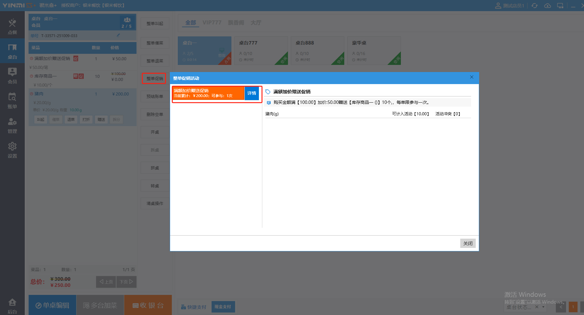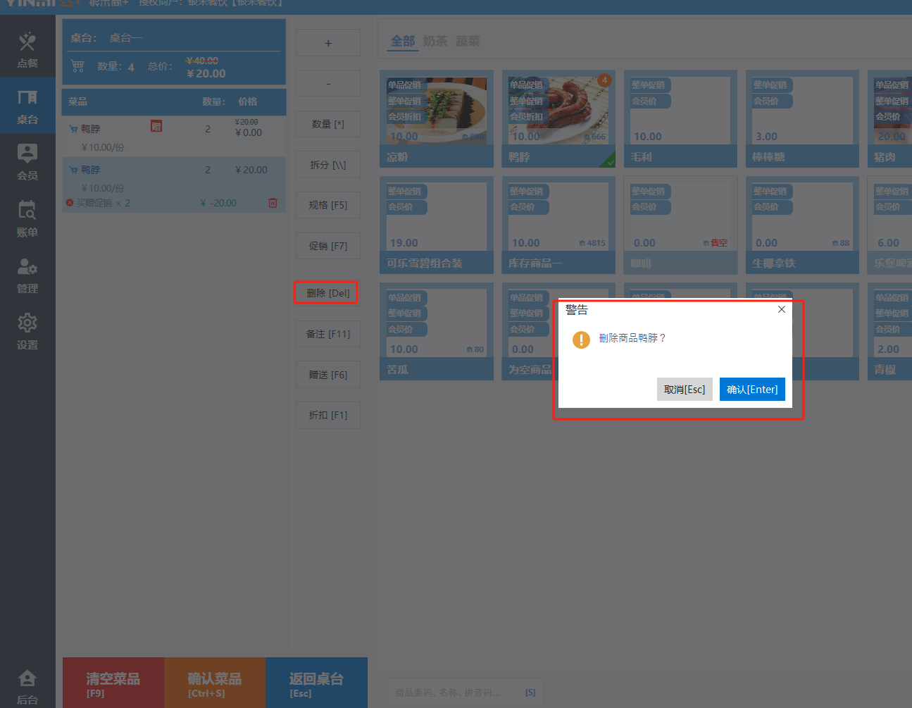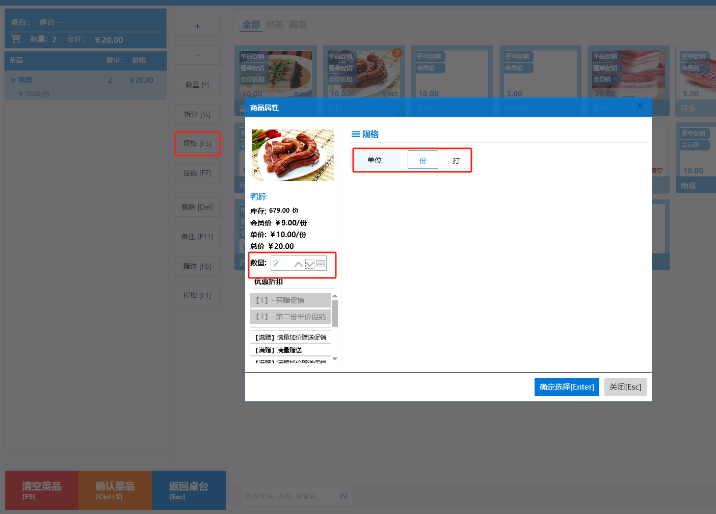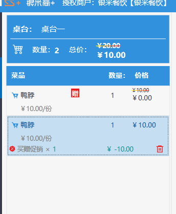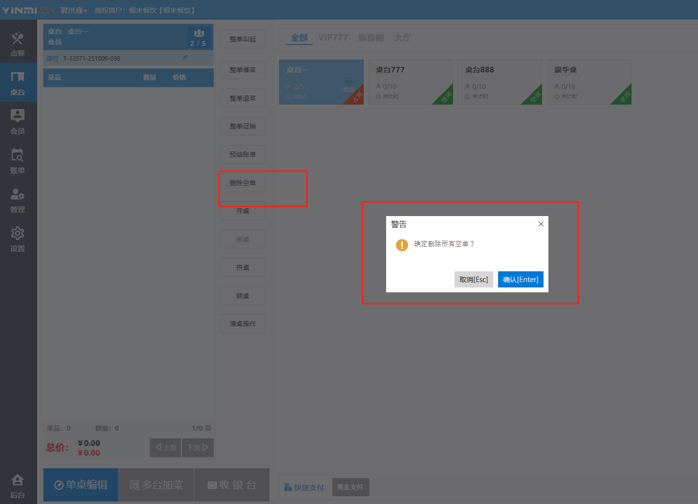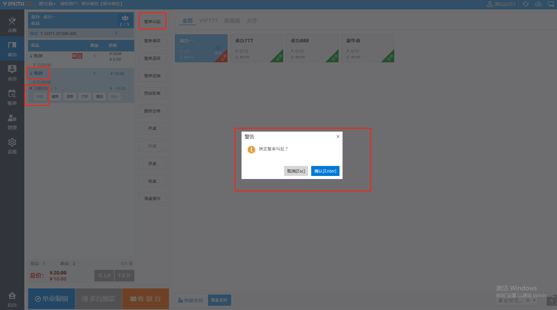 **桌台界面** 桌台:又称之为中餐模式操作界面。用于桌位的开桌、点菜用餐,将餐厅的物理空间和用餐流程数字化,需先在后台-【店铺机构】-【门店桌位】中添加设置好桌位名称、用餐人数,前台下传好数据方可使用。包含 :开台桌台、常用功能、桌台页、开台键、结算键、快捷支付、桌台状态。 如下图所示  一、开台桌台 “开台桌台”是桌台开桌后编辑菜单,并确认菜单的界面,一个集高效录入、灵活修改、智能营销和后厨联动于一体的核心模块。包含:购物车、菜品页、常用功能、清空确认键、搜索栏、临时菜品。 如图所示  1、购物车 购物车是顾客购买菜品的明细展示页面。包括:桌台号、数量、总价、优惠价、菜品明细。  2、菜品页 “菜品页”可显示菜品名称,单价,库存 ,促销活动,会员活动以及购买的数量。可以按分类点菜。 如图所示  3、常用功能 常用功能是为收银员快捷对商品订单进行编辑的常用功能汇总。包含有:加减、数量、规格、促销、删除、备注、赠送、折扣。  A、加减是快捷对菜品数量进行增加或者减少的按钮。如图所示  B、数量是快捷对菜品数量进行设定的按钮。如图所示  C、拆分是快捷对菜品的数量进行拆分的按钮。如图所示  D、规格是快捷编辑菜品的数量和单位的按钮。如图所示  E、促销是快捷对菜品添加、删除或者修改促销活动的按钮。 如图所示  点击菜品促销的红色按钮也可以快捷删除该促销活动。如图所示  F、删除是快捷对菜品进行删除的按钮。如图所示  G、备注是快捷对菜品的特殊要求进行标注。如图所示  H、赠送是快捷对菜品进行免费赠送的按钮。如需取消赠送,再次点击赠送即可 。如图所示  I、折扣是快捷对菜品进行打折优惠的按钮。如图所示  4、清空确认键 “清空确认键”是对编辑好的菜品进行最后确认的操作。包含:清空菜品、确认菜品,返回桌台。 如图所示  A、清空菜品是对编辑好的菜品全部一键删除,方便重新编辑菜品。如图所示  B、确认菜品是对编辑好的菜品进行最后确认。如图所示  如果确认菜品后,需要重新编辑点击“单桌编辑”即可。如图所示  C、返回桌台是直接返回桌台页面,编辑好的菜品都不会保留。如图所示  5、搜索栏 搜索栏是为了快速定位并找到目标菜品,将其添加到订单中,极大提升收银效率,尤其是在无法扫码或记不清条码时。点击搜索栏,输入菜品的条码、名称、拼音码,点击确认即可 。如图所示  如需要删除已搜索菜品,点击“清除筛选条件”即可完成。如图所示  6、临时菜品 点击“添加临时菜品”,可添加临时菜品名称、价格,商品页可出现该商品进行售卖,售卖结束点击该菜品右上角的“X“即可删除该菜品。 如图所示   二,常用功能 “常用功能”是桌台的日常运营中的常见需求快捷处理功能。包含:整单叫起、整单催菜、整单退菜、整单促销、预结账单、删除空单、并桌、拆桌、拼桌、转桌、清桌。 如图所示  1、整单叫起 “整单叫起”就是把全部待叫的菜品进行厨打,通知厨房可以出菜。 如图所示  2、整单催菜 “整单催菜”是再次把整单的菜品再次厨打,催促厨房加快菜的出品。 如图所示  3、整单退菜 “整单退菜”是对当前桌台进行整单退菜,删除单据并把桌台状态改为空闲状态。包含:退还库存和报损。 如图所示  4、整单促销 “整单促销”是对当前桌菜品进行整单促销。 如图所示  5、预结账单 “预结账单”是对当前桌台打印预结账单并把桌位的改预结状态。 如图所示  6、删除空单 “删除空单”是把当前已开台并没有点餐的桌位状态,改为空闲。 如图所示  7、并桌 “并桌”是两桌或两桌以上的桌台合并在同一个桌台上,可以统一点餐、统一结账。并桌的桌台,可以选择单台加菜或者是多台加菜;结账时,多可以张已经开的台一起结算,也可以单独结账。 如图所示  8、拆桌 “拆桌”是对处于并桌状态的桌台进行拆桌。在主台上进行拆桌时,会将所有的桌台全部拆桌,取消并桌的状态;在并台上进行拆桌时,会对当前桌台拆桌。 如图所示  9、拼桌 “拼桌”是两桌的客人合并坐在同一个餐桌上,分开点菜,分开结算。 如图所示  10、转桌 “转桌”是把当前桌台的菜品转到别的桌台上,并清空当前桌位状态。 如图所示  11、清桌 “清桌”是并桌的桌台结算后,当前桌位改为“待清”状态,清桌功能就是等服务员清理后,把状态改为“空闲”状态。 如图所示  三、桌台页 “桌台页”是整个桌台状态的展示页面。包含:全部、空闲、占用、预结、待清。 如图所示  四、开台键 “桌台开台”就是“为新客人创建消费档案,开始记账”。是所有后续操作(点菜、加菜、结账等)的基础前提,相当于餐厅接待流程的“启动键”。添加:人数、促销员、会员、备注。点击“确认订单”即可。 如图所示  1、设置就餐人数是根据桌台的接待人数范围添加就餐的人数。如图所示  2、设置促销员是根据桌台要求添加促销员。如无需促销员,点击“清除”即可。如图所示  3、设置会员是根据要求添加会员信息。如无需会员,点击“清除”即可。**注意:选择是否使用单品会员价。** 如图所示  4、备注是根据顾客需要添加注意事项,如图所示  五、结算键 结算键是作为收银流程的最终确认和付款执行界面,完成从商品清单到资金收讫的最终转换。包含有:支付方式、